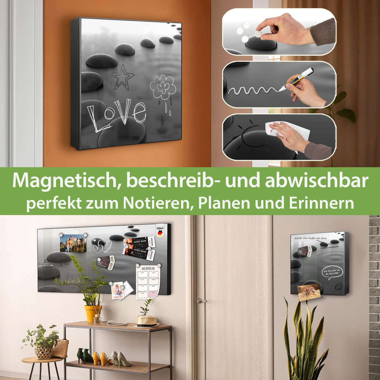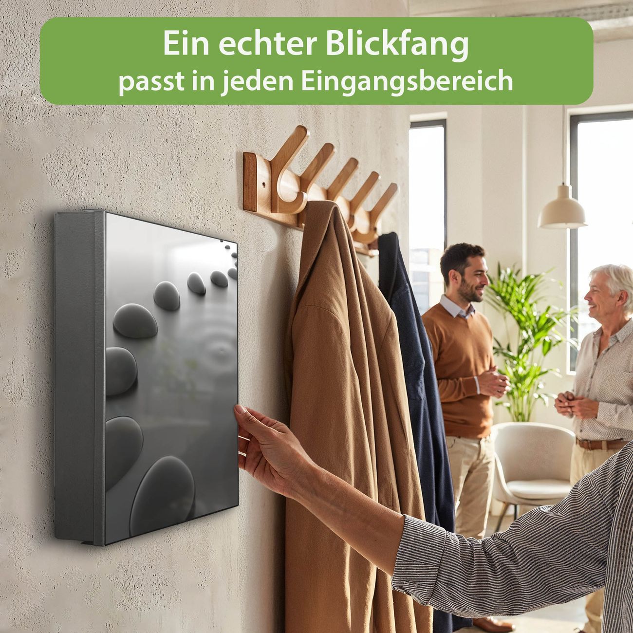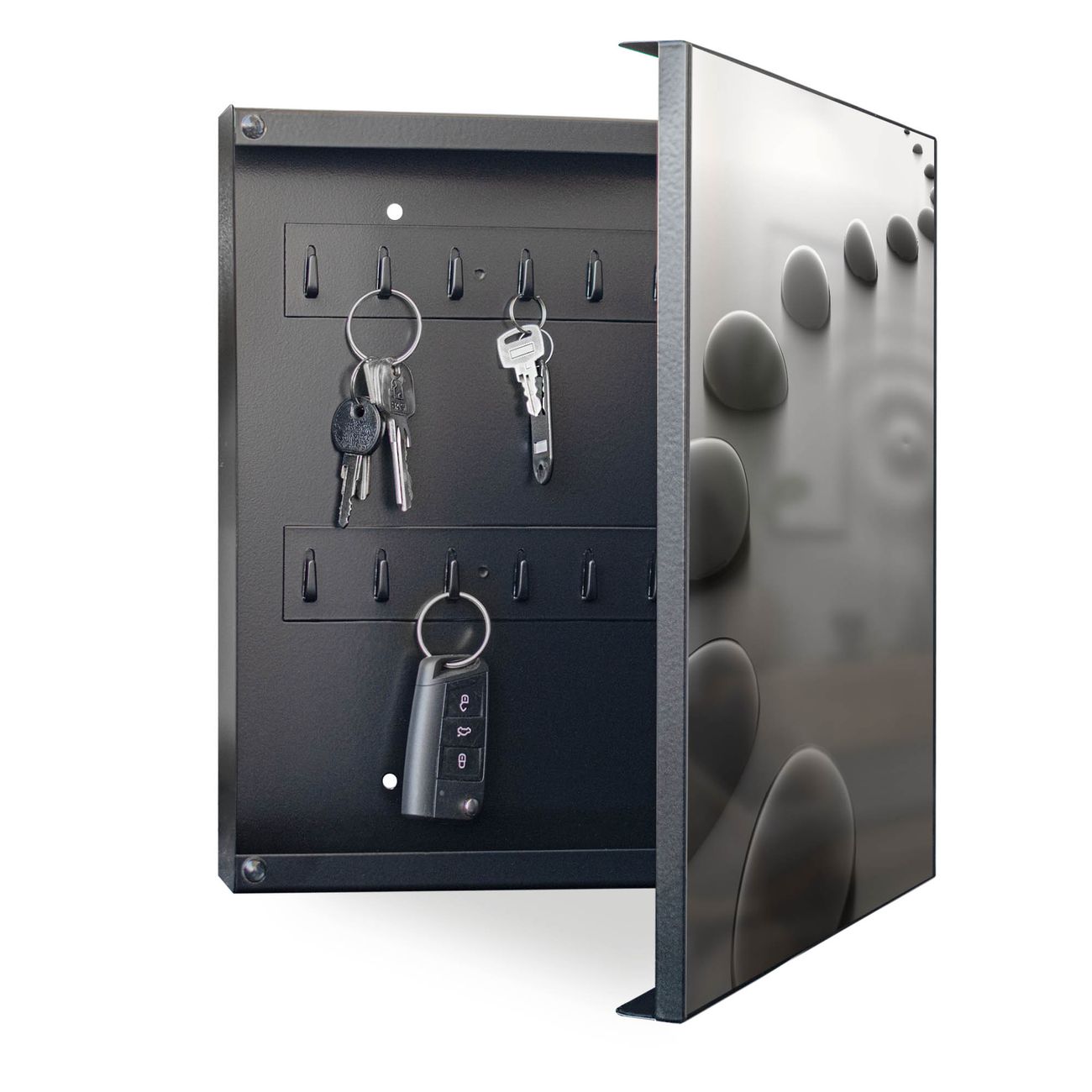 Bringe Ordnung und Eleganz in deinen Eingangsbereich mit dem banjado Schlüsselkasten Motiv Motiv Schwarze Steine. Die moderne Schlüsselbox kombiniert funktionales Design mit hochwertiger Verarbeitung und wird so zu einem echten Hingucker in Flur, Büro oder Ferienwohnung. ✅ Stilvolle Schlüsselaufbewahrung mit Motiv Motiv Schwarze Steine Der Design-Schlüsselkasten Motiv Motiv Schwarze Steine bietet Platz für bis zu 32 Schlüssel, die auf 4 stabilen Reihen mit je 8 Haken übersichtlich verstaut werden. Mit seinen kompakten Maßen von 30 x 30 x 5 cm passt die Schlüsselbox perfekt auch in kleinere Räume. Der schwarz lackierte Stahlkorpus mit rechts angeschlagenem Türscharnier harmoniert mit gedruckten Folie auf der Front und fügt sich nahtlos in jedes Wohnambiente ein. Ob als Schlüsselorganizer für Zuhause oder als praktische Lösung für Büros, Praxen und Gewerbe, der banjado Schlüsselkasten sorgt für Ordnung und Übersicht. Dank der magnetischen, mit Kreidestiften beschreibbaren Folie auf der Front kannst du Notizen anheften oder Termine direkt auf der Oberfläche festhalten. Die Schlüsselbox Motiv Motiv Schwarze Steine zur Wandmontage wird inklusive Befestigungsmaterial geliefert und ist schnell angebracht. So hast du deine Schlüssel jederzeit griffbereit und zugleich stilvoll verstaut. Mit diesem banjado Schlüsselkasten Motiv Motiv Schwarze Steine kombinierst du praktische Aufbewahrung mit stilvollem Wohndesign. Ob privat oder geschäftlich, die Schlüsselbox sorgt für mehr Ordnung, Übersicht und ein wohnliches Ambiente.Vorteile im Überblick