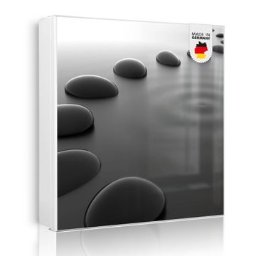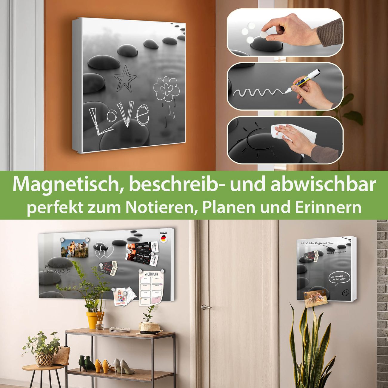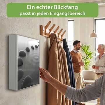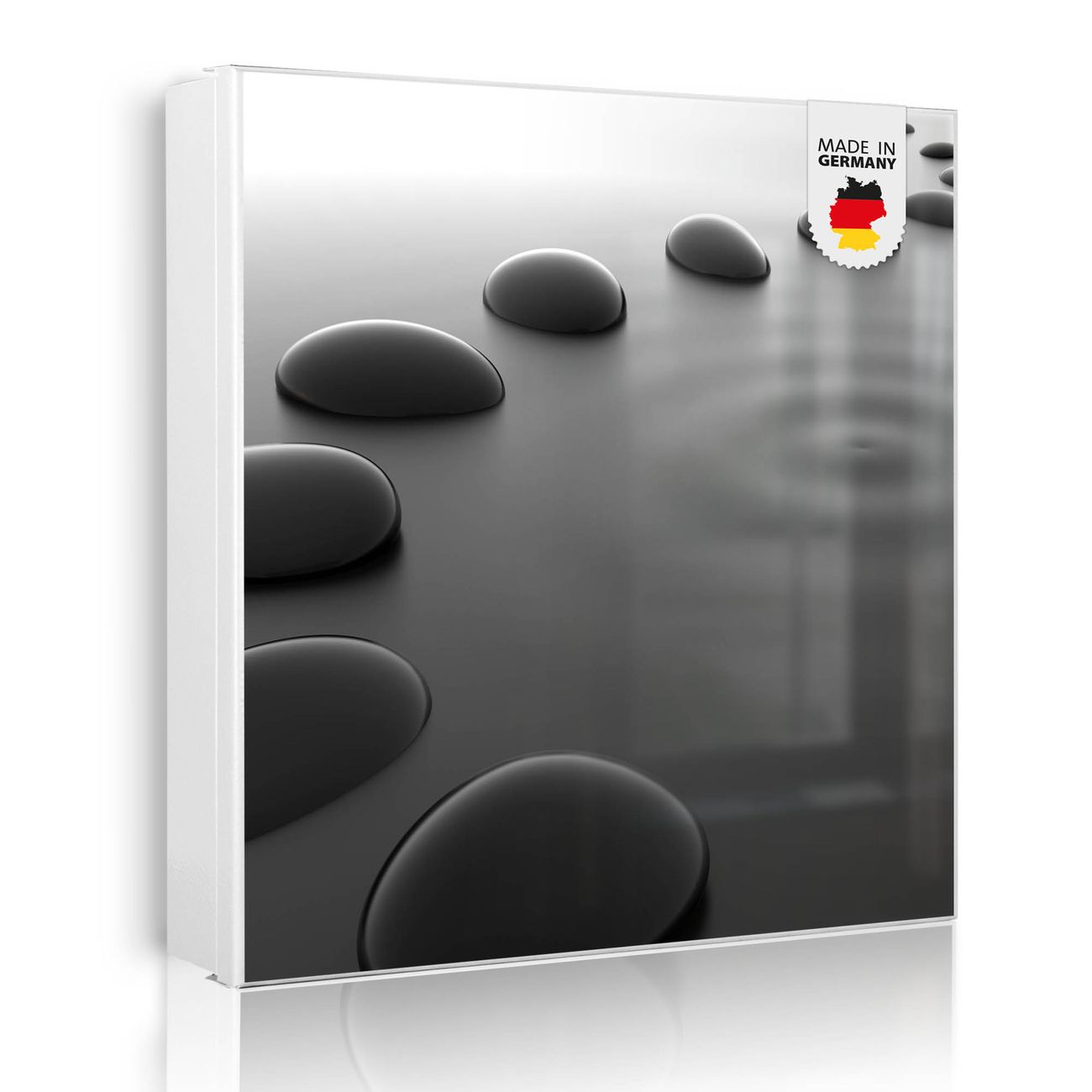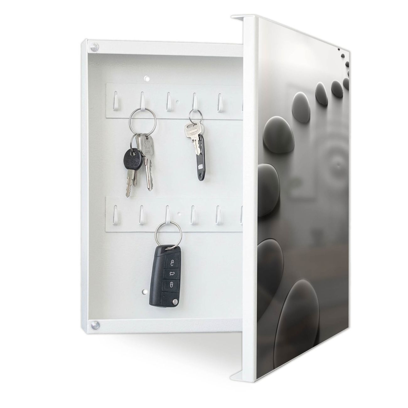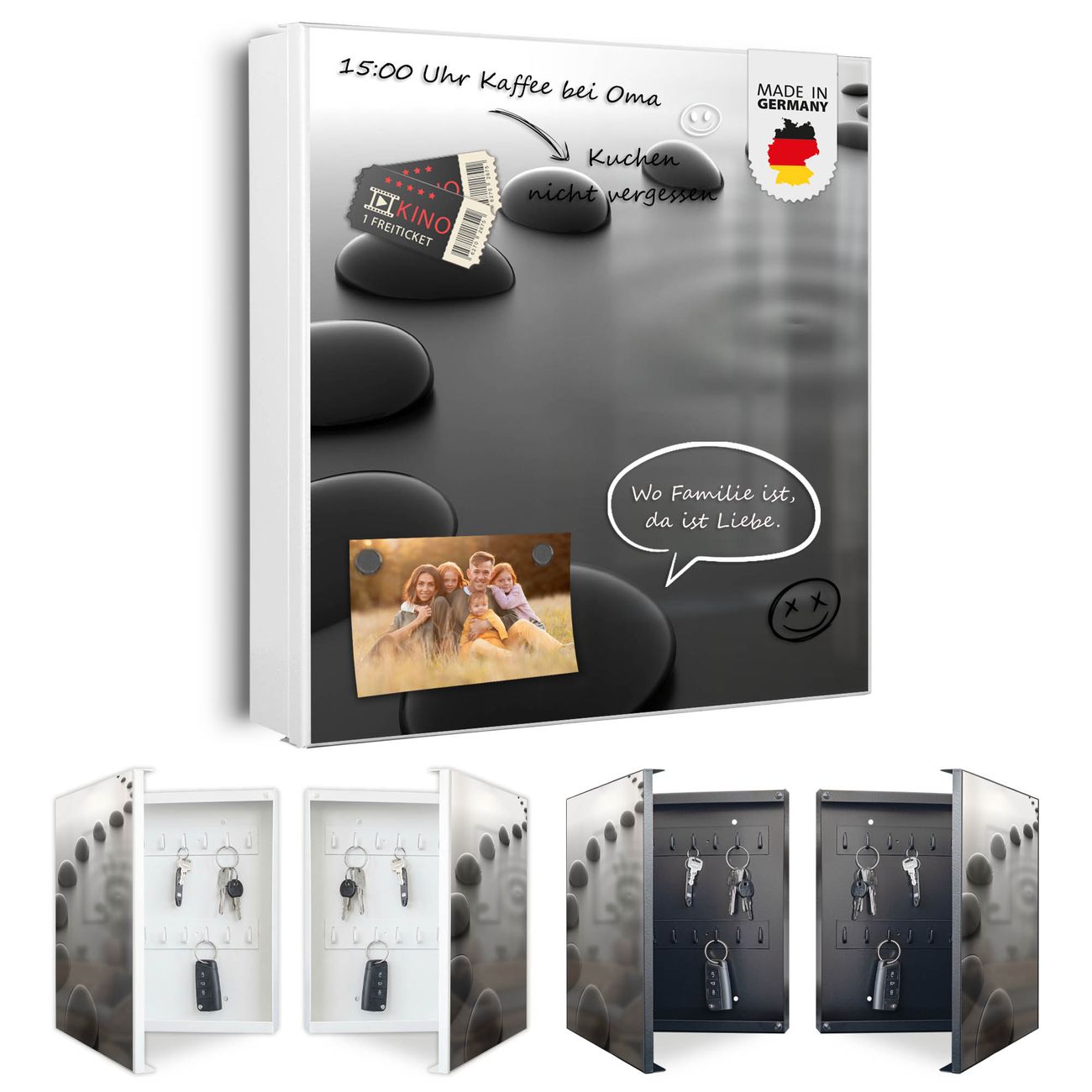 Bringe Ordnung und Eleganz in deinen Eingangsbereich mit dem banjado Schlüsselkasten Motiv Motiv Schwarze Steine. Die moderne Schlüsselbox kombiniert funktionales Design mit hochwertiger Verarbeitung und wird so zu einem echten Hingucker in Flur, Büro oder Ferienwohnung. ✅ Stilvolle Schlüsselaufbewahrung mit Motiv Motiv Schwarze Steine Der Design-Schlüsselkasten Motiv Motiv Schwarze Steine bietet Platz für bis zu 32 Schlüssel, die auf 4 stabilen Reihen mit je 8 Haken übersichtlich verstaut werden. Mit seinen kompakten Maßen von 30 x 30 x 5 cm passt die Schlüsselbox perfekt auch in kleinere Räume. Der weiß lackierte Stahlkorpus mit rechts angeschlagenem Türscharnier harmoniert mit gedruckten Folie auf der Front und fügt sich nahtlos in jedes Wohnambiente ein. Ob als Schlüsselorganizer für Zuhause oder als praktische Lösung für Büros, Praxen und Gewerbe, der banjado Schlüsselkasten sorgt für Ordnung und Übersicht. Dank der magnetischen, mit Kreidestiften beschreibbaren Folie auf der Front kannst du Notizen anheften oder Termine direkt auf der Oberfläche festhalten. Die Schlüsselbox Motiv Motiv Schwarze Steine zur Wandmontage wird inklusive Befestigungsmaterial geliefert und ist schnell angebracht. So hast du deine Schlüssel jederzeit griffbereit und zugleich stilvoll verstaut. Mit diesem banjado Schlüsselkasten Motiv Motiv Schwarze Steine kombinierst du praktische Aufbewahrung mit stilvollem Wohndesign. Ob privat oder geschäftlich, die Schlüsselbox sorgt für mehr Ordnung, Übersicht und ein wohnliches Ambiente.Vorteile im Überblick