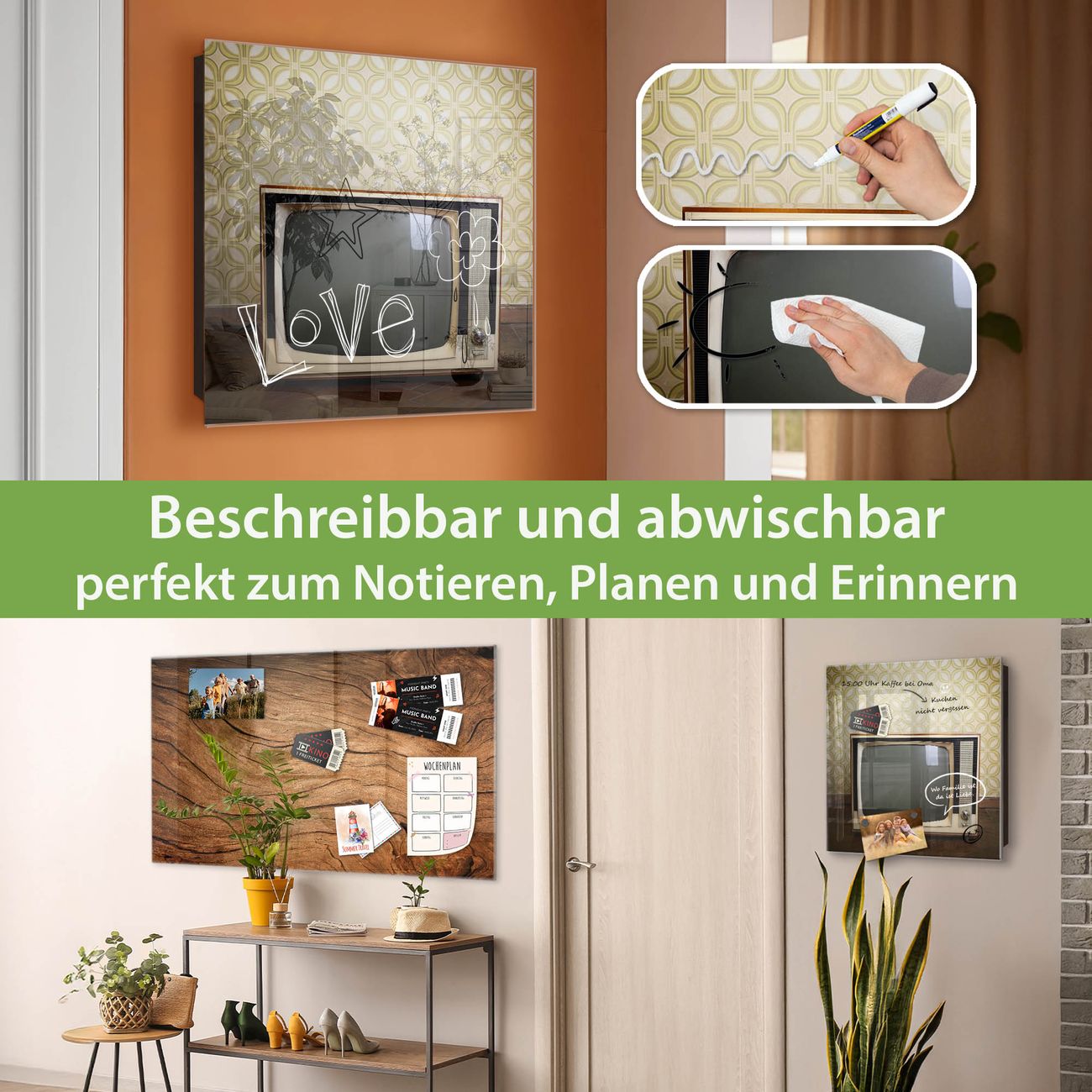 ✅ Magnetisch und mit Kreidestift beschreibbar, gehärtetes Glas, links angeschlagene TürOrdnung und Design in einem