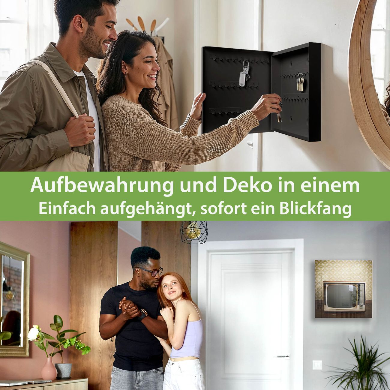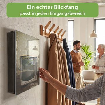 Bringe Ordnung und Eleganz in deinen Eingangsbereich mit dem banjado Schlüsselkasten Motiv Motiv Schwarzweiß TV. Die moderne Schlüsselbox kombiniert funktionales Design mit hochwertiger Verarbeitung und wird so zu einem echten Hingucker in Flur, Büro oder Ferienwohnung. ✅ Stilvolle Schlüsselaufbewahrung mit Glasfront im Motiv Motiv Schwarzweiß TV Der Design-Schlüsselkasten Motiv Motiv Schwarzweiß TV bietet Platz für bis zu 50 Schlüssel, die auf 5 stabilen Reihen mit je 10 Haken übersichtlich verstaut werden. Mit seinen kompakten Maßen von 30 x 30 x 5 cm passt die Schlüsselbox perfekt auch in kleinere Räume. Der schwarz lackierte Stahlkorpus mit rechts angeschlagenem Türscharnier harmoniert mit der Glasfront und fügt sich nahtlos in jedes Wohnambiente ein. Ob als Schlüsselorganizer für Zuhause oder als praktische Lösung für Büros, Praxen und Gewerbe, der banjado Schlüsselkasten sorgt für Ordnung und Übersicht. Dank der magnetischen, mit Kreidestiften beschreibbaren Glasfront kannst du Notizen anheften oder Termine direkt auf der Oberfläche festhalten. Die Schlüsselbox Motiv Motiv Schwarzweiß TV zur Wandmontage wird inklusive Befestigungsmaterial geliefert und ist schnell angebracht. So hast du deine Schlüssel jederzeit griffbereit und zugleich stilvoll verstaut. Mit diesem banjado Schlüsselkasten Motiv Motiv Schwarzweiß TV kombinierst du praktische Aufbewahrung mit stilvollem Wohndesign. Ob privat oder geschäftlich, die Schlüsselbox sorgt für mehr Ordnung, Übersicht und ein wohnliches Ambiente.Vorteile im Überblick
