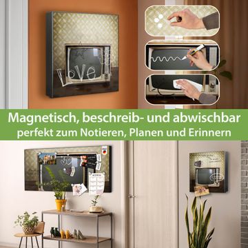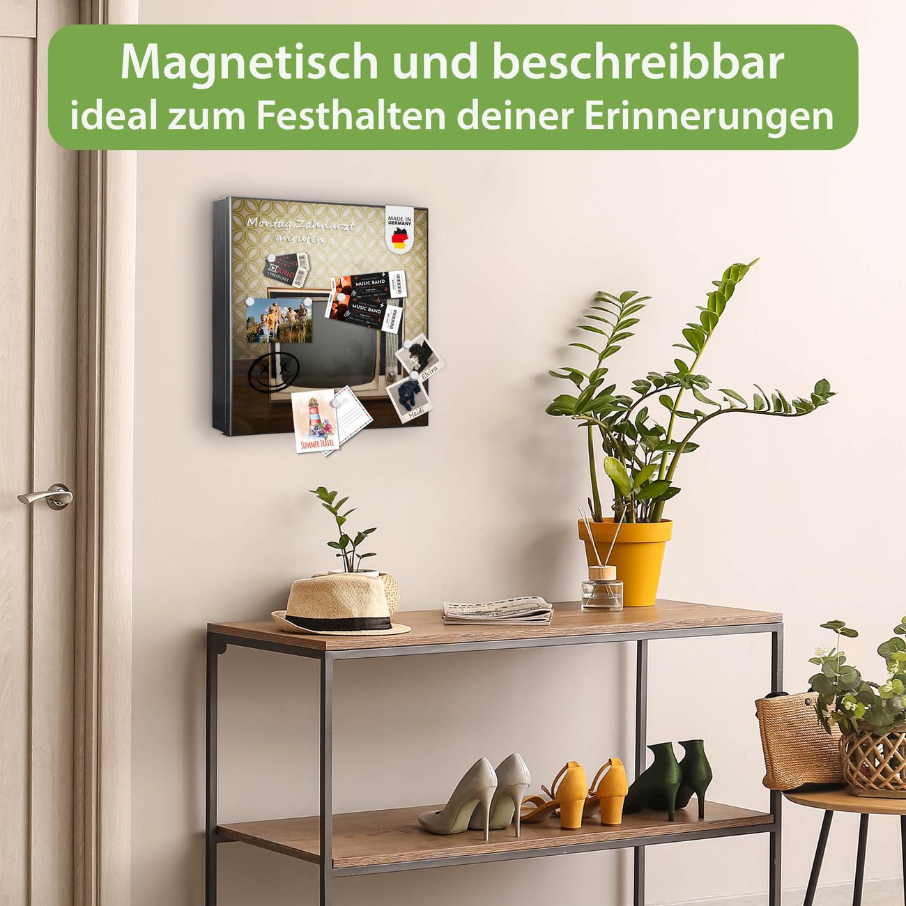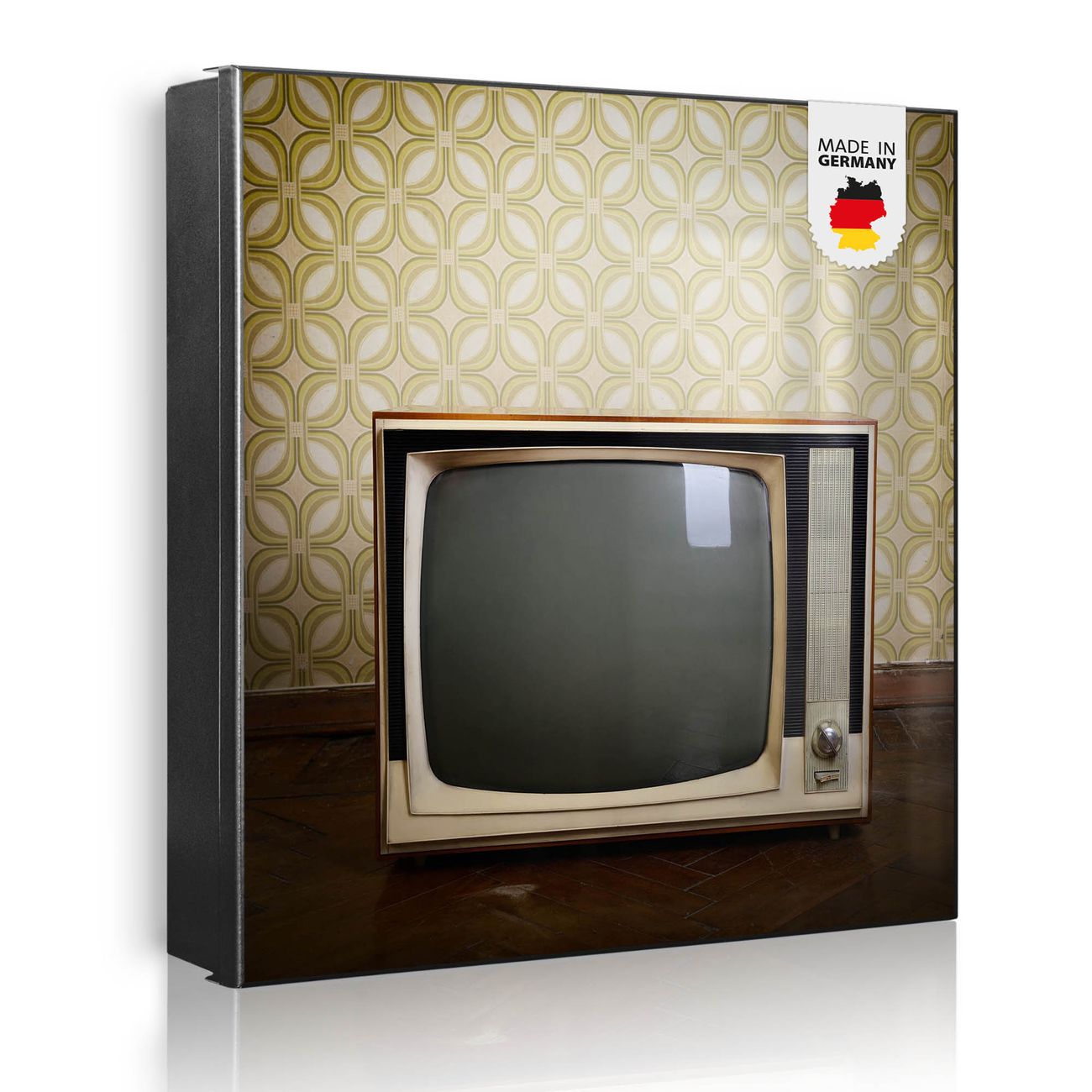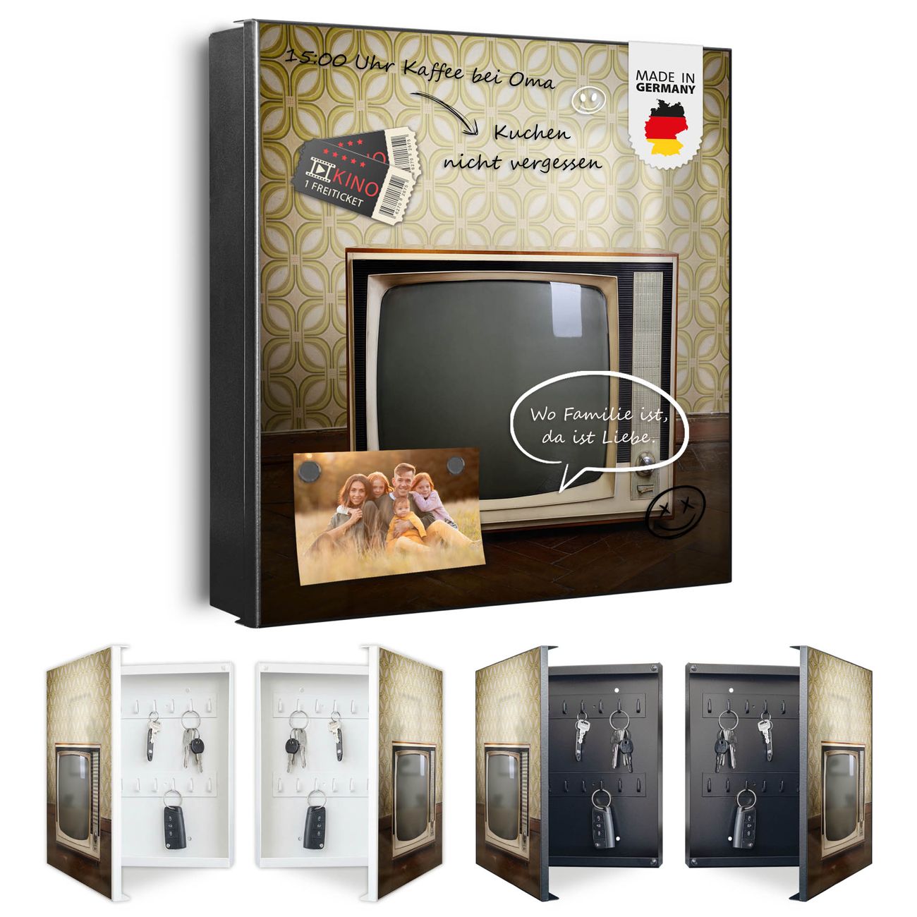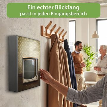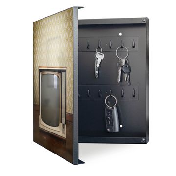 Bringe Ordnung und Eleganz in deinen Eingangsbereich mit dem banjado Schlüsselkasten Motiv Motiv Schwarzweiß TV. Die moderne Schlüsselbox kombiniert funktionales Design mit hochwertiger Verarbeitung und wird so zu einem echten Hingucker in Flur, Büro oder Ferienwohnung. ✅ Stilvolle Schlüsselaufbewahrung mit Motiv Motiv Schwarzweiß TV Der Design-Schlüsselkasten Motiv Motiv Schwarzweiß TV bietet Platz für bis zu 32 Schlüssel, die auf 4 stabilen Reihen mit je 8 Haken übersichtlich verstaut werden. Mit seinen kompakten Maßen von 30 x 30 x 5 cm passt die Schlüsselbox perfekt auch in kleinere Räume. Der schwarz lackierte Stahlkorpus mit links angeschlagenem Türscharnier harmoniert mit gedruckten Folie auf der Front und fügt sich nahtlos in jedes Wohnambiente ein. Ob als Schlüsselorganizer für Zuhause oder als praktische Lösung für Büros, Praxen und Gewerbe, der banjado Schlüsselkasten sorgt für Ordnung und Übersicht. Dank der magnetischen, mit Kreidestiften beschreibbaren Folie auf der Front kannst du Notizen anheften oder Termine direkt auf der Oberfläche festhalten. Die Schlüsselbox Motiv Motiv Schwarzweiß TV zur Wandmontage wird inklusive Befestigungsmaterial geliefert und ist schnell angebracht. So hast du deine Schlüssel jederzeit griffbereit und zugleich stilvoll verstaut. Mit diesem banjado Schlüsselkasten Motiv Motiv Schwarzweiß TV kombinierst du praktische Aufbewahrung mit stilvollem Wohndesign. Ob privat oder geschäftlich, die Schlüsselbox sorgt für mehr Ordnung, Übersicht und ein wohnliches Ambiente.Vorteile im Überblick