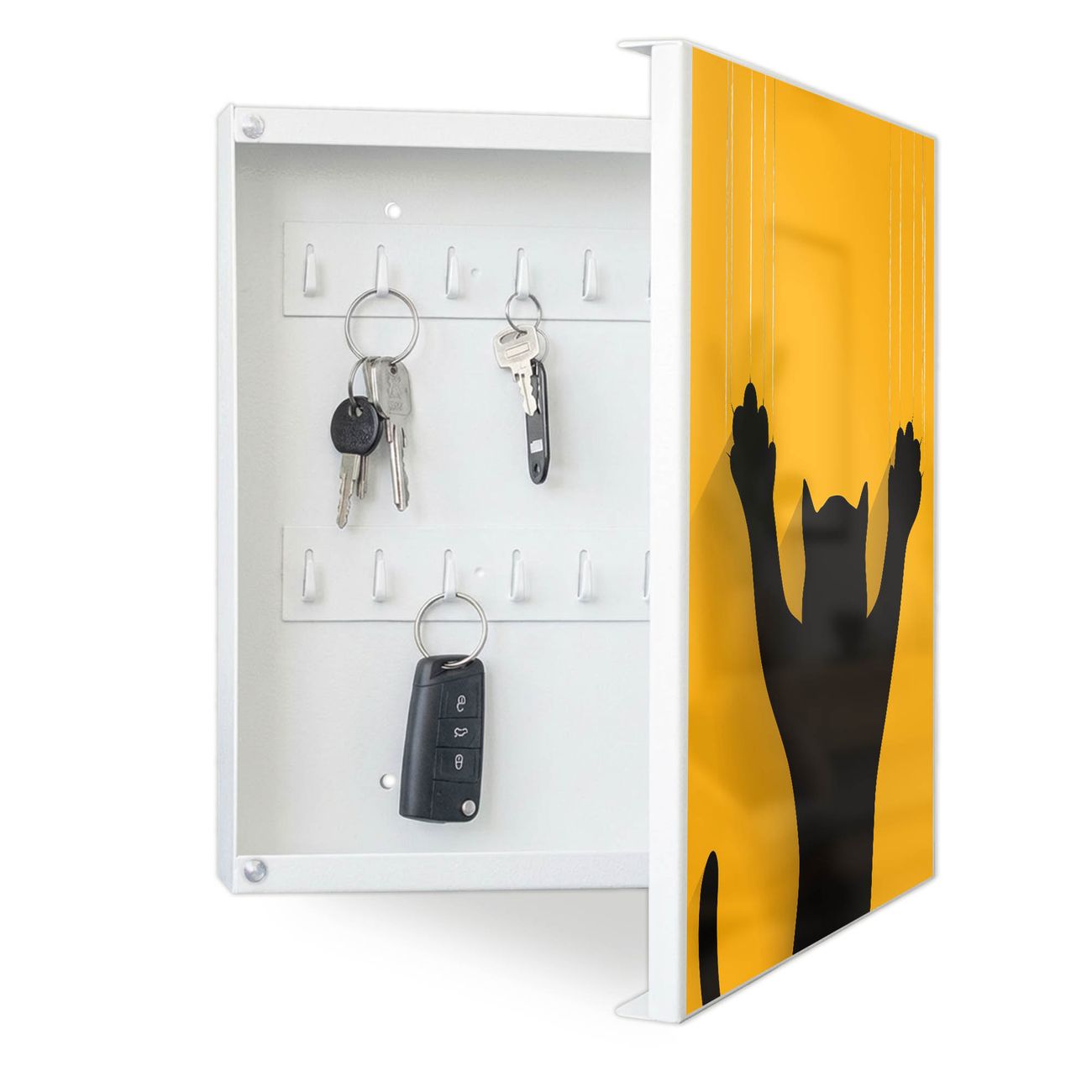 Bringe Ordnung und Eleganz in deinen Eingangsbereich mit dem banjado Schlüsselkasten Motiv Motiv Scratch. Die moderne Schlüsselbox kombiniert funktionales Design mit hochwertiger Verarbeitung und wird so zu einem echten Hingucker in Flur, Büro oder Ferienwohnung. ✅ Stilvolle Schlüsselaufbewahrung mit Motiv Motiv Scratch Der Design-Schlüsselkasten Motiv Motiv Scratch bietet Platz für bis zu 32 Schlüssel, die auf 4 stabilen Reihen mit je 8 Haken übersichtlich verstaut werden. Mit seinen kompakten Maßen von 30 x 30 x 5 cm passt die Schlüsselbox perfekt auch in kleinere Räume. Der weiß lackierte Stahlkorpus mit rechts angeschlagenem Türscharnier harmoniert mit gedruckten Folie auf der Front und fügt sich nahtlos in jedes Wohnambiente ein. Ob als Schlüsselorganizer für Zuhause oder als praktische Lösung für Büros, Praxen und Gewerbe, der banjado Schlüsselkasten sorgt für Ordnung und Übersicht. Dank der magnetischen, mit Kreidestiften beschreibbaren Folie auf der Front kannst du Notizen anheften oder Termine direkt auf der Oberfläche festhalten. Die Schlüsselbox Motiv Motiv Scratch zur Wandmontage wird inklusive Befestigungsmaterial geliefert und ist schnell angebracht. So hast du deine Schlüssel jederzeit griffbereit und zugleich stilvoll verstaut. Mit diesem banjado Schlüsselkasten Motiv Motiv Scratch kombinierst du praktische Aufbewahrung mit stilvollem Wohndesign. Ob privat oder geschäftlich, die Schlüsselbox sorgt für mehr Ordnung, Übersicht und ein wohnliches Ambiente.Vorteile im Überblick
