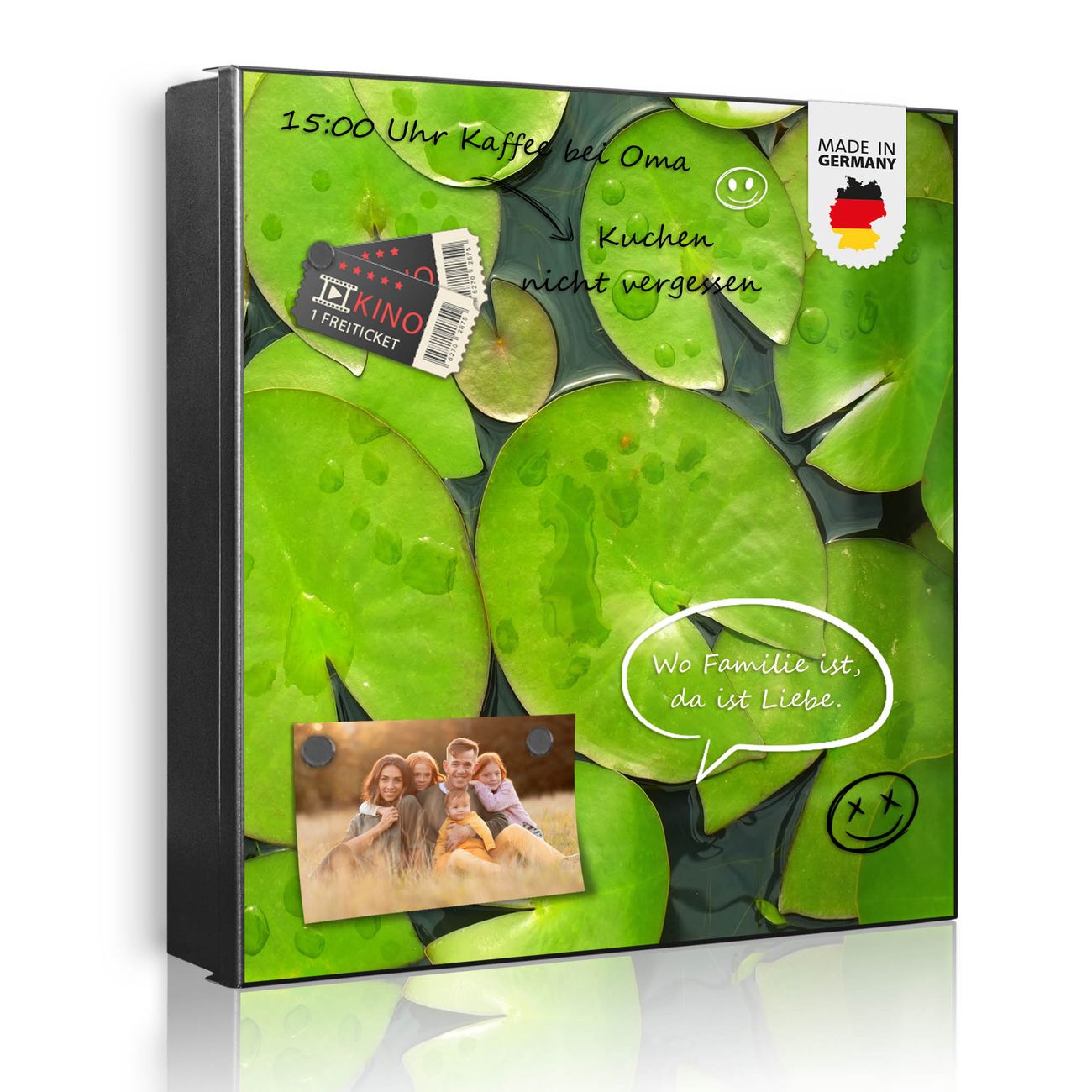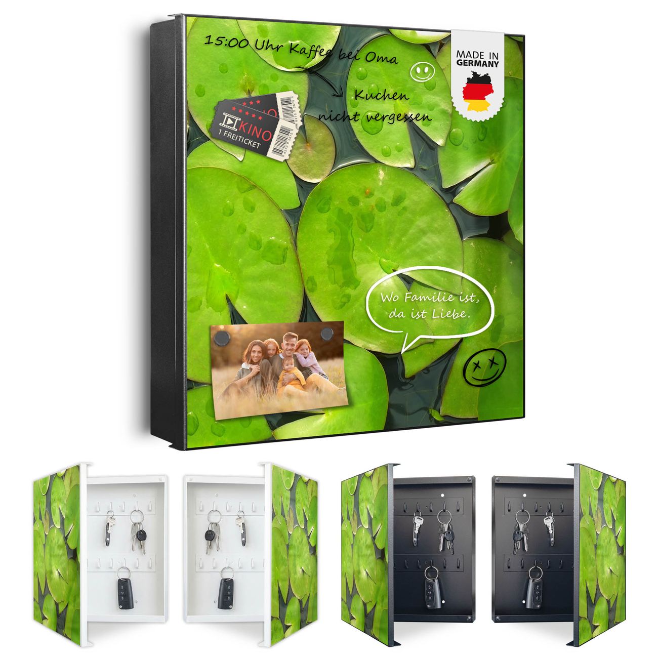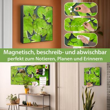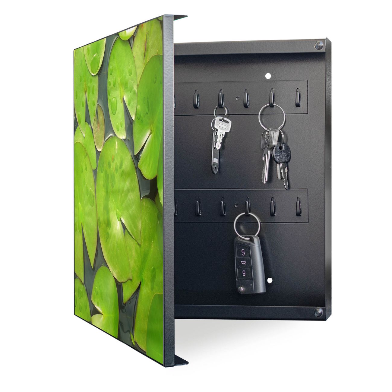 Bringe Ordnung und Eleganz in deinen Eingangsbereich mit dem banjado Schlüsselkasten Motiv Motiv Seerosenblätter. Die moderne Schlüsselbox kombiniert funktionales Design mit hochwertiger Verarbeitung und wird so zu einem echten Hingucker in Flur, Büro oder Ferienwohnung. ✅ Stilvolle Schlüsselaufbewahrung mit Motiv Motiv Seerosenblätter Der Design-Schlüsselkasten Motiv Motiv Seerosenblätter bietet Platz für bis zu 32 Schlüssel, die auf 4 stabilen Reihen mit je 8 Haken übersichtlich verstaut werden. Mit seinen kompakten Maßen von 30 x 30 x 5 cm passt die Schlüsselbox perfekt auch in kleinere Räume. Der schwarz lackierte Stahlkorpus mit links angeschlagenem Türscharnier harmoniert mit gedruckten Folie auf der Front und fügt sich nahtlos in jedes Wohnambiente ein. Ob als Schlüsselorganizer für Zuhause oder als praktische Lösung für Büros, Praxen und Gewerbe, der banjado Schlüsselkasten sorgt für Ordnung und Übersicht. Dank der magnetischen, mit Kreidestiften beschreibbaren Folie auf der Front kannst du Notizen anheften oder Termine direkt auf der Oberfläche festhalten. Die Schlüsselbox Motiv Motiv Seerosenblätter zur Wandmontage wird inklusive Befestigungsmaterial geliefert und ist schnell angebracht. So hast du deine Schlüssel jederzeit griffbereit und zugleich stilvoll verstaut. Mit diesem banjado Schlüsselkasten Motiv Motiv Seerosenblätter kombinierst du praktische Aufbewahrung mit stilvollem Wohndesign. Ob privat oder geschäftlich, die Schlüsselbox sorgt für mehr Ordnung, Übersicht und ein wohnliches Ambiente.Vorteile im Überblick