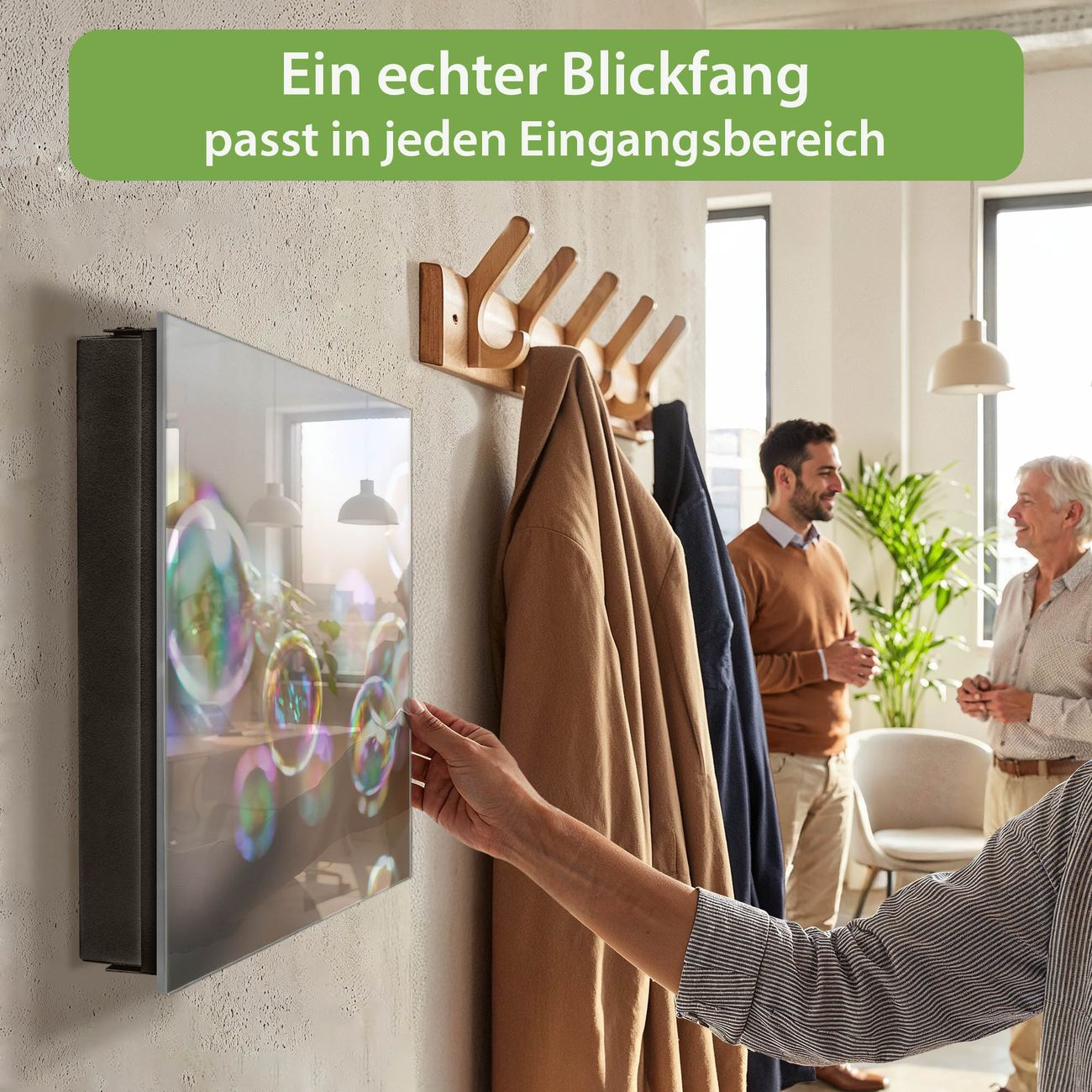 Bringe Ordnung und Eleganz in deinen Eingangsbereich mit dem banjado Schlüsselkasten Motiv Motiv Seifenblasen. Die moderne Schlüsselbox kombiniert funktionales Design mit hochwertiger Verarbeitung und wird so zu einem echten Hingucker in Flur, Büro oder Ferienwohnung. ✅ Stilvolle Schlüsselaufbewahrung mit Glasfront im Motiv Motiv Seifenblasen Der Design-Schlüsselkasten Motiv Motiv Seifenblasen bietet Platz für bis zu 50 Schlüssel, die auf 5 stabilen Reihen mit je 10 Haken übersichtlich verstaut werden. Mit seinen kompakten Maßen von 30 x 30 x 5 cm passt die Schlüsselbox perfekt auch in kleinere Räume. Der schwarz lackierte Stahlkorpus mit rechts angeschlagenem Türscharnier harmoniert mit der Glasfront und fügt sich nahtlos in jedes Wohnambiente ein. Ob als Schlüsselorganizer für Zuhause oder als praktische Lösung für Büros, Praxen und Gewerbe, der banjado Schlüsselkasten sorgt für Ordnung und Übersicht. Dank der magnetischen, mit Kreidestiften beschreibbaren Glasfront kannst du Notizen anheften oder Termine direkt auf der Oberfläche festhalten. Die Schlüsselbox Motiv Motiv Seifenblasen zur Wandmontage wird inklusive Befestigungsmaterial geliefert und ist schnell angebracht. So hast du deine Schlüssel jederzeit griffbereit und zugleich stilvoll verstaut. Mit diesem banjado Schlüsselkasten Motiv Motiv Seifenblasen kombinierst du praktische Aufbewahrung mit stilvollem Wohndesign. Ob privat oder geschäftlich, die Schlüsselbox sorgt für mehr Ordnung, Übersicht und ein wohnliches Ambiente.Vorteile im Überblick