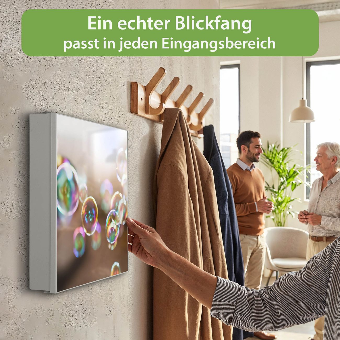 Bringe Ordnung und Eleganz in deinen Eingangsbereich mit dem banjado Schlüsselkasten Motiv Motiv Seifenblasen. Die moderne Schlüsselbox kombiniert funktionales Design mit hochwertiger Verarbeitung und wird so zu einem echten Hingucker in Flur, Büro oder Ferienwohnung. ✅ Stilvolle Schlüsselaufbewahrung mit Motiv Motiv Seifenblasen Der Design-Schlüsselkasten Motiv Motiv Seifenblasen bietet Platz für bis zu 32 Schlüssel, die auf 4 stabilen Reihen mit je 8 Haken übersichtlich verstaut werden. Mit seinen kompakten Maßen von 30 x 30 x 5 cm passt die Schlüsselbox perfekt auch in kleinere Räume. Der weiß lackierte Stahlkorpus mit rechts angeschlagenem Türscharnier harmoniert mit gedruckten Folie auf der Front und fügt sich nahtlos in jedes Wohnambiente ein. Ob als Schlüsselorganizer für Zuhause oder als praktische Lösung für Büros, Praxen und Gewerbe, der banjado Schlüsselkasten sorgt für Ordnung und Übersicht. Dank der magnetischen, mit Kreidestiften beschreibbaren Folie auf der Front kannst du Notizen anheften oder Termine direkt auf der Oberfläche festhalten. Die Schlüsselbox Motiv Motiv Seifenblasen zur Wandmontage wird inklusive Befestigungsmaterial geliefert und ist schnell angebracht. So hast du deine Schlüssel jederzeit griffbereit und zugleich stilvoll verstaut. Mit diesem banjado Schlüsselkasten Motiv Motiv Seifenblasen kombinierst du praktische Aufbewahrung mit stilvollem Wohndesign. Ob privat oder geschäftlich, die Schlüsselbox sorgt für mehr Ordnung, Übersicht und ein wohnliches Ambiente.Vorteile im Überblick