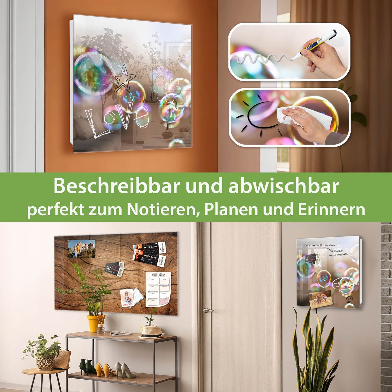 ✅ Magnetisch und mit Kreidestift beschreibbar, gehärtetes Glas, links angeschlagene TürOrdnung und Design in einem