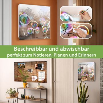 Bringe Ordnung und Eleganz in deinen Eingangsbereich mit dem banjado Schlüsselkasten Motiv Motiv Seifenblasen. Die moderne Schlüsselbox kombiniert funktionales Design mit hochwertiger Verarbeitung und wird so zu einem echten Hingucker in Flur, Büro oder Ferienwohnung. ✅ Stilvolle Schlüsselaufbewahrung mit Glasfront im Motiv Motiv Seifenblasen Der Design-Schlüsselkasten Motiv Motiv Seifenblasen bietet Platz für bis zu 50 Schlüssel, die auf 5 stabilen Reihen mit je 10 Haken übersichtlich verstaut werden. Mit seinen kompakten Maßen von 30 x 30 x 5 cm passt die Schlüsselbox perfekt auch in kleinere Räume. Der weiß lackierte Stahlkorpus mit rechts angeschlagenem Türscharnier harmoniert mit der Glasfront und fügt sich nahtlos in jedes Wohnambiente ein. Ob als Schlüsselorganizer für Zuhause oder als praktische Lösung für Büros, Praxen und Gewerbe, der banjado Schlüsselkasten sorgt für Ordnung und Übersicht. Dank der magnetischen, mit Kreidestiften beschreibbaren Glasfront kannst du Notizen anheften oder Termine direkt auf der Oberfläche festhalten. Die Schlüsselbox Motiv Motiv Seifenblasen zur Wandmontage wird inklusive Befestigungsmaterial geliefert und ist schnell angebracht. So hast du deine Schlüssel jederzeit griffbereit und zugleich stilvoll verstaut. Mit diesem banjado Schlüsselkasten Motiv Motiv Seifenblasen kombinierst du praktische Aufbewahrung mit stilvollem Wohndesign. Ob privat oder geschäftlich, die Schlüsselbox sorgt für mehr Ordnung, Übersicht und ein wohnliches Ambiente.Vorteile im Überblick