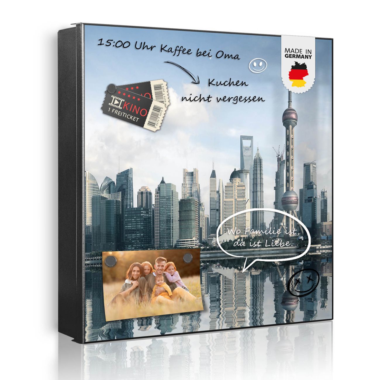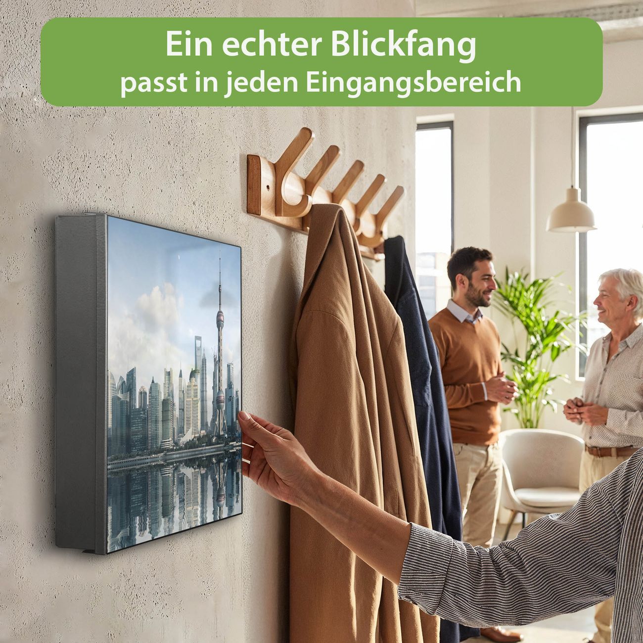 Bringe Ordnung und Eleganz in deinen Eingangsbereich mit dem banjado Schlüsselkasten Motiv Motiv Shanghai. Die moderne Schlüsselbox kombiniert funktionales Design mit hochwertiger Verarbeitung und wird so zu einem echten Hingucker in Flur, Büro oder Ferienwohnung. ✅ Stilvolle Schlüsselaufbewahrung mit Glasfront im Motiv Motiv Shanghai Der Design-Schlüsselkasten Motiv Motiv Shanghai bietet Platz für bis zu 50 Schlüssel, die auf 5 stabilen Reihen mit je 10 Haken übersichtlich verstaut werden. Mit seinen kompakten Maßen von 30 x 30 x 5 cm passt die Schlüsselbox perfekt auch in kleinere Räume. Der schwarz lackierte Stahlkorpus mit rechts angeschlagenem Türscharnier harmoniert mit der Glasfront und fügt sich nahtlos in jedes Wohnambiente ein. Ob als Schlüsselorganizer für Zuhause oder als praktische Lösung für Büros, Praxen und Gewerbe, der banjado Schlüsselkasten sorgt für Ordnung und Übersicht. Dank der magnetischen, mit Kreidestiften beschreibbaren Glasfront kannst du Notizen anheften oder Termine direkt auf der Oberfläche festhalten. Die Schlüsselbox Motiv Motiv Shanghai zur Wandmontage wird inklusive Befestigungsmaterial geliefert und ist schnell angebracht. So hast du deine Schlüssel jederzeit griffbereit und zugleich stilvoll verstaut. Mit diesem banjado Schlüsselkasten Motiv Motiv Shanghai kombinierst du praktische Aufbewahrung mit stilvollem Wohndesign. Ob privat oder geschäftlich, die Schlüsselbox sorgt für mehr Ordnung, Übersicht und ein wohnliches Ambiente.Vorteile im Überblick