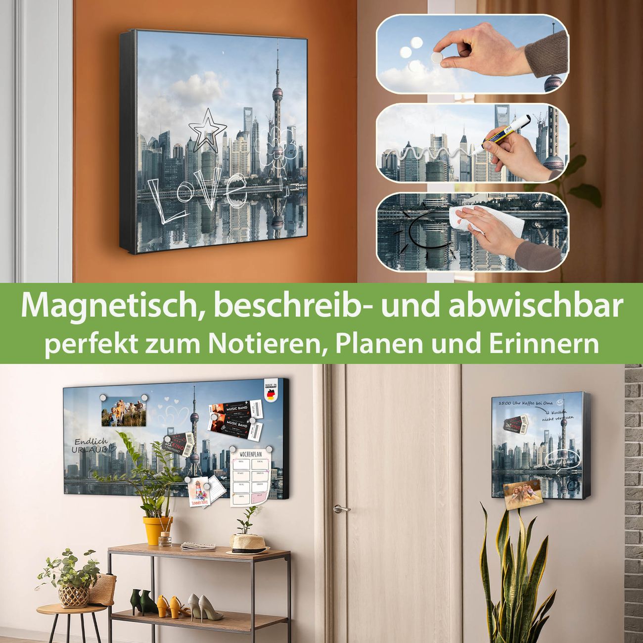 ✅ Magnetisch und mit Kreidestift beschreibbar, gehärtetes Glas, links angeschlagene TürOrdnung und Design in einem