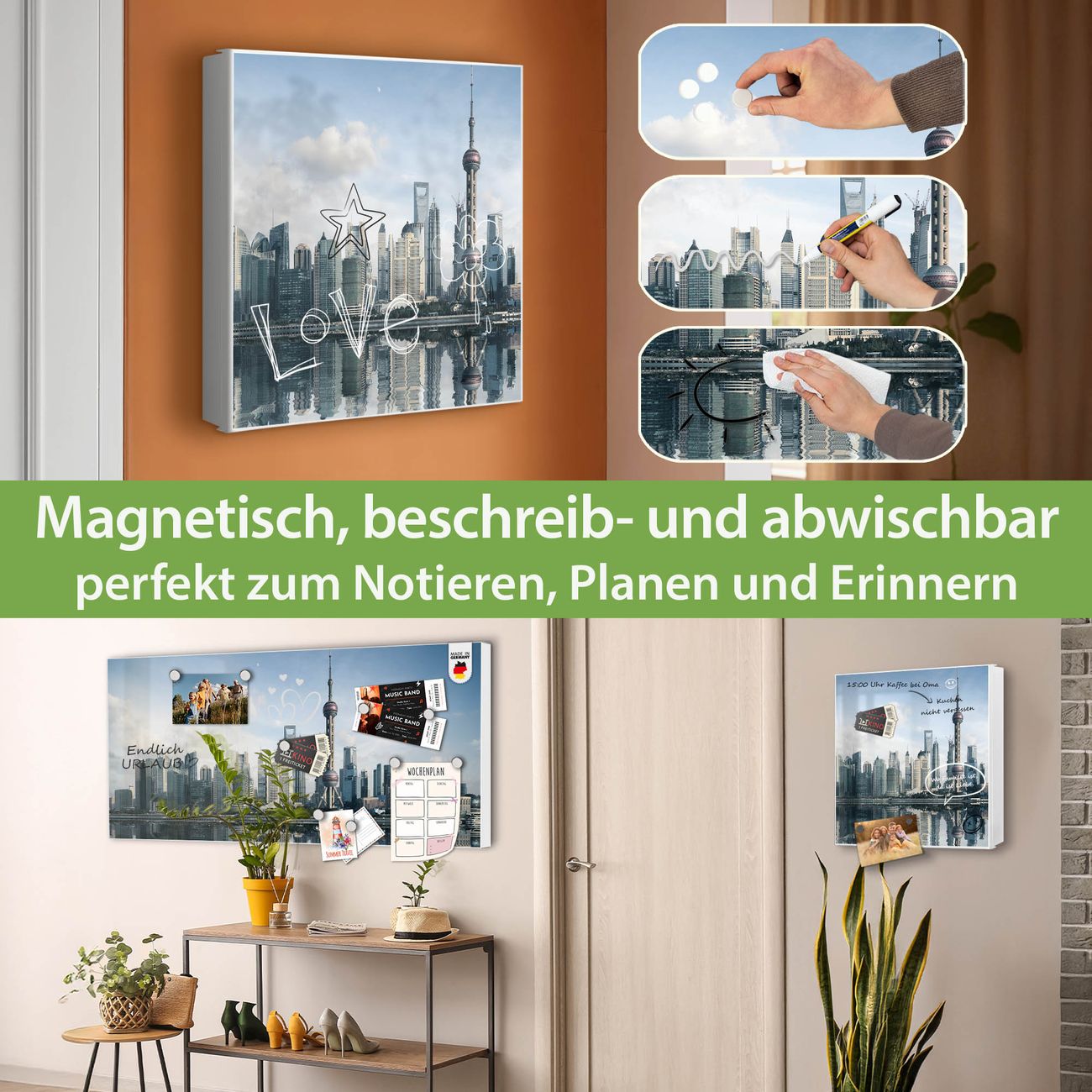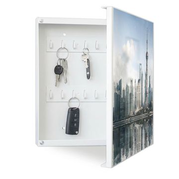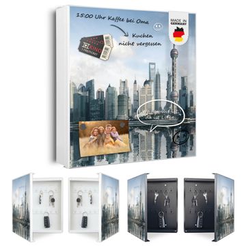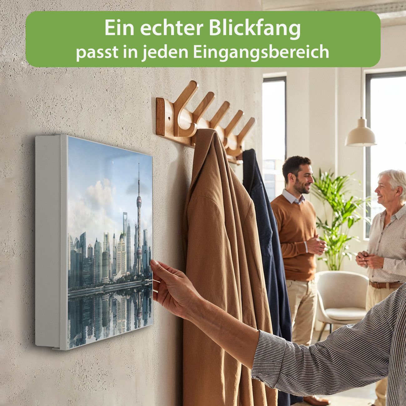 Bringe Ordnung und Eleganz in deinen Eingangsbereich mit dem banjado Schlüsselkasten Motiv Motiv Shanghai. Die moderne Schlüsselbox kombiniert funktionales Design mit hochwertiger Verarbeitung und wird so zu einem echten Hingucker in Flur, Büro oder Ferienwohnung. ✅ Stilvolle Schlüsselaufbewahrung mit Motiv Motiv Shanghai Der Design-Schlüsselkasten Motiv Motiv Shanghai bietet Platz für bis zu 32 Schlüssel, die auf 4 stabilen Reihen mit je 8 Haken übersichtlich verstaut werden. Mit seinen kompakten Maßen von 30 x 30 x 5 cm passt die Schlüsselbox perfekt auch in kleinere Räume. Der weiß lackierte Stahlkorpus mit rechts angeschlagenem Türscharnier harmoniert mit gedruckten Folie auf der Front und fügt sich nahtlos in jedes Wohnambiente ein. Ob als Schlüsselorganizer für Zuhause oder als praktische Lösung für Büros, Praxen und Gewerbe, der banjado Schlüsselkasten sorgt für Ordnung und Übersicht. Dank der magnetischen, mit Kreidestiften beschreibbaren Folie auf der Front kannst du Notizen anheften oder Termine direkt auf der Oberfläche festhalten. Die Schlüsselbox Motiv Motiv Shanghai zur Wandmontage wird inklusive Befestigungsmaterial geliefert und ist schnell angebracht. So hast du deine Schlüssel jederzeit griffbereit und zugleich stilvoll verstaut. Mit diesem banjado Schlüsselkasten Motiv Motiv Shanghai kombinierst du praktische Aufbewahrung mit stilvollem Wohndesign. Ob privat oder geschäftlich, die Schlüsselbox sorgt für mehr Ordnung, Übersicht und ein wohnliches Ambiente.Vorteile im Überblick