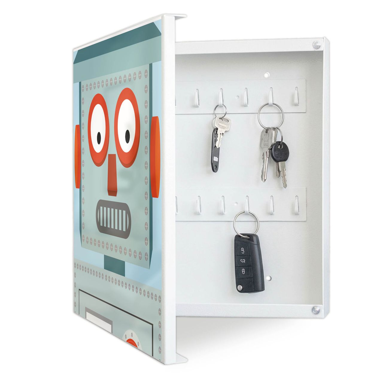Bringe Ordnung und Eleganz in deinen Eingangsbereich mit dem banjado Schlüsselkasten Motiv Motiv Shocked Robot. Die moderne Schlüsselbox kombiniert funktionales Design mit hochwertiger Verarbeitung und wird so zu einem echten Hingucker in Flur, Büro oder Ferienwohnung. ✅ Stilvolle Schlüsselaufbewahrung mit Motiv Motiv Shocked Robot Der Design-Schlüsselkasten Motiv Motiv Shocked Robot bietet Platz für bis zu 32 Schlüssel, die auf 4 stabilen Reihen mit je 8 Haken übersichtlich verstaut werden. Mit seinen kompakten Maßen von 30 x 30 x 5 cm passt die Schlüsselbox perfekt auch in kleinere Räume. Der weiß lackierte Stahlkorpus mit links angeschlagenem Türscharnier harmoniert mit gedruckten Folie auf der Front und fügt sich nahtlos in jedes Wohnambiente ein. Ob als Schlüsselorganizer für Zuhause oder als praktische Lösung für Büros, Praxen und Gewerbe, der banjado Schlüsselkasten sorgt für Ordnung und Übersicht. Dank der magnetischen, mit Kreidestiften beschreibbaren Folie auf der Front kannst du Notizen anheften oder Termine direkt auf der Oberfläche festhalten. Die Schlüsselbox Motiv Motiv Shocked Robot zur Wandmontage wird inklusive Befestigungsmaterial geliefert und ist schnell angebracht. So hast du deine Schlüssel jederzeit griffbereit und zugleich stilvoll verstaut. Mit diesem banjado Schlüsselkasten Motiv Motiv Shocked Robot kombinierst du praktische Aufbewahrung mit stilvollem Wohndesign. Ob privat oder geschäftlich, die Schlüsselbox sorgt für mehr Ordnung, Übersicht und ein wohnliches Ambiente.Vorteile im Überblick