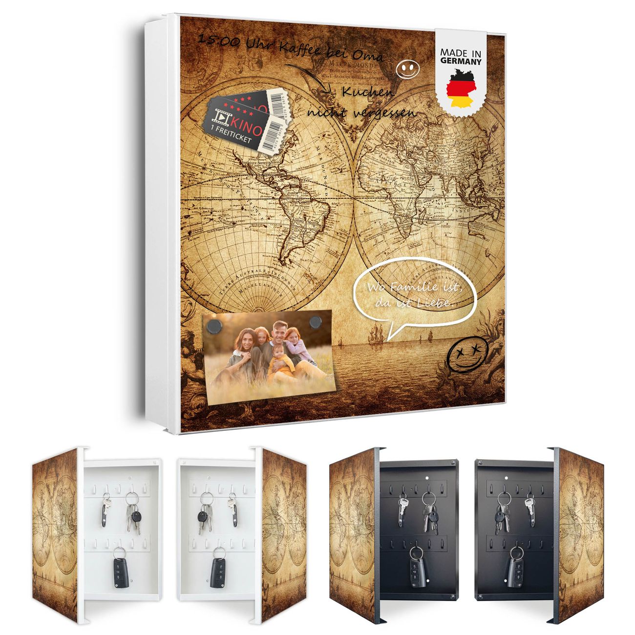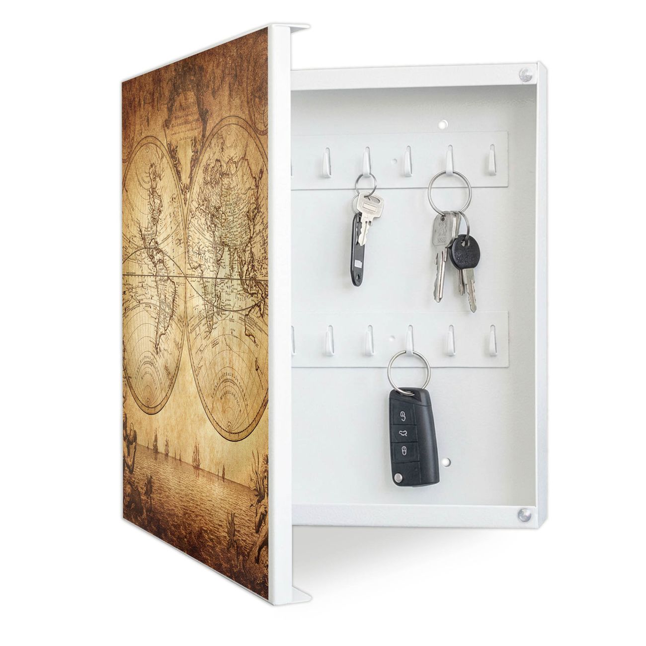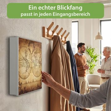 Bringe Ordnung und Eleganz in deinen Eingangsbereich mit dem banjado Schlüsselkasten Motiv Motiv Sieben Weltmeere. Die moderne Schlüsselbox kombiniert funktionales Design mit hochwertiger Verarbeitung und wird so zu einem echten Hingucker in Flur, Büro oder Ferienwohnung. ✅ Stilvolle Schlüsselaufbewahrung mit Motiv Motiv Sieben Weltmeere Der Design-Schlüsselkasten Motiv Motiv Sieben Weltmeere bietet Platz für bis zu 32 Schlüssel, die auf 4 stabilen Reihen mit je 8 Haken übersichtlich verstaut werden. Mit seinen kompakten Maßen von 30 x 30 x 5 cm passt die Schlüsselbox perfekt auch in kleinere Räume. Der weiß lackierte Stahlkorpus mit links angeschlagenem Türscharnier harmoniert mit gedruckten Folie auf der Front und fügt sich nahtlos in jedes Wohnambiente ein. Ob als Schlüsselorganizer für Zuhause oder als praktische Lösung für Büros, Praxen und Gewerbe, der banjado Schlüsselkasten sorgt für Ordnung und Übersicht. Dank der magnetischen, mit Kreidestiften beschreibbaren Folie auf der Front kannst du Notizen anheften oder Termine direkt auf der Oberfläche festhalten. Die Schlüsselbox Motiv Motiv Sieben Weltmeere zur Wandmontage wird inklusive Befestigungsmaterial geliefert und ist schnell angebracht. So hast du deine Schlüssel jederzeit griffbereit und zugleich stilvoll verstaut. Mit diesem banjado Schlüsselkasten Motiv Motiv Sieben Weltmeere kombinierst du praktische Aufbewahrung mit stilvollem Wohndesign. Ob privat oder geschäftlich, die Schlüsselbox sorgt für mehr Ordnung, Übersicht und ein wohnliches Ambiente.Vorteile im Überblick