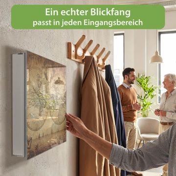 Bringe Ordnung und Eleganz in deinen Eingangsbereich mit dem banjado Schlüsselkasten Motiv Motiv Sieben Weltmeere. Die moderne Schlüsselbox kombiniert funktionales Design mit hochwertiger Verarbeitung und wird so zu einem echten Hingucker in Flur, Büro oder Ferienwohnung. ✅ Stilvolle Schlüsselaufbewahrung mit Glasfront im Motiv Motiv Sieben Weltmeere Der Design-Schlüsselkasten Motiv Motiv Sieben Weltmeere bietet Platz für bis zu 50 Schlüssel, die auf 5 stabilen Reihen mit je 10 Haken übersichtlich verstaut werden. Mit seinen kompakten Maßen von 30 x 30 x 5 cm passt die Schlüsselbox perfekt auch in kleinere Räume. Der weiß lackierte Stahlkorpus mit rechts angeschlagenem Türscharnier harmoniert mit der Glasfront und fügt sich nahtlos in jedes Wohnambiente ein. Ob als Schlüsselorganizer für Zuhause oder als praktische Lösung für Büros, Praxen und Gewerbe, der banjado Schlüsselkasten sorgt für Ordnung und Übersicht. Dank der magnetischen, mit Kreidestiften beschreibbaren Glasfront kannst du Notizen anheften oder Termine direkt auf der Oberfläche festhalten. Die Schlüsselbox Motiv Motiv Sieben Weltmeere zur Wandmontage wird inklusive Befestigungsmaterial geliefert und ist schnell angebracht. So hast du deine Schlüssel jederzeit griffbereit und zugleich stilvoll verstaut. Mit diesem banjado Schlüsselkasten Motiv Motiv Sieben Weltmeere kombinierst du praktische Aufbewahrung mit stilvollem Wohndesign. Ob privat oder geschäftlich, die Schlüsselbox sorgt für mehr Ordnung, Übersicht und ein wohnliches Ambiente.Vorteile im Überblick