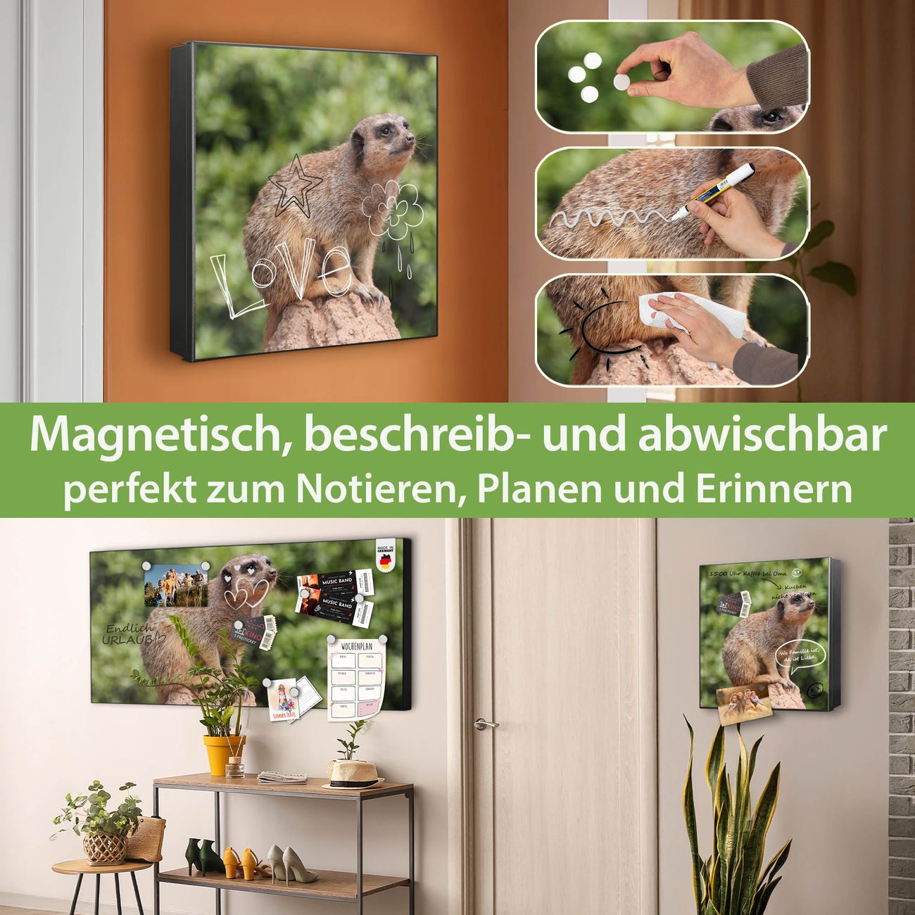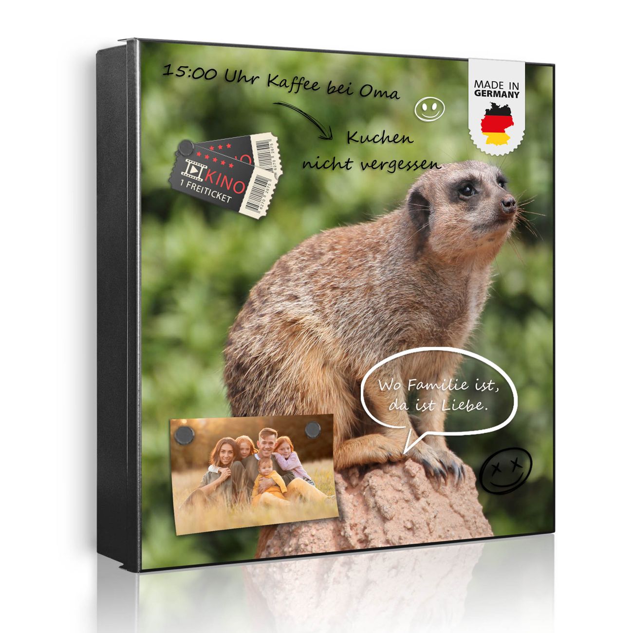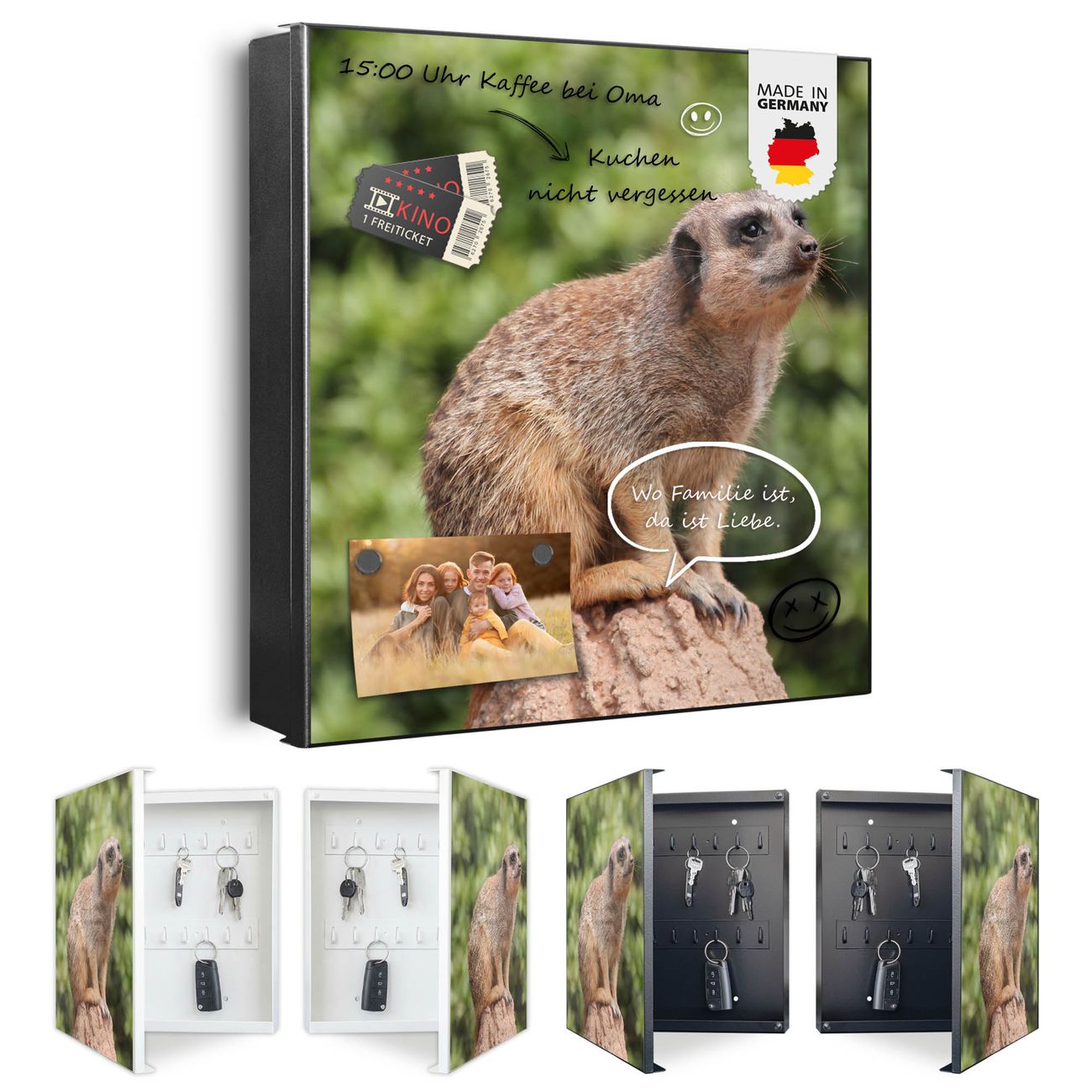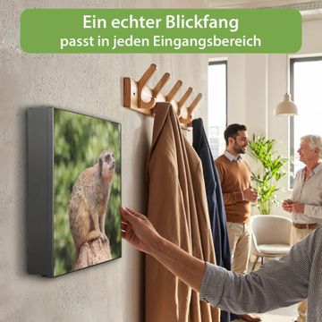 Bringe Ordnung und Eleganz in deinen Eingangsbereich mit dem banjado Schlüsselkasten Motiv Motiv Sitzendes Erdmännchen. Die moderne Schlüsselbox kombiniert funktionales Design mit hochwertiger Verarbeitung und wird so zu einem echten Hingucker in Flur, Büro oder Ferienwohnung. ✅ Stilvolle Schlüsselaufbewahrung mit Motiv Motiv Sitzendes Erdmännchen Der Design-Schlüsselkasten Motiv Motiv Sitzendes Erdmännchen bietet Platz für bis zu 32 Schlüssel, die auf 4 stabilen Reihen mit je 8 Haken übersichtlich verstaut werden. Mit seinen kompakten Maßen von 30 x 30 x 5 cm passt die Schlüsselbox perfekt auch in kleinere Räume. Der schwarz lackierte Stahlkorpus mit rechts angeschlagenem Türscharnier harmoniert mit gedruckten Folie auf der Front und fügt sich nahtlos in jedes Wohnambiente ein. Ob als Schlüsselorganizer für Zuhause oder als praktische Lösung für Büros, Praxen und Gewerbe, der banjado Schlüsselkasten sorgt für Ordnung und Übersicht. Dank der magnetischen, mit Kreidestiften beschreibbaren Folie auf der Front kannst du Notizen anheften oder Termine direkt auf der Oberfläche festhalten. Die Schlüsselbox Motiv Motiv Sitzendes Erdmännchen zur Wandmontage wird inklusive Befestigungsmaterial geliefert und ist schnell angebracht. So hast du deine Schlüssel jederzeit griffbereit und zugleich stilvoll verstaut. Mit diesem banjado Schlüsselkasten Motiv Motiv Sitzendes Erdmännchen kombinierst du praktische Aufbewahrung mit stilvollem Wohndesign. Ob privat oder geschäftlich, die Schlüsselbox sorgt für mehr Ordnung, Übersicht und ein wohnliches Ambiente.Vorteile im Überblick