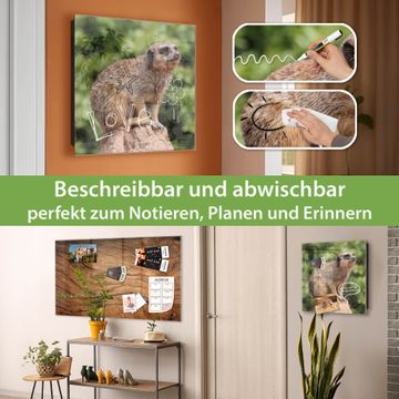 Bringe Ordnung und Eleganz in deinen Eingangsbereich mit dem banjado Schlüsselkasten Motiv Motiv Sitzendes Erdmännchen. Die moderne Schlüsselbox kombiniert funktionales Design mit hochwertiger Verarbeitung und wird so zu einem echten Hingucker in Flur, Büro oder Ferienwohnung. ✅ Stilvolle Schlüsselaufbewahrung mit Glasfront im Motiv Motiv Sitzendes Erdmännchen Der Design-Schlüsselkasten Motiv Motiv Sitzendes Erdmännchen bietet Platz für bis zu 50 Schlüssel, die auf 5 stabilen Reihen mit je 10 Haken übersichtlich verstaut werden. Mit seinen kompakten Maßen von 30 x 30 x 5 cm passt die Schlüsselbox perfekt auch in kleinere Räume. Der schwarz lackierte Stahlkorpus mit rechts angeschlagenem Türscharnier harmoniert mit der Glasfront und fügt sich nahtlos in jedes Wohnambiente ein. Ob als Schlüsselorganizer für Zuhause oder als praktische Lösung für Büros, Praxen und Gewerbe, der banjado Schlüsselkasten sorgt für Ordnung und Übersicht. Dank der magnetischen, mit Kreidestiften beschreibbaren Glasfront kannst du Notizen anheften oder Termine direkt auf der Oberfläche festhalten. Die Schlüsselbox Motiv Motiv Sitzendes Erdmännchen zur Wandmontage wird inklusive Befestigungsmaterial geliefert und ist schnell angebracht. So hast du deine Schlüssel jederzeit griffbereit und zugleich stilvoll verstaut. Mit diesem banjado Schlüsselkasten Motiv Motiv Sitzendes Erdmännchen kombinierst du praktische Aufbewahrung mit stilvollem Wohndesign. Ob privat oder geschäftlich, die Schlüsselbox sorgt für mehr Ordnung, Übersicht und ein wohnliches Ambiente.Vorteile im Überblick