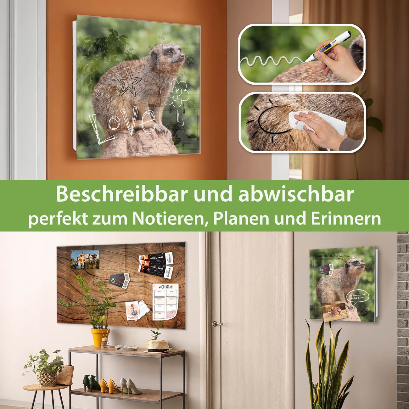 Bringe Ordnung und Eleganz in deinen Eingangsbereich mit dem banjado Schlüsselkasten Motiv Motiv Sitzendes Erdmännchen. Die moderne Schlüsselbox kombiniert funktionales Design mit hochwertiger Verarbeitung und wird so zu einem echten Hingucker in Flur, Büro oder Ferienwohnung. ✅ Stilvolle Schlüsselaufbewahrung mit Glasfront im Motiv Motiv Sitzendes Erdmännchen Der Design-Schlüsselkasten Motiv Motiv Sitzendes Erdmännchen bietet Platz für bis zu 50 Schlüssel, die auf 5 stabilen Reihen mit je 10 Haken übersichtlich verstaut werden. Mit seinen kompakten Maßen von 30 x 30 x 5 cm passt die Schlüsselbox perfekt auch in kleinere Räume. Der weiß lackierte Stahlkorpus mit rechts angeschlagenem Türscharnier harmoniert mit der Glasfront und fügt sich nahtlos in jedes Wohnambiente ein. Ob als Schlüsselorganizer für Zuhause oder als praktische Lösung für Büros, Praxen und Gewerbe, der banjado Schlüsselkasten sorgt für Ordnung und Übersicht. Dank der magnetischen, mit Kreidestiften beschreibbaren Glasfront kannst du Notizen anheften oder Termine direkt auf der Oberfläche festhalten. Die Schlüsselbox Motiv Motiv Sitzendes Erdmännchen zur Wandmontage wird inklusive Befestigungsmaterial geliefert und ist schnell angebracht. So hast du deine Schlüssel jederzeit griffbereit und zugleich stilvoll verstaut. Mit diesem banjado Schlüsselkasten Motiv Motiv Sitzendes Erdmännchen kombinierst du praktische Aufbewahrung mit stilvollem Wohndesign. Ob privat oder geschäftlich, die Schlüsselbox sorgt für mehr Ordnung, Übersicht und ein wohnliches Ambiente.Vorteile im Überblick