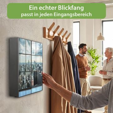 Bringe Ordnung und Eleganz in deinen Eingangsbereich mit dem banjado Schlüsselkasten Motiv Motiv Skyline Manhattan. Die moderne Schlüsselbox kombiniert funktionales Design mit hochwertiger Verarbeitung und wird so zu einem echten Hingucker in Flur, Büro oder Ferienwohnung. ✅ Stilvolle Schlüsselaufbewahrung mit Motiv Motiv Skyline Manhattan Der Design-Schlüsselkasten Motiv Motiv Skyline Manhattan bietet Platz für bis zu 32 Schlüssel, die auf 4 stabilen Reihen mit je 8 Haken übersichtlich verstaut werden. Mit seinen kompakten Maßen von 30 x 30 x 5 cm passt die Schlüsselbox perfekt auch in kleinere Räume. Der schwarz lackierte Stahlkorpus mit links angeschlagenem Türscharnier harmoniert mit gedruckten Folie auf der Front und fügt sich nahtlos in jedes Wohnambiente ein. Ob als Schlüsselorganizer für Zuhause oder als praktische Lösung für Büros, Praxen und Gewerbe, der banjado Schlüsselkasten sorgt für Ordnung und Übersicht. Dank der magnetischen, mit Kreidestiften beschreibbaren Folie auf der Front kannst du Notizen anheften oder Termine direkt auf der Oberfläche festhalten. Die Schlüsselbox Motiv Motiv Skyline Manhattan zur Wandmontage wird inklusive Befestigungsmaterial geliefert und ist schnell angebracht. So hast du deine Schlüssel jederzeit griffbereit und zugleich stilvoll verstaut. Mit diesem banjado Schlüsselkasten Motiv Motiv Skyline Manhattan kombinierst du praktische Aufbewahrung mit stilvollem Wohndesign. Ob privat oder geschäftlich, die Schlüsselbox sorgt für mehr Ordnung, Übersicht und ein wohnliches Ambiente.Vorteile im Überblick