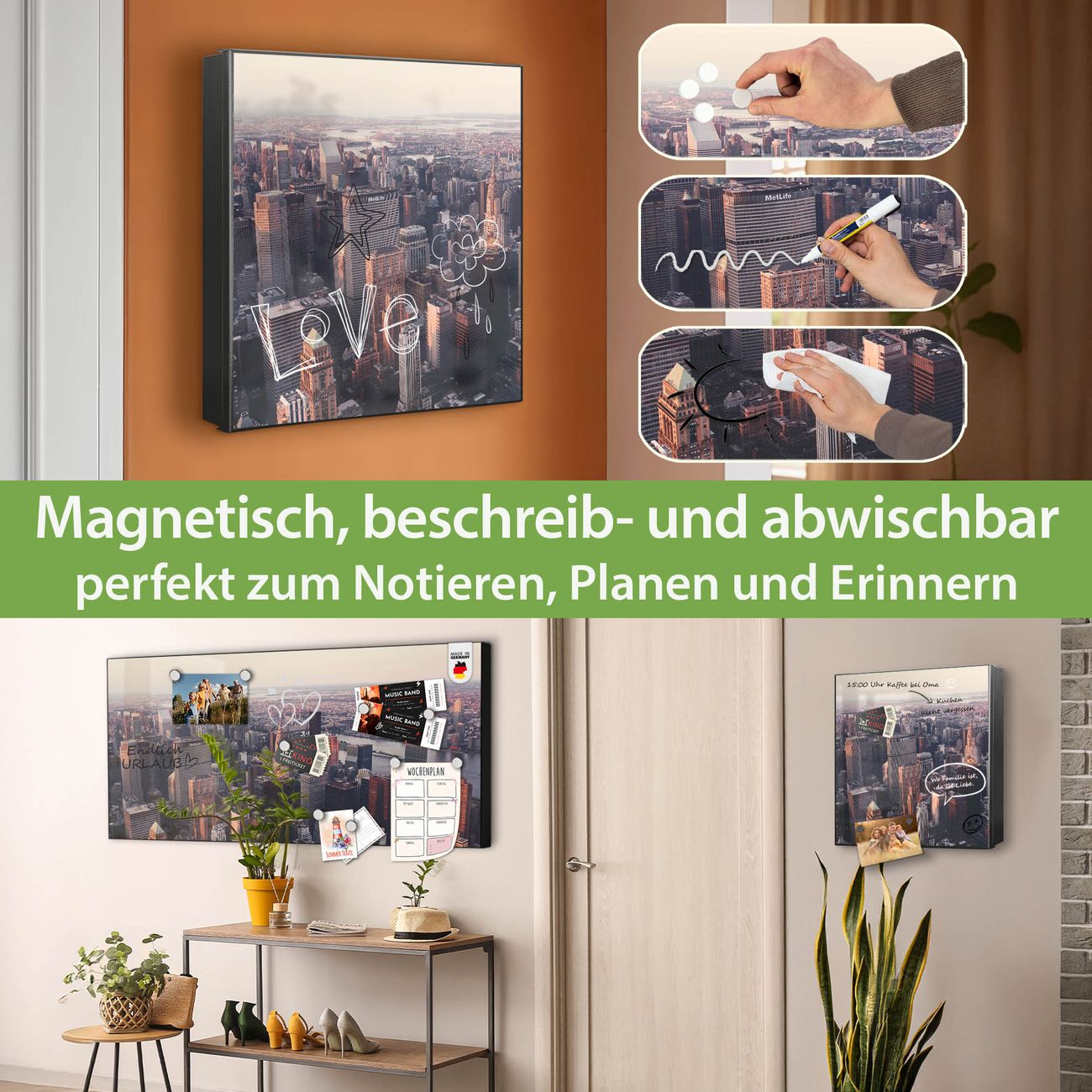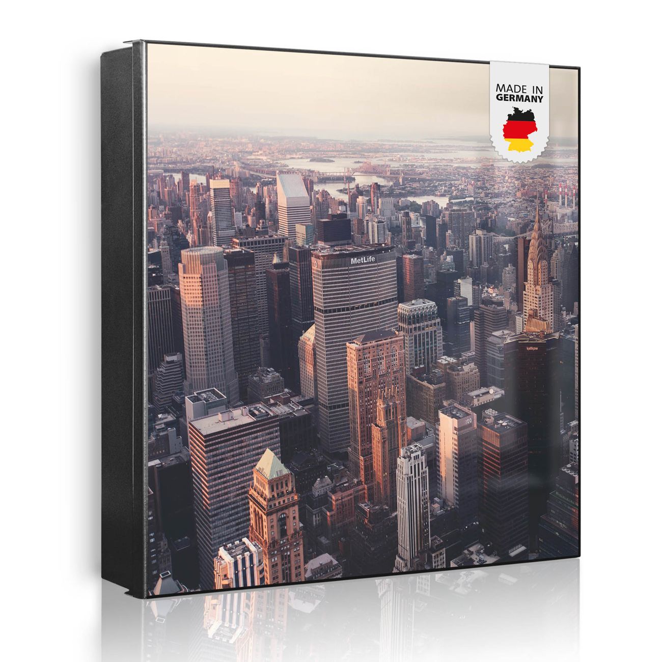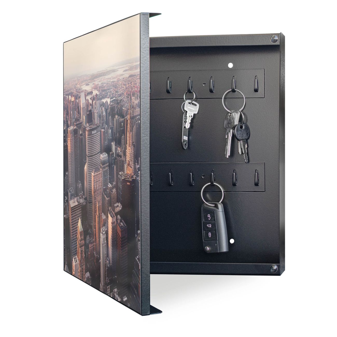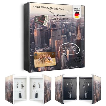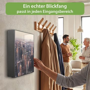 Bringe Ordnung und Eleganz in deinen Eingangsbereich mit dem banjado Schlüsselkasten Motiv Motiv Skyline. Die moderne Schlüsselbox kombiniert funktionales Design mit hochwertiger Verarbeitung und wird so zu einem echten Hingucker in Flur, Büro oder Ferienwohnung. ✅ Stilvolle Schlüsselaufbewahrung mit Motiv Motiv Skyline Der Design-Schlüsselkasten Motiv Motiv Skyline bietet Platz für bis zu 32 Schlüssel, die auf 4 stabilen Reihen mit je 8 Haken übersichtlich verstaut werden. Mit seinen kompakten Maßen von 30 x 30 x 5 cm passt die Schlüsselbox perfekt auch in kleinere Räume. Der schwarz lackierte Stahlkorpus mit links angeschlagenem Türscharnier harmoniert mit gedruckten Folie auf der Front und fügt sich nahtlos in jedes Wohnambiente ein. Ob als Schlüsselorganizer für Zuhause oder als praktische Lösung für Büros, Praxen und Gewerbe, der banjado Schlüsselkasten sorgt für Ordnung und Übersicht. Dank der magnetischen, mit Kreidestiften beschreibbaren Folie auf der Front kannst du Notizen anheften oder Termine direkt auf der Oberfläche festhalten. Die Schlüsselbox Motiv Motiv Skyline zur Wandmontage wird inklusive Befestigungsmaterial geliefert und ist schnell angebracht. So hast du deine Schlüssel jederzeit griffbereit und zugleich stilvoll verstaut. Mit diesem banjado Schlüsselkasten Motiv Motiv Skyline kombinierst du praktische Aufbewahrung mit stilvollem Wohndesign. Ob privat oder geschäftlich, die Schlüsselbox sorgt für mehr Ordnung, Übersicht und ein wohnliches Ambiente.Vorteile im Überblick
