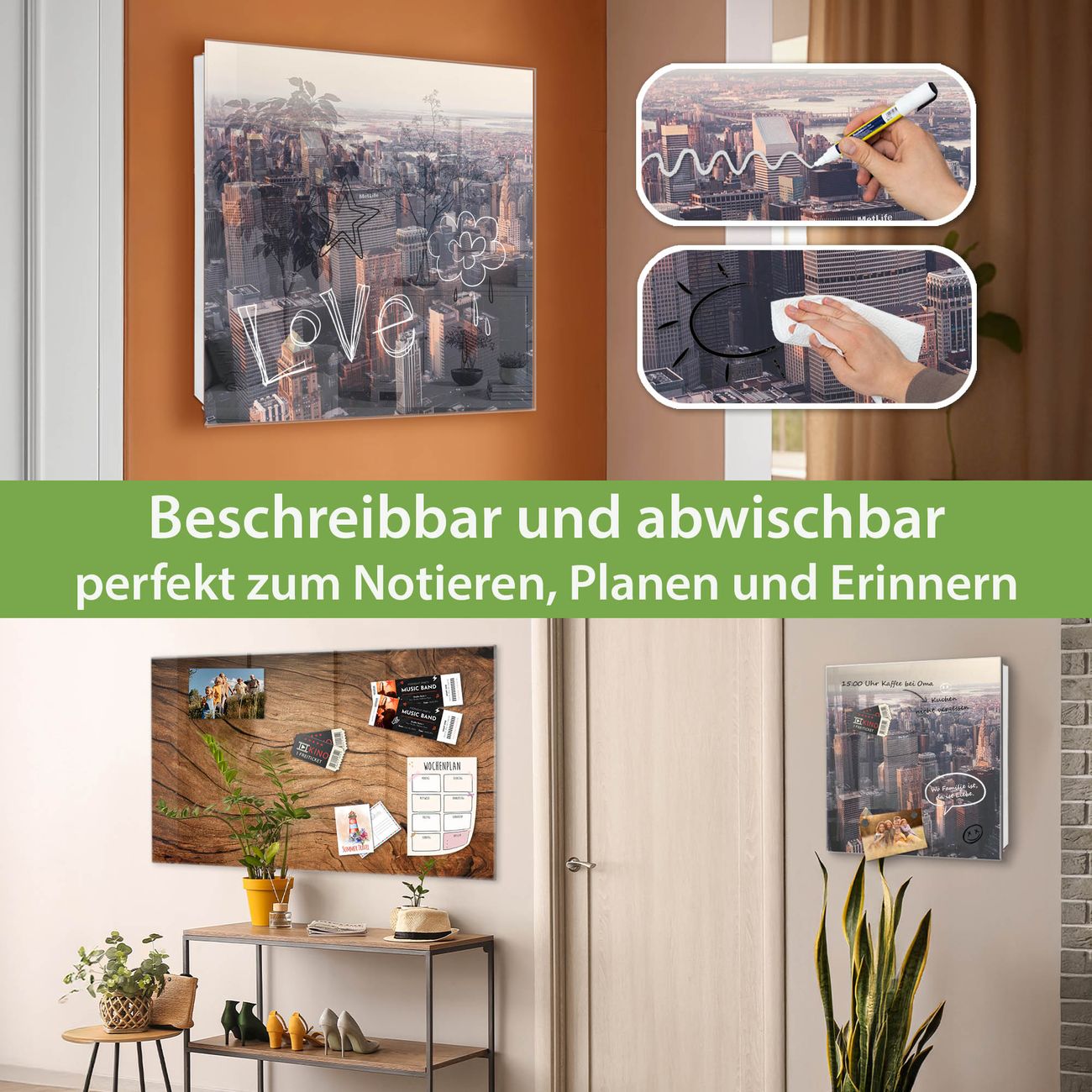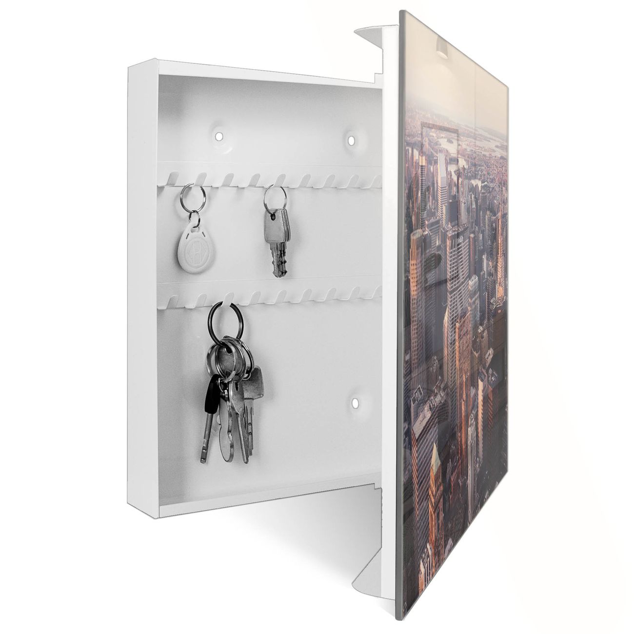 Bringe Ordnung und Eleganz in deinen Eingangsbereich mit dem banjado Schlüsselkasten Motiv Motiv Skyline. Die moderne Schlüsselbox kombiniert funktionales Design mit hochwertiger Verarbeitung und wird so zu einem echten Hingucker in Flur, Büro oder Ferienwohnung. ✅ Stilvolle Schlüsselaufbewahrung mit Glasfront im Motiv Motiv Skyline Der Design-Schlüsselkasten Motiv Motiv Skyline bietet Platz für bis zu 50 Schlüssel, die auf 5 stabilen Reihen mit je 10 Haken übersichtlich verstaut werden. Mit seinen kompakten Maßen von 30 x 30 x 5 cm passt die Schlüsselbox perfekt auch in kleinere Räume. Der weiß lackierte Stahlkorpus mit rechts angeschlagenem Türscharnier harmoniert mit der Glasfront und fügt sich nahtlos in jedes Wohnambiente ein. Ob als Schlüsselorganizer für Zuhause oder als praktische Lösung für Büros, Praxen und Gewerbe, der banjado Schlüsselkasten sorgt für Ordnung und Übersicht. Dank der magnetischen, mit Kreidestiften beschreibbaren Glasfront kannst du Notizen anheften oder Termine direkt auf der Oberfläche festhalten. Die Schlüsselbox Motiv Motiv Skyline zur Wandmontage wird inklusive Befestigungsmaterial geliefert und ist schnell angebracht. So hast du deine Schlüssel jederzeit griffbereit und zugleich stilvoll verstaut. Mit diesem banjado Schlüsselkasten Motiv Motiv Skyline kombinierst du praktische Aufbewahrung mit stilvollem Wohndesign. Ob privat oder geschäftlich, die Schlüsselbox sorgt für mehr Ordnung, Übersicht und ein wohnliches Ambiente.Vorteile im Überblick