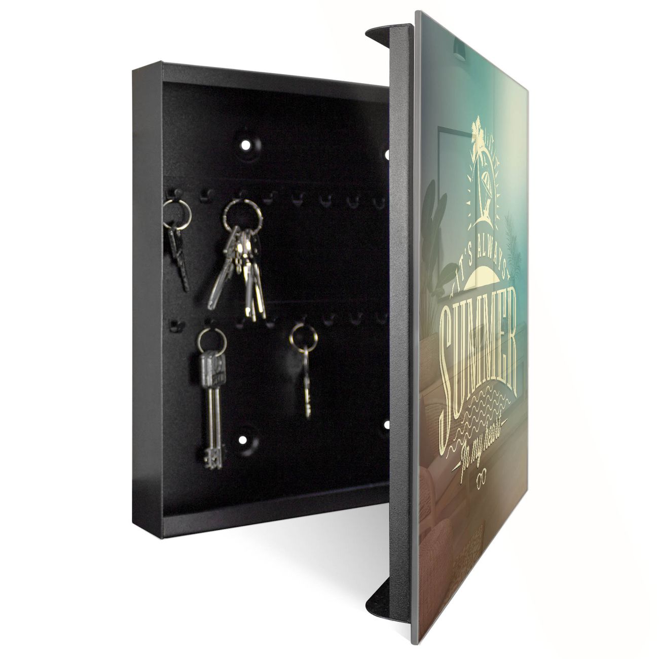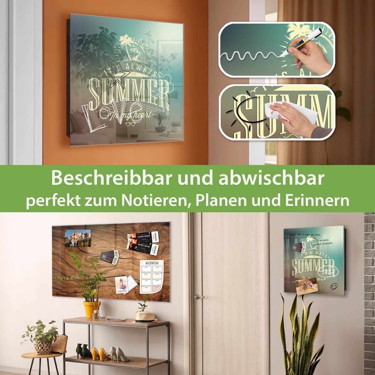 Bringe Ordnung und Eleganz in deinen Eingangsbereich mit dem banjado Schlüsselkasten Motiv Motiv Sommer Heart. Die moderne Schlüsselbox kombiniert funktionales Design mit hochwertiger Verarbeitung und wird so zu einem echten Hingucker in Flur, Büro oder Ferienwohnung. ✅ Stilvolle Schlüsselaufbewahrung mit Glasfront im Motiv Motiv Sommer Heart Der Design-Schlüsselkasten Motiv Motiv Sommer Heart bietet Platz für bis zu 50 Schlüssel, die auf 5 stabilen Reihen mit je 10 Haken übersichtlich verstaut werden. Mit seinen kompakten Maßen von 30 x 30 x 5 cm passt die Schlüsselbox perfekt auch in kleinere Räume. Der schwarz lackierte Stahlkorpus mit rechts angeschlagenem Türscharnier harmoniert mit der Glasfront und fügt sich nahtlos in jedes Wohnambiente ein. Ob als Schlüsselorganizer für Zuhause oder als praktische Lösung für Büros, Praxen und Gewerbe, der banjado Schlüsselkasten sorgt für Ordnung und Übersicht. Dank der magnetischen, mit Kreidestiften beschreibbaren Glasfront kannst du Notizen anheften oder Termine direkt auf der Oberfläche festhalten. Die Schlüsselbox Motiv Motiv Sommer Heart zur Wandmontage wird inklusive Befestigungsmaterial geliefert und ist schnell angebracht. So hast du deine Schlüssel jederzeit griffbereit und zugleich stilvoll verstaut. Mit diesem banjado Schlüsselkasten Motiv Motiv Sommer Heart kombinierst du praktische Aufbewahrung mit stilvollem Wohndesign. Ob privat oder geschäftlich, die Schlüsselbox sorgt für mehr Ordnung, Übersicht und ein wohnliches Ambiente.Vorteile im Überblick