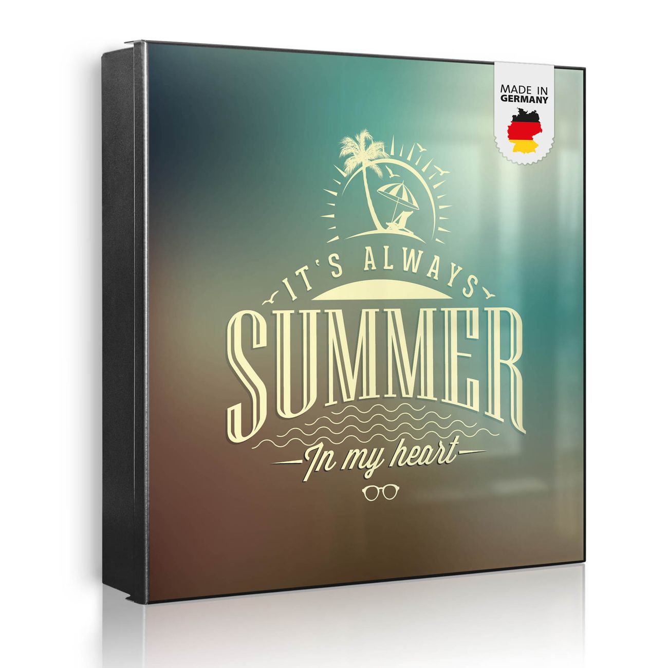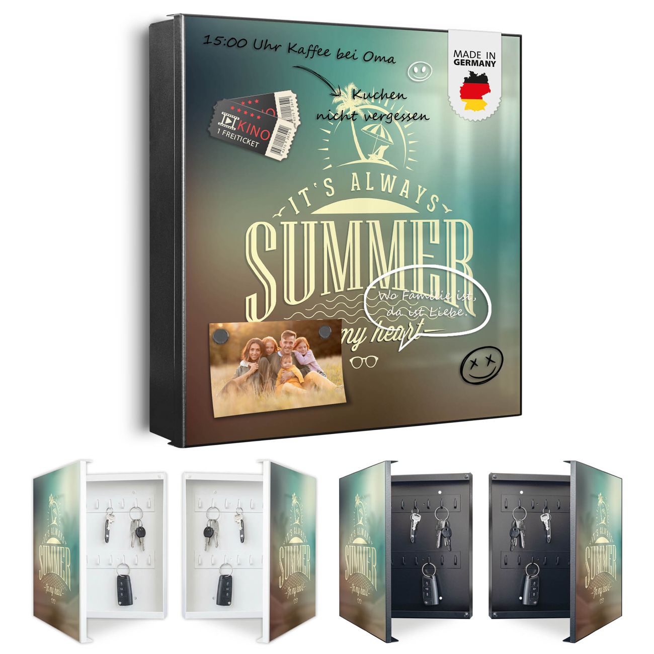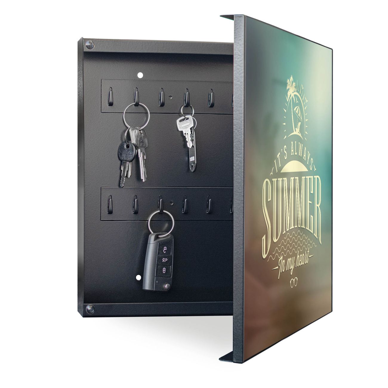Bringe Ordnung und Eleganz in deinen Eingangsbereich mit dem banjado Schlüsselkasten Motiv Motiv Sommer Heart. Die moderne Schlüsselbox kombiniert funktionales Design mit hochwertiger Verarbeitung und wird so zu einem echten Hingucker in Flur, Büro oder Ferienwohnung. ✅ Stilvolle Schlüsselaufbewahrung mit Motiv Motiv Sommer Heart Der Design-Schlüsselkasten Motiv Motiv Sommer Heart bietet Platz für bis zu 32 Schlüssel, die auf 4 stabilen Reihen mit je 8 Haken übersichtlich verstaut werden. Mit seinen kompakten Maßen von 30 x 30 x 5 cm passt die Schlüsselbox perfekt auch in kleinere Räume. Der schwarz lackierte Stahlkorpus mit rechts angeschlagenem Türscharnier harmoniert mit gedruckten Folie auf der Front und fügt sich nahtlos in jedes Wohnambiente ein. Ob als Schlüsselorganizer für Zuhause oder als praktische Lösung für Büros, Praxen und Gewerbe, der banjado Schlüsselkasten sorgt für Ordnung und Übersicht. Dank der magnetischen, mit Kreidestiften beschreibbaren Folie auf der Front kannst du Notizen anheften oder Termine direkt auf der Oberfläche festhalten. Die Schlüsselbox Motiv Motiv Sommer Heart zur Wandmontage wird inklusive Befestigungsmaterial geliefert und ist schnell angebracht. So hast du deine Schlüssel jederzeit griffbereit und zugleich stilvoll verstaut. Mit diesem banjado Schlüsselkasten Motiv Motiv Sommer Heart kombinierst du praktische Aufbewahrung mit stilvollem Wohndesign. Ob privat oder geschäftlich, die Schlüsselbox sorgt für mehr Ordnung, Übersicht und ein wohnliches Ambiente.Vorteile im Überblick