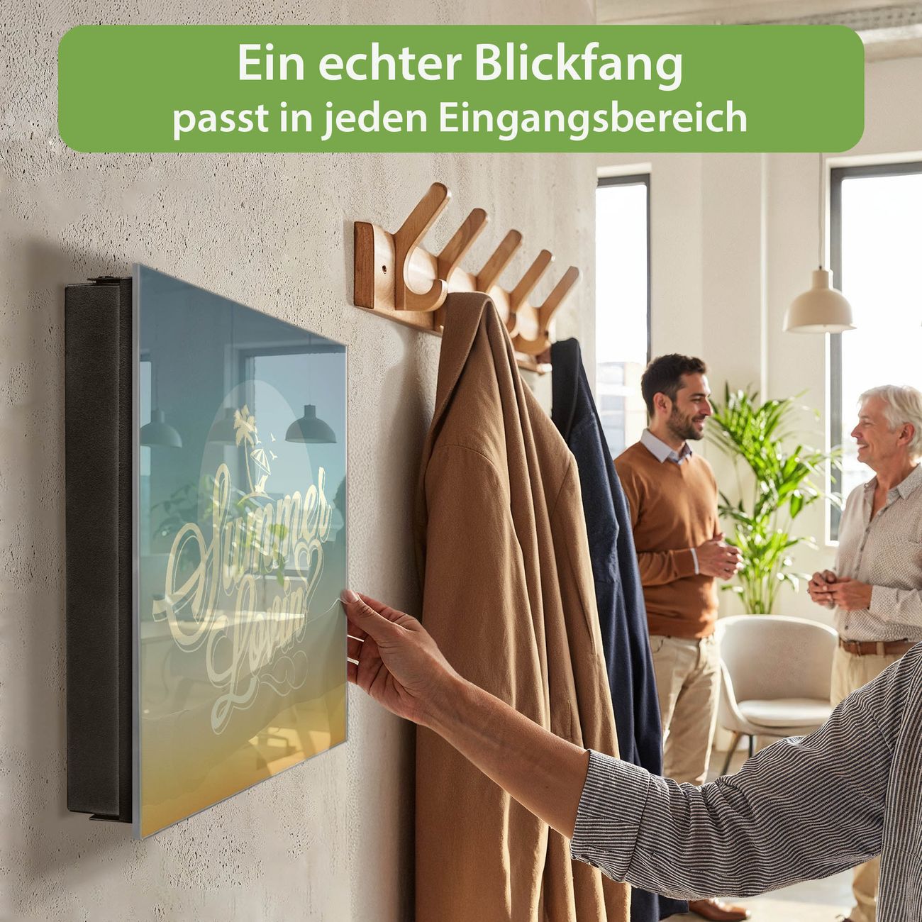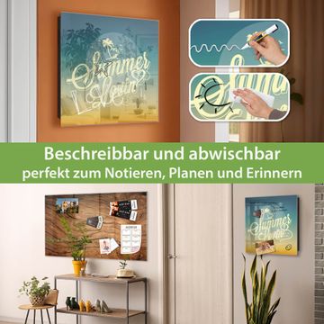 Bringe Ordnung und Eleganz in deinen Eingangsbereich mit dem banjado Schlüsselkasten Motiv Motiv Sommer Lovin. Die moderne Schlüsselbox kombiniert funktionales Design mit hochwertiger Verarbeitung und wird so zu einem echten Hingucker in Flur, Büro oder Ferienwohnung. ✅ Stilvolle Schlüsselaufbewahrung mit Glasfront im Motiv Motiv Sommer Lovin Der Design-Schlüsselkasten Motiv Motiv Sommer Lovin bietet Platz für bis zu 50 Schlüssel, die auf 5 stabilen Reihen mit je 10 Haken übersichtlich verstaut werden. Mit seinen kompakten Maßen von 30 x 30 x 5 cm passt die Schlüsselbox perfekt auch in kleinere Räume. Der schwarz lackierte Stahlkorpus mit rechts angeschlagenem Türscharnier harmoniert mit der Glasfront und fügt sich nahtlos in jedes Wohnambiente ein. Ob als Schlüsselorganizer für Zuhause oder als praktische Lösung für Büros, Praxen und Gewerbe, der banjado Schlüsselkasten sorgt für Ordnung und Übersicht. Dank der magnetischen, mit Kreidestiften beschreibbaren Glasfront kannst du Notizen anheften oder Termine direkt auf der Oberfläche festhalten. Die Schlüsselbox Motiv Motiv Sommer Lovin zur Wandmontage wird inklusive Befestigungsmaterial geliefert und ist schnell angebracht. So hast du deine Schlüssel jederzeit griffbereit und zugleich stilvoll verstaut. Mit diesem banjado Schlüsselkasten Motiv Motiv Sommer Lovin kombinierst du praktische Aufbewahrung mit stilvollem Wohndesign. Ob privat oder geschäftlich, die Schlüsselbox sorgt für mehr Ordnung, Übersicht und ein wohnliches Ambiente.Vorteile im Überblick