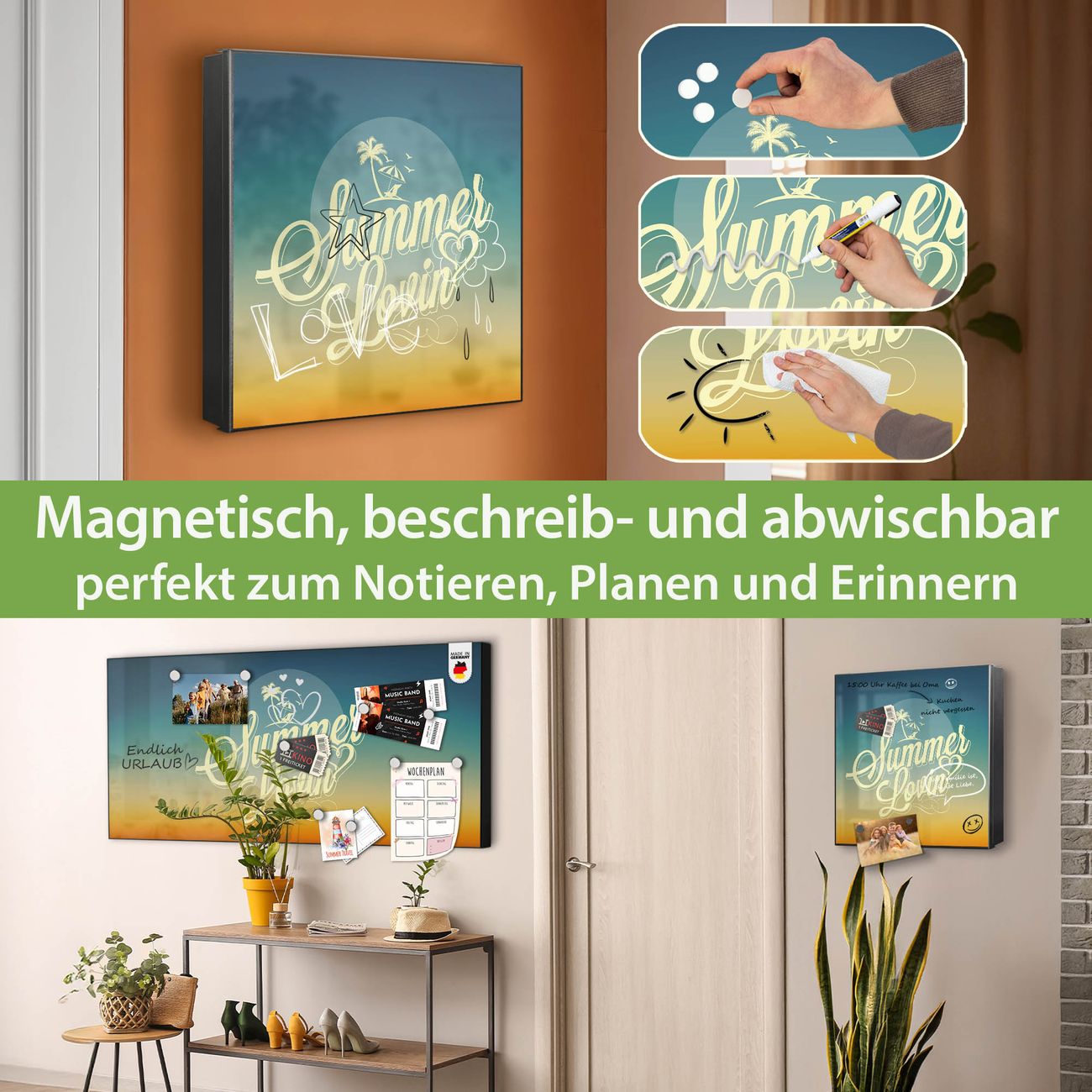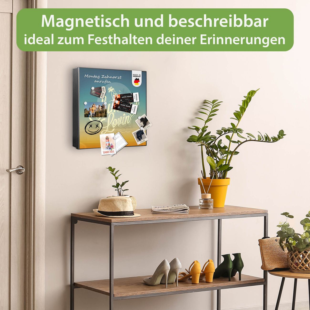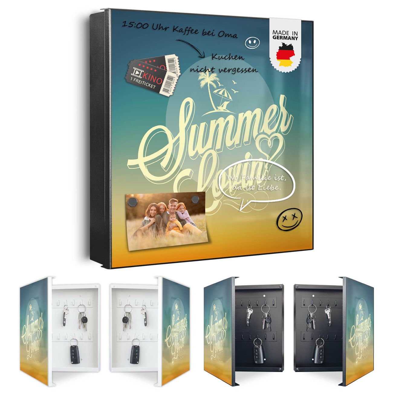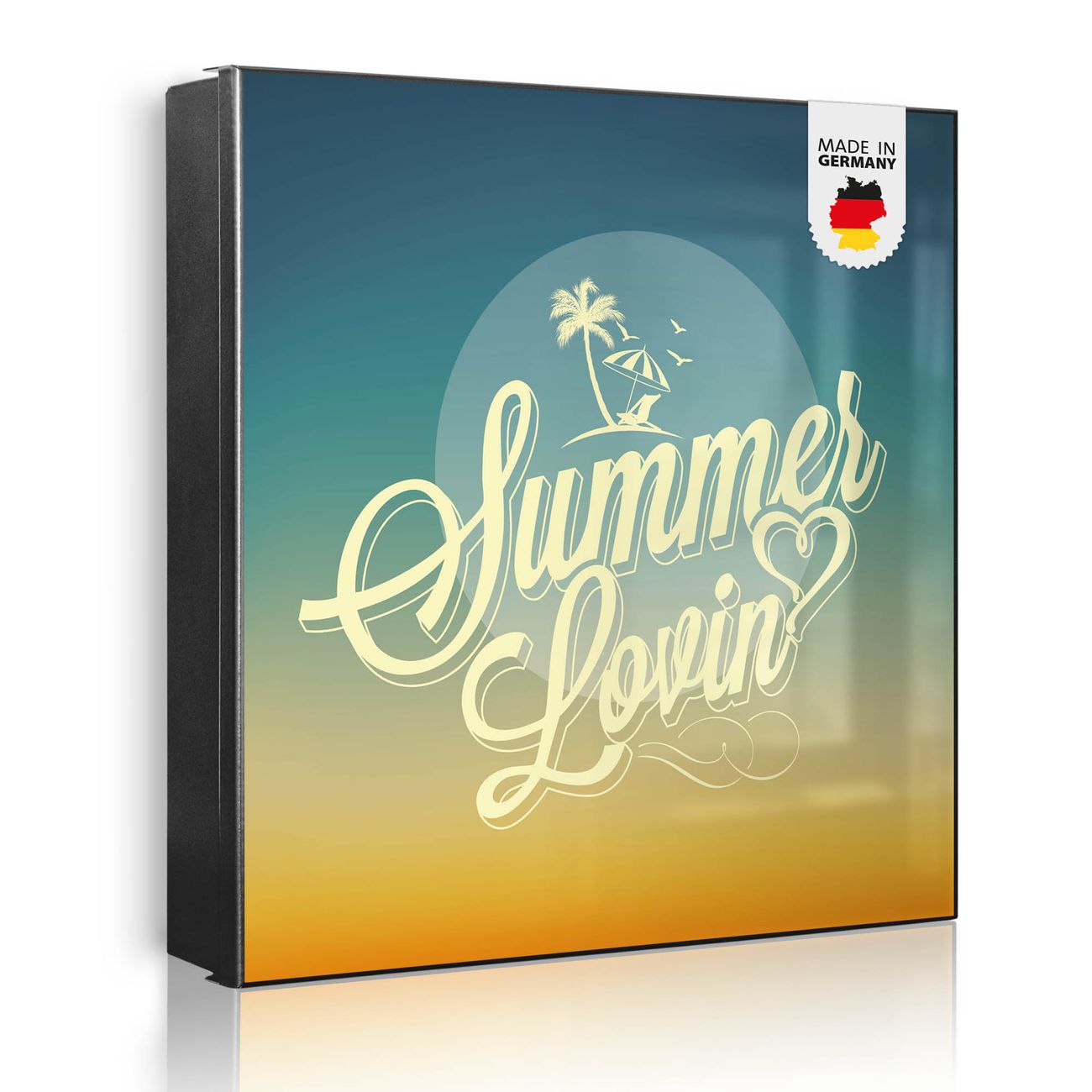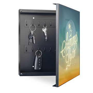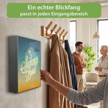 Bringe Ordnung und Eleganz in deinen Eingangsbereich mit dem banjado Schlüsselkasten Motiv Motiv Sommer Lovin. Die moderne Schlüsselbox kombiniert funktionales Design mit hochwertiger Verarbeitung und wird so zu einem echten Hingucker in Flur, Büro oder Ferienwohnung. ✅ Stilvolle Schlüsselaufbewahrung mit Motiv Motiv Sommer Lovin Der Design-Schlüsselkasten Motiv Motiv Sommer Lovin bietet Platz für bis zu 32 Schlüssel, die auf 4 stabilen Reihen mit je 8 Haken übersichtlich verstaut werden. Mit seinen kompakten Maßen von 30 x 30 x 5 cm passt die Schlüsselbox perfekt auch in kleinere Räume. Der schwarz lackierte Stahlkorpus mit rechts angeschlagenem Türscharnier harmoniert mit gedruckten Folie auf der Front und fügt sich nahtlos in jedes Wohnambiente ein. Ob als Schlüsselorganizer für Zuhause oder als praktische Lösung für Büros, Praxen und Gewerbe, der banjado Schlüsselkasten sorgt für Ordnung und Übersicht. Dank der magnetischen, mit Kreidestiften beschreibbaren Folie auf der Front kannst du Notizen anheften oder Termine direkt auf der Oberfläche festhalten. Die Schlüsselbox Motiv Motiv Sommer Lovin zur Wandmontage wird inklusive Befestigungsmaterial geliefert und ist schnell angebracht. So hast du deine Schlüssel jederzeit griffbereit und zugleich stilvoll verstaut. Mit diesem banjado Schlüsselkasten Motiv Motiv Sommer Lovin kombinierst du praktische Aufbewahrung mit stilvollem Wohndesign. Ob privat oder geschäftlich, die Schlüsselbox sorgt für mehr Ordnung, Übersicht und ein wohnliches Ambiente.Vorteile im Überblick