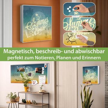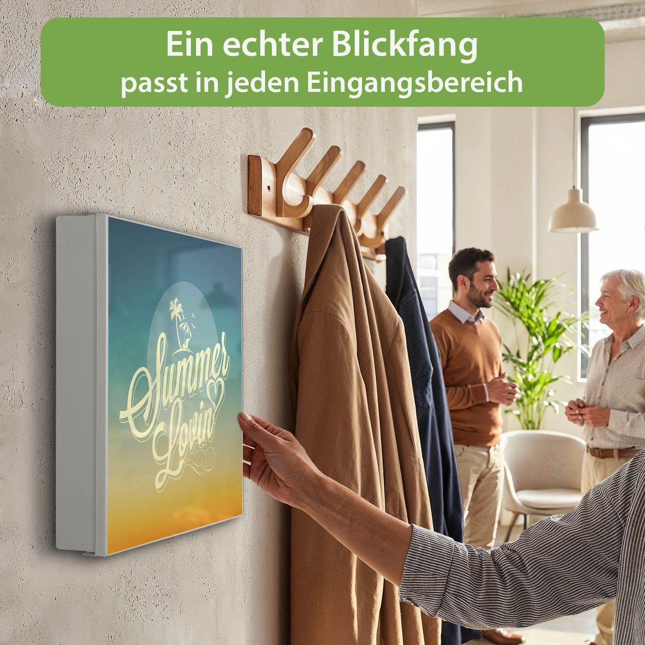 Bringe Ordnung und Eleganz in deinen Eingangsbereich mit dem banjado Schlüsselkasten Motiv Motiv Sommer Lovin. Die moderne Schlüsselbox kombiniert funktionales Design mit hochwertiger Verarbeitung und wird so zu einem echten Hingucker in Flur, Büro oder Ferienwohnung. ✅ Stilvolle Schlüsselaufbewahrung mit Motiv Motiv Sommer Lovin Der Design-Schlüsselkasten Motiv Motiv Sommer Lovin bietet Platz für bis zu 32 Schlüssel, die auf 4 stabilen Reihen mit je 8 Haken übersichtlich verstaut werden. Mit seinen kompakten Maßen von 30 x 30 x 5 cm passt die Schlüsselbox perfekt auch in kleinere Räume. Der weiß lackierte Stahlkorpus mit links angeschlagenem Türscharnier harmoniert mit gedruckten Folie auf der Front und fügt sich nahtlos in jedes Wohnambiente ein. Ob als Schlüsselorganizer für Zuhause oder als praktische Lösung für Büros, Praxen und Gewerbe, der banjado Schlüsselkasten sorgt für Ordnung und Übersicht. Dank der magnetischen, mit Kreidestiften beschreibbaren Folie auf der Front kannst du Notizen anheften oder Termine direkt auf der Oberfläche festhalten. Die Schlüsselbox Motiv Motiv Sommer Lovin zur Wandmontage wird inklusive Befestigungsmaterial geliefert und ist schnell angebracht. So hast du deine Schlüssel jederzeit griffbereit und zugleich stilvoll verstaut. Mit diesem banjado Schlüsselkasten Motiv Motiv Sommer Lovin kombinierst du praktische Aufbewahrung mit stilvollem Wohndesign. Ob privat oder geschäftlich, die Schlüsselbox sorgt für mehr Ordnung, Übersicht und ein wohnliches Ambiente.Vorteile im Überblick