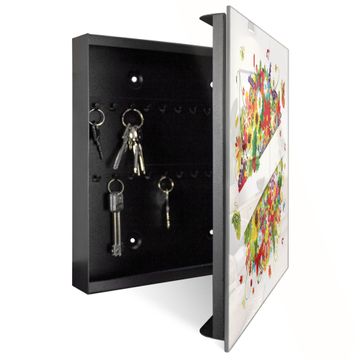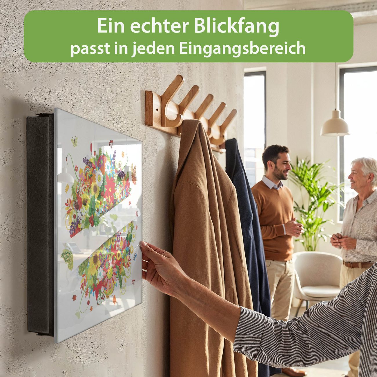 Bringe Ordnung und Eleganz in deinen Eingangsbereich mit dem banjado Schlüsselkasten Motiv Motiv Sommer. Die moderne Schlüsselbox kombiniert funktionales Design mit hochwertiger Verarbeitung und wird so zu einem echten Hingucker in Flur, Büro oder Ferienwohnung. ✅ Stilvolle Schlüsselaufbewahrung mit Glasfront im Motiv Motiv Sommer Der Design-Schlüsselkasten Motiv Motiv Sommer bietet Platz für bis zu 50 Schlüssel, die auf 5 stabilen Reihen mit je 10 Haken übersichtlich verstaut werden. Mit seinen kompakten Maßen von 30 x 30 x 5 cm passt die Schlüsselbox perfekt auch in kleinere Räume. Der schwarz lackierte Stahlkorpus mit rechts angeschlagenem Türscharnier harmoniert mit der Glasfront und fügt sich nahtlos in jedes Wohnambiente ein. Ob als Schlüsselorganizer für Zuhause oder als praktische Lösung für Büros, Praxen und Gewerbe, der banjado Schlüsselkasten sorgt für Ordnung und Übersicht. Dank der magnetischen, mit Kreidestiften beschreibbaren Glasfront kannst du Notizen anheften oder Termine direkt auf der Oberfläche festhalten. Die Schlüsselbox Motiv Motiv Sommer zur Wandmontage wird inklusive Befestigungsmaterial geliefert und ist schnell angebracht. So hast du deine Schlüssel jederzeit griffbereit und zugleich stilvoll verstaut. Mit diesem banjado Schlüsselkasten Motiv Motiv Sommer kombinierst du praktische Aufbewahrung mit stilvollem Wohndesign. Ob privat oder geschäftlich, die Schlüsselbox sorgt für mehr Ordnung, Übersicht und ein wohnliches Ambiente.Vorteile im Überblick