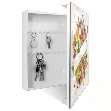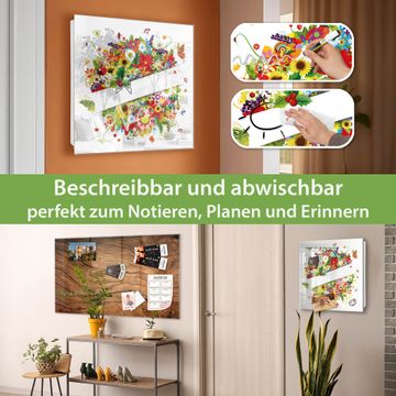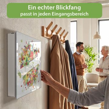 Bringe Ordnung und Eleganz in deinen Eingangsbereich mit dem banjado Schlüsselkasten Motiv Motiv Sommer. Die moderne Schlüsselbox kombiniert funktionales Design mit hochwertiger Verarbeitung und wird so zu einem echten Hingucker in Flur, Büro oder Ferienwohnung. ✅ Stilvolle Schlüsselaufbewahrung mit Glasfront im Motiv Motiv Sommer Der Design-Schlüsselkasten Motiv Motiv Sommer bietet Platz für bis zu 50 Schlüssel, die auf 5 stabilen Reihen mit je 10 Haken übersichtlich verstaut werden. Mit seinen kompakten Maßen von 30 x 30 x 5 cm passt die Schlüsselbox perfekt auch in kleinere Räume. Der weiß lackierte Stahlkorpus mit rechts angeschlagenem Türscharnier harmoniert mit der Glasfront und fügt sich nahtlos in jedes Wohnambiente ein. Ob als Schlüsselorganizer für Zuhause oder als praktische Lösung für Büros, Praxen und Gewerbe, der banjado Schlüsselkasten sorgt für Ordnung und Übersicht. Dank der magnetischen, mit Kreidestiften beschreibbaren Glasfront kannst du Notizen anheften oder Termine direkt auf der Oberfläche festhalten. Die Schlüsselbox Motiv Motiv Sommer zur Wandmontage wird inklusive Befestigungsmaterial geliefert und ist schnell angebracht. So hast du deine Schlüssel jederzeit griffbereit und zugleich stilvoll verstaut. Mit diesem banjado Schlüsselkasten Motiv Motiv Sommer kombinierst du praktische Aufbewahrung mit stilvollem Wohndesign. Ob privat oder geschäftlich, die Schlüsselbox sorgt für mehr Ordnung, Übersicht und ein wohnliches Ambiente.Vorteile im Überblick