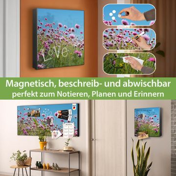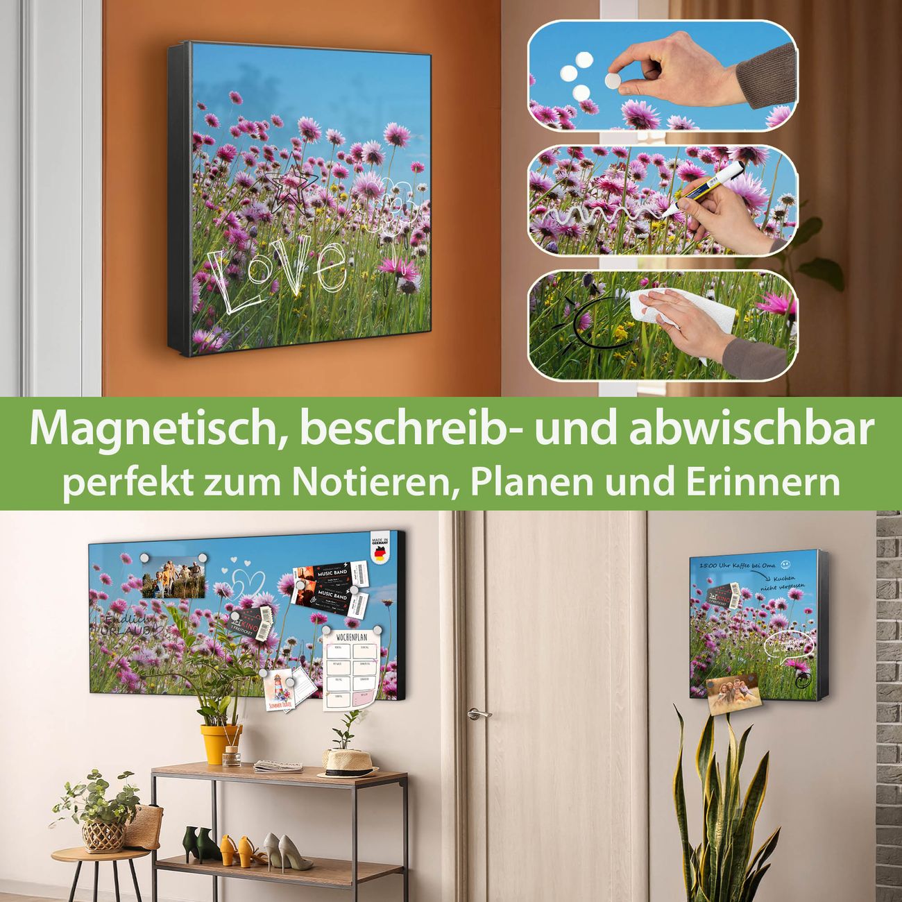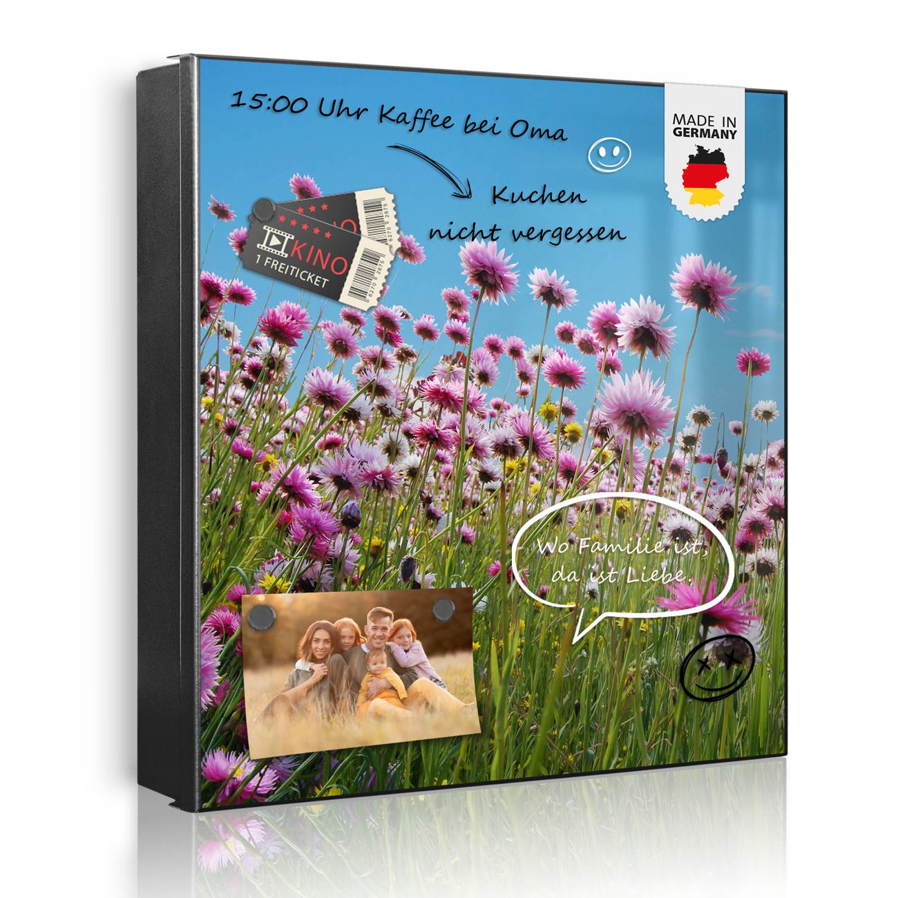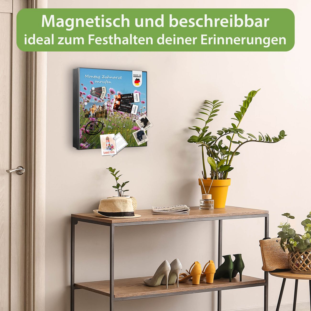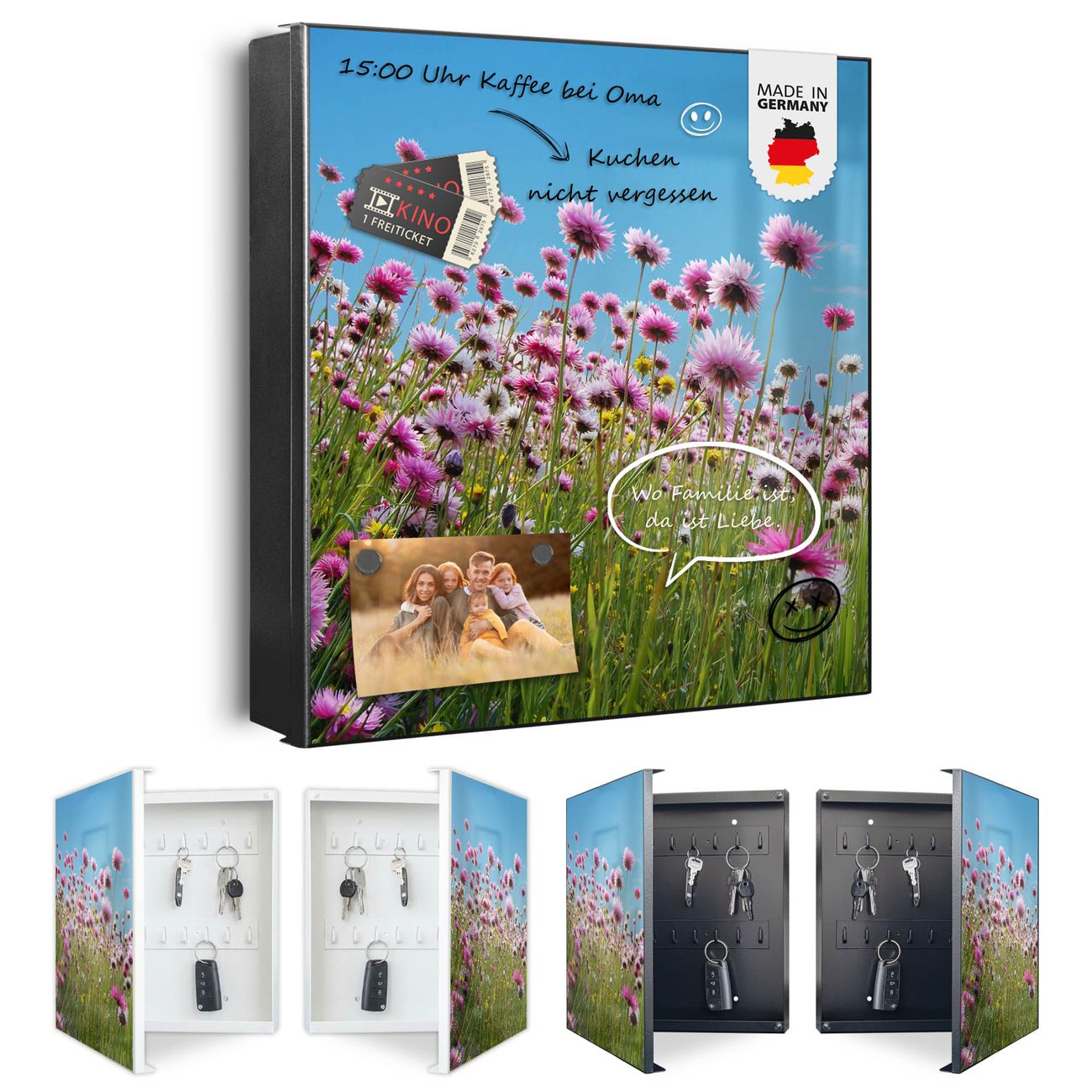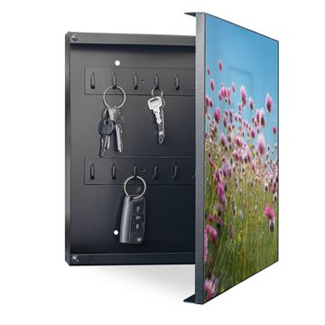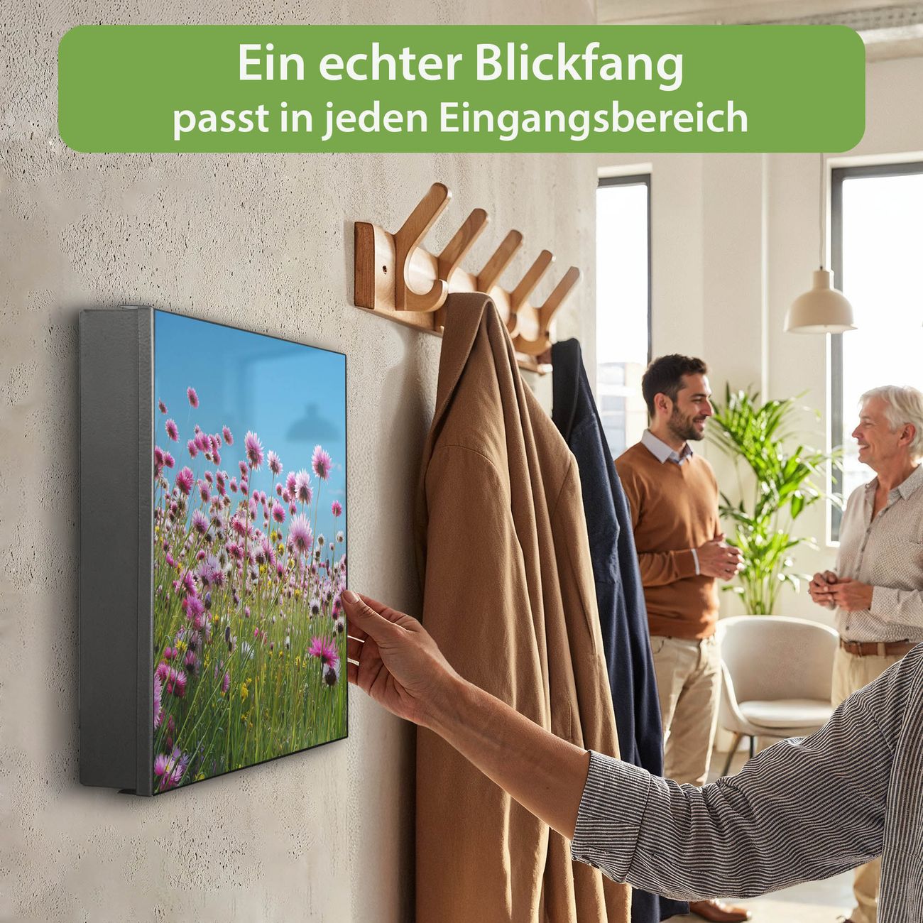 Bringe Ordnung und Eleganz in deinen Eingangsbereich mit dem banjado Schlüsselkasten Motiv Motiv Sommerblumen. Die moderne Schlüsselbox kombiniert funktionales Design mit hochwertiger Verarbeitung und wird so zu einem echten Hingucker in Flur, Büro oder Ferienwohnung. ✅ Stilvolle Schlüsselaufbewahrung mit Motiv Motiv Sommerblumen Der Design-Schlüsselkasten Motiv Motiv Sommerblumen bietet Platz für bis zu 32 Schlüssel, die auf 4 stabilen Reihen mit je 8 Haken übersichtlich verstaut werden. Mit seinen kompakten Maßen von 30 x 30 x 5 cm passt die Schlüsselbox perfekt auch in kleinere Räume. Der schwarz lackierte Stahlkorpus mit rechts angeschlagenem Türscharnier harmoniert mit gedruckten Folie auf der Front und fügt sich nahtlos in jedes Wohnambiente ein. Ob als Schlüsselorganizer für Zuhause oder als praktische Lösung für Büros, Praxen und Gewerbe, der banjado Schlüsselkasten sorgt für Ordnung und Übersicht. Dank der magnetischen, mit Kreidestiften beschreibbaren Folie auf der Front kannst du Notizen anheften oder Termine direkt auf der Oberfläche festhalten. Die Schlüsselbox Motiv Motiv Sommerblumen zur Wandmontage wird inklusive Befestigungsmaterial geliefert und ist schnell angebracht. So hast du deine Schlüssel jederzeit griffbereit und zugleich stilvoll verstaut. Mit diesem banjado Schlüsselkasten Motiv Motiv Sommerblumen kombinierst du praktische Aufbewahrung mit stilvollem Wohndesign. Ob privat oder geschäftlich, die Schlüsselbox sorgt für mehr Ordnung, Übersicht und ein wohnliches Ambiente.Vorteile im Überblick