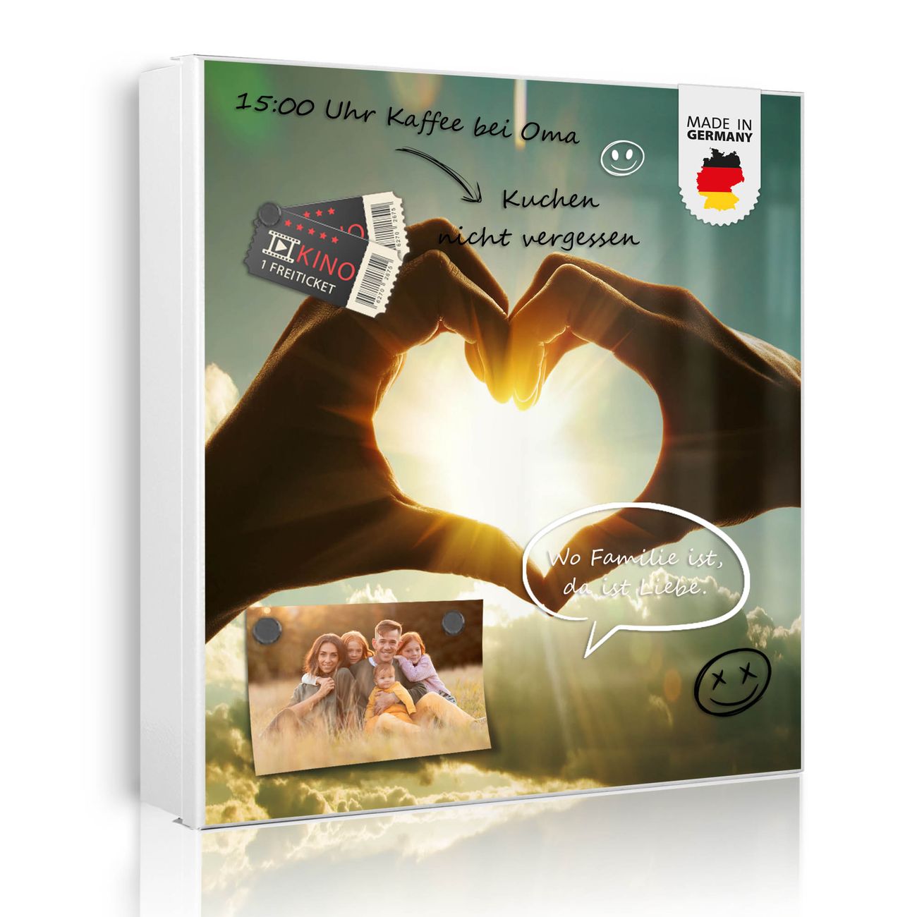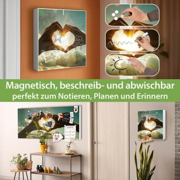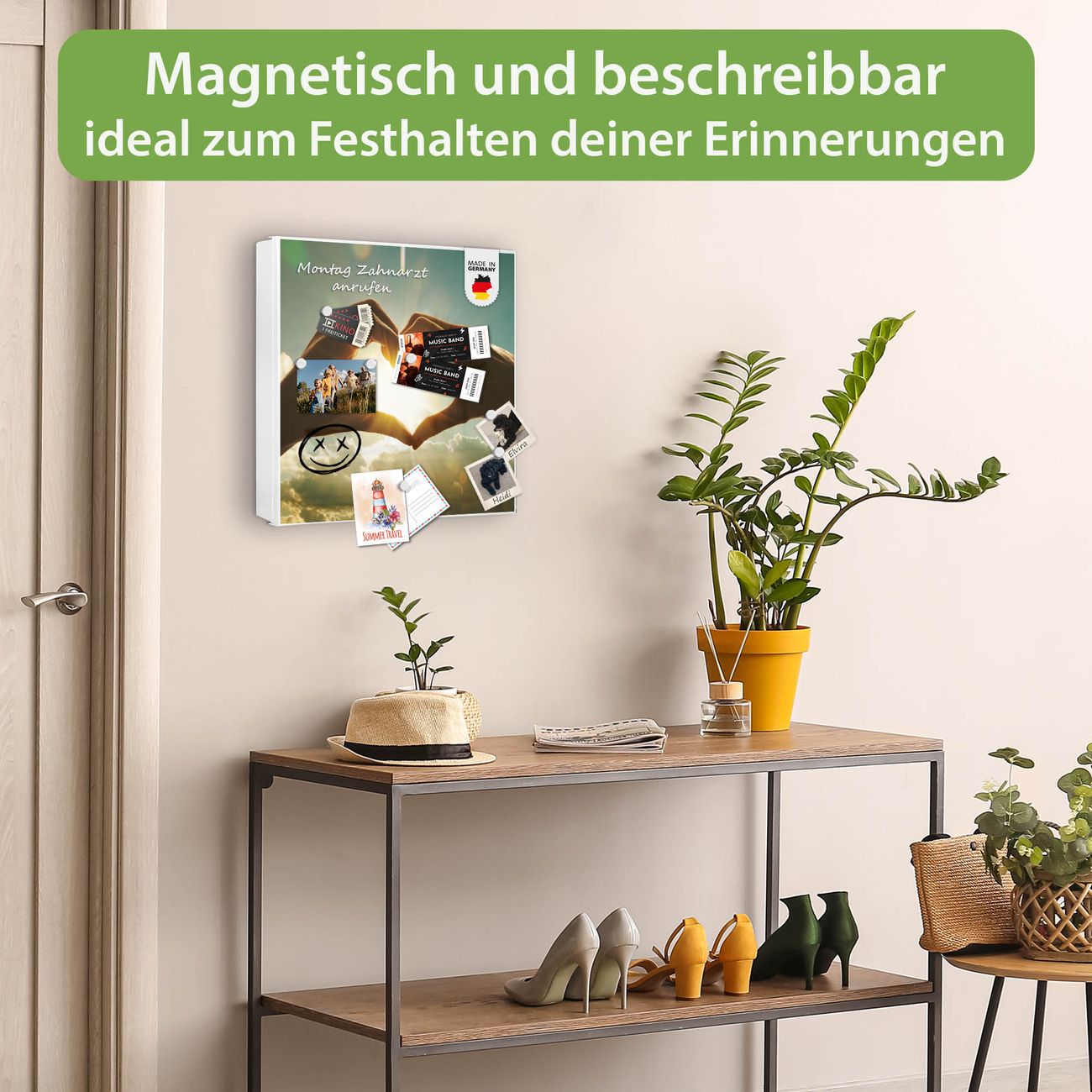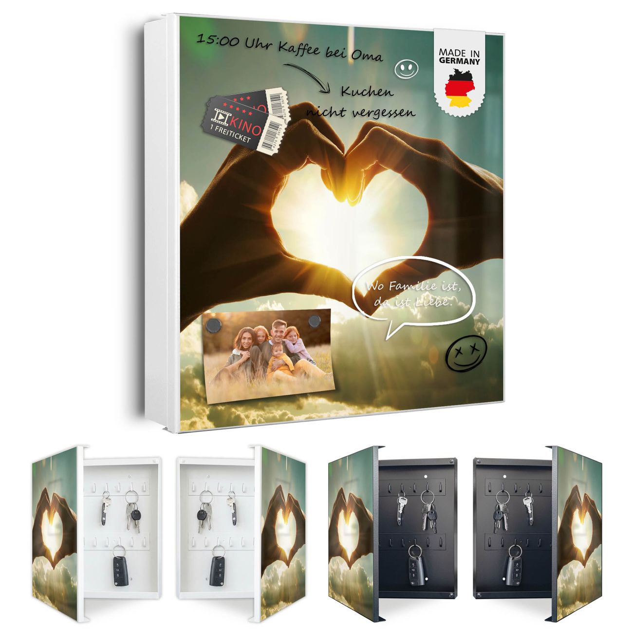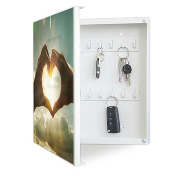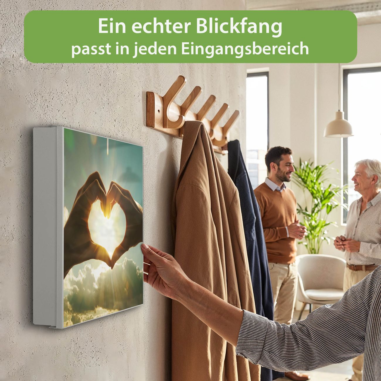 Bringe Ordnung und Eleganz in deinen Eingangsbereich mit dem banjado Schlüsselkasten Motiv Motiv Sonne im Herzen. Die moderne Schlüsselbox kombiniert funktionales Design mit hochwertiger Verarbeitung und wird so zu einem echten Hingucker in Flur, Büro oder Ferienwohnung. ✅ Stilvolle Schlüsselaufbewahrung mit Motiv Motiv Sonne im Herzen Der Design-Schlüsselkasten Motiv Motiv Sonne im Herzen bietet Platz für bis zu 32 Schlüssel, die auf 4 stabilen Reihen mit je 8 Haken übersichtlich verstaut werden. Mit seinen kompakten Maßen von 30 x 30 x 5 cm passt die Schlüsselbox perfekt auch in kleinere Räume. Der weiß lackierte Stahlkorpus mit links angeschlagenem Türscharnier harmoniert mit gedruckten Folie auf der Front und fügt sich nahtlos in jedes Wohnambiente ein. Ob als Schlüsselorganizer für Zuhause oder als praktische Lösung für Büros, Praxen und Gewerbe, der banjado Schlüsselkasten sorgt für Ordnung und Übersicht. Dank der magnetischen, mit Kreidestiften beschreibbaren Folie auf der Front kannst du Notizen anheften oder Termine direkt auf der Oberfläche festhalten. Die Schlüsselbox Motiv Motiv Sonne im Herzen zur Wandmontage wird inklusive Befestigungsmaterial geliefert und ist schnell angebracht. So hast du deine Schlüssel jederzeit griffbereit und zugleich stilvoll verstaut. Mit diesem banjado Schlüsselkasten Motiv Motiv Sonne im Herzen kombinierst du praktische Aufbewahrung mit stilvollem Wohndesign. Ob privat oder geschäftlich, die Schlüsselbox sorgt für mehr Ordnung, Übersicht und ein wohnliches Ambiente.Vorteile im Überblick