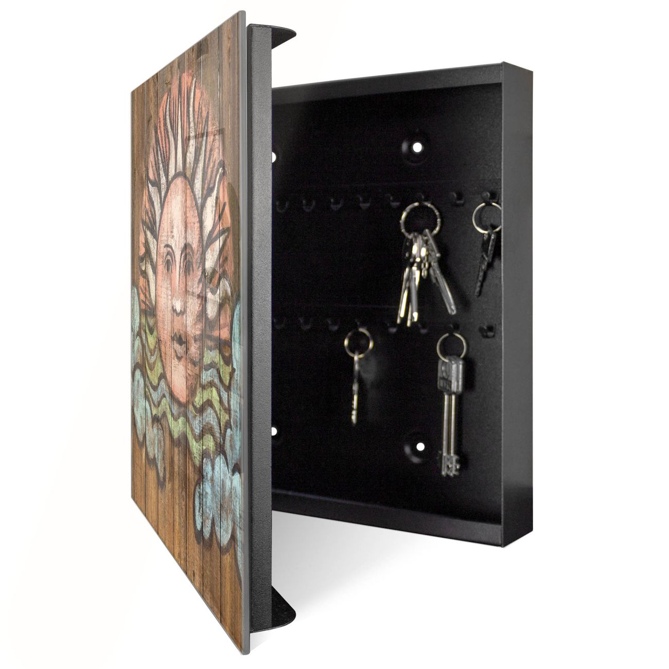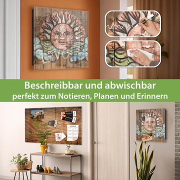Bringe Ordnung und Eleganz in deinen Eingangsbereich mit dem banjado Schlüsselkasten Motiv Motiv Sonne. Die moderne Schlüsselbox kombiniert funktionales Design mit hochwertiger Verarbeitung und wird so zu einem echten Hingucker in Flur, Büro oder Ferienwohnung. ✅ Stilvolle Schlüsselaufbewahrung mit Glasfront im Motiv Motiv Sonne Der Design-Schlüsselkasten Motiv Motiv Sonne bietet Platz für bis zu 50 Schlüssel, die auf 5 stabilen Reihen mit je 10 Haken übersichtlich verstaut werden. Mit seinen kompakten Maßen von 30 x 30 x 5 cm passt die Schlüsselbox perfekt auch in kleinere Räume. Der schwarz lackierte Stahlkorpus mit rechts angeschlagenem Türscharnier harmoniert mit der Glasfront und fügt sich nahtlos in jedes Wohnambiente ein. Ob als Schlüsselorganizer für Zuhause oder als praktische Lösung für Büros, Praxen und Gewerbe, der banjado Schlüsselkasten sorgt für Ordnung und Übersicht. Dank der magnetischen, mit Kreidestiften beschreibbaren Glasfront kannst du Notizen anheften oder Termine direkt auf der Oberfläche festhalten. Die Schlüsselbox Motiv Motiv Sonne zur Wandmontage wird inklusive Befestigungsmaterial geliefert und ist schnell angebracht. So hast du deine Schlüssel jederzeit griffbereit und zugleich stilvoll verstaut. Mit diesem banjado Schlüsselkasten Motiv Motiv Sonne kombinierst du praktische Aufbewahrung mit stilvollem Wohndesign. Ob privat oder geschäftlich, die Schlüsselbox sorgt für mehr Ordnung, Übersicht und ein wohnliches Ambiente.Vorteile im Überblick