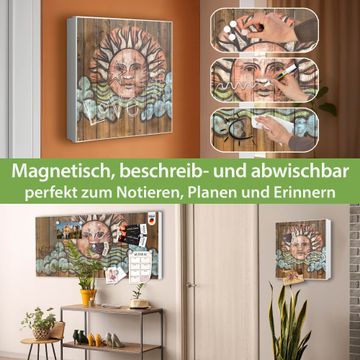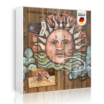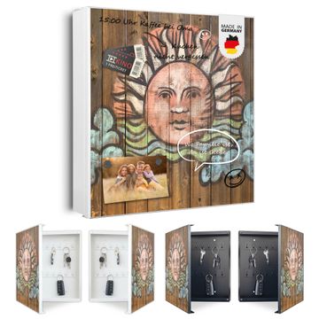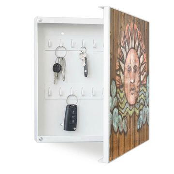 Bringe Ordnung und Eleganz in deinen Eingangsbereich mit dem banjado Schlüsselkasten Motiv Motiv Sonne. Die moderne Schlüsselbox kombiniert funktionales Design mit hochwertiger Verarbeitung und wird so zu einem echten Hingucker in Flur, Büro oder Ferienwohnung. ✅ Stilvolle Schlüsselaufbewahrung mit Motiv Motiv Sonne Der Design-Schlüsselkasten Motiv Motiv Sonne bietet Platz für bis zu 32 Schlüssel, die auf 4 stabilen Reihen mit je 8 Haken übersichtlich verstaut werden. Mit seinen kompakten Maßen von 30 x 30 x 5 cm passt die Schlüsselbox perfekt auch in kleinere Räume. Der weiß lackierte Stahlkorpus mit rechts angeschlagenem Türscharnier harmoniert mit gedruckten Folie auf der Front und fügt sich nahtlos in jedes Wohnambiente ein. Ob als Schlüsselorganizer für Zuhause oder als praktische Lösung für Büros, Praxen und Gewerbe, der banjado Schlüsselkasten sorgt für Ordnung und Übersicht. Dank der magnetischen, mit Kreidestiften beschreibbaren Folie auf der Front kannst du Notizen anheften oder Termine direkt auf der Oberfläche festhalten. Die Schlüsselbox Motiv Motiv Sonne zur Wandmontage wird inklusive Befestigungsmaterial geliefert und ist schnell angebracht. So hast du deine Schlüssel jederzeit griffbereit und zugleich stilvoll verstaut. Mit diesem banjado Schlüsselkasten Motiv Motiv Sonne kombinierst du praktische Aufbewahrung mit stilvollem Wohndesign. Ob privat oder geschäftlich, die Schlüsselbox sorgt für mehr Ordnung, Übersicht und ein wohnliches Ambiente.Vorteile im Überblick