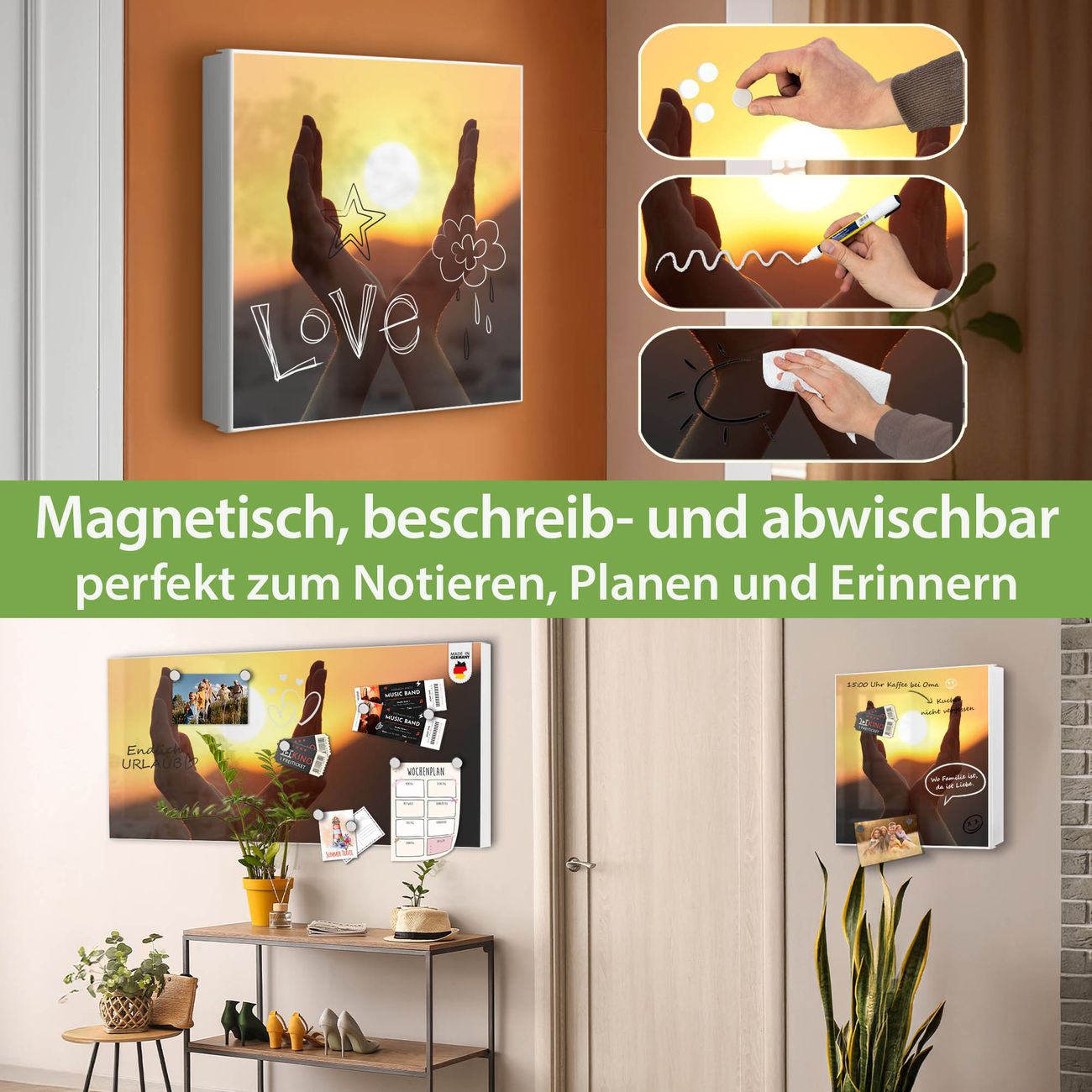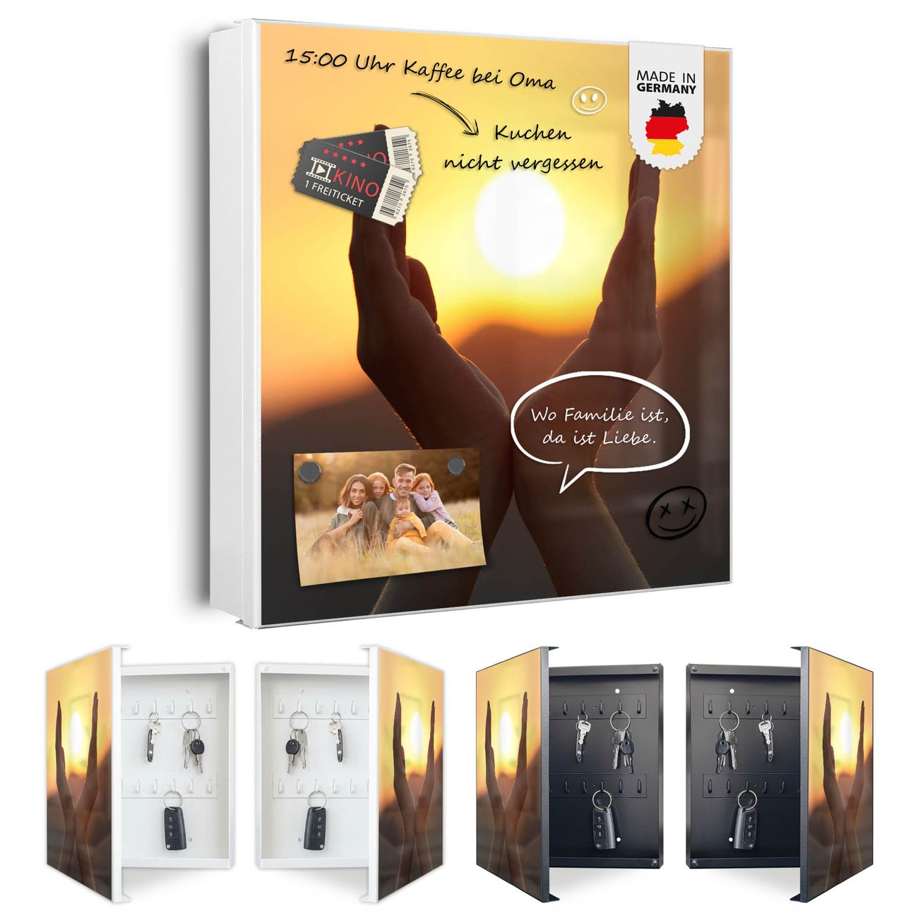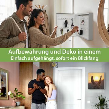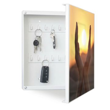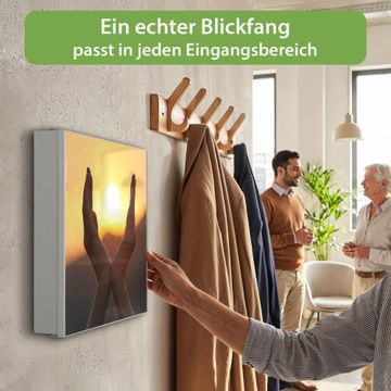 Bringe Ordnung und Eleganz in deinen Eingangsbereich mit dem banjado Schlüsselkasten Motiv Motiv Sonnenanbeter. Die moderne Schlüsselbox kombiniert funktionales Design mit hochwertiger Verarbeitung und wird so zu einem echten Hingucker in Flur, Büro oder Ferienwohnung. ✅ Stilvolle Schlüsselaufbewahrung mit Motiv Motiv Sonnenanbeter Der Design-Schlüsselkasten Motiv Motiv Sonnenanbeter bietet Platz für bis zu 32 Schlüssel, die auf 4 stabilen Reihen mit je 8 Haken übersichtlich verstaut werden. Mit seinen kompakten Maßen von 30 x 30 x 5 cm passt die Schlüsselbox perfekt auch in kleinere Räume. Der weiß lackierte Stahlkorpus mit rechts angeschlagenem Türscharnier harmoniert mit gedruckten Folie auf der Front und fügt sich nahtlos in jedes Wohnambiente ein. Ob als Schlüsselorganizer für Zuhause oder als praktische Lösung für Büros, Praxen und Gewerbe, der banjado Schlüsselkasten sorgt für Ordnung und Übersicht. Dank der magnetischen, mit Kreidestiften beschreibbaren Folie auf der Front kannst du Notizen anheften oder Termine direkt auf der Oberfläche festhalten. Die Schlüsselbox Motiv Motiv Sonnenanbeter zur Wandmontage wird inklusive Befestigungsmaterial geliefert und ist schnell angebracht. So hast du deine Schlüssel jederzeit griffbereit und zugleich stilvoll verstaut. Mit diesem banjado Schlüsselkasten Motiv Motiv Sonnenanbeter kombinierst du praktische Aufbewahrung mit stilvollem Wohndesign. Ob privat oder geschäftlich, die Schlüsselbox sorgt für mehr Ordnung, Übersicht und ein wohnliches Ambiente.Vorteile im Überblick