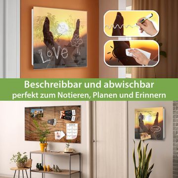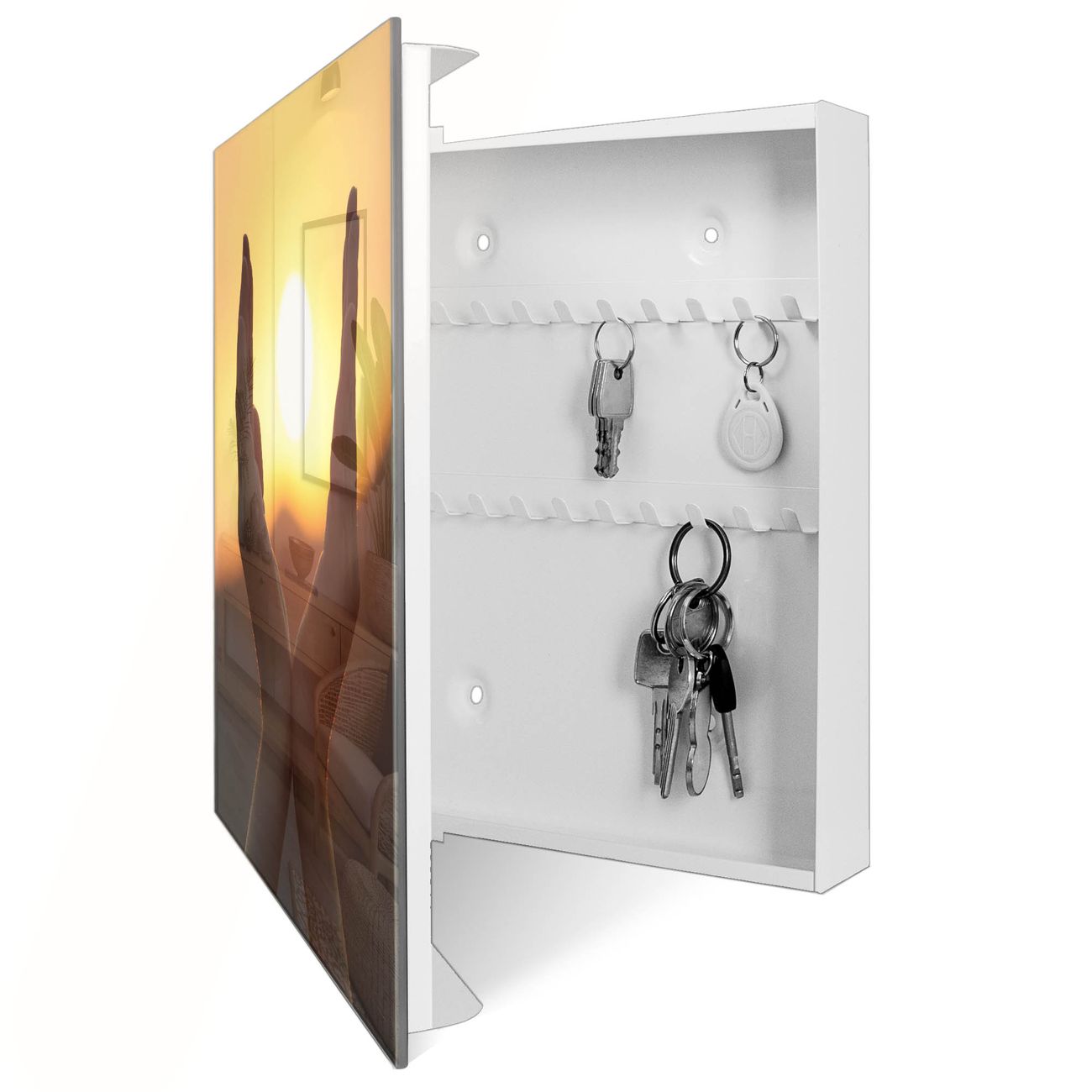 Bringe Ordnung und Eleganz in deinen Eingangsbereich mit dem banjado Schlüsselkasten Motiv Motiv Sonnenanbeter. Die moderne Schlüsselbox kombiniert funktionales Design mit hochwertiger Verarbeitung und wird so zu einem echten Hingucker in Flur, Büro oder Ferienwohnung. ✅ Stilvolle Schlüsselaufbewahrung mit Glasfront im Motiv Motiv Sonnenanbeter Der Design-Schlüsselkasten Motiv Motiv Sonnenanbeter bietet Platz für bis zu 50 Schlüssel, die auf 5 stabilen Reihen mit je 10 Haken übersichtlich verstaut werden. Mit seinen kompakten Maßen von 30 x 30 x 5 cm passt die Schlüsselbox perfekt auch in kleinere Räume. Der weiß lackierte Stahlkorpus mit rechts angeschlagenem Türscharnier harmoniert mit der Glasfront und fügt sich nahtlos in jedes Wohnambiente ein. Ob als Schlüsselorganizer für Zuhause oder als praktische Lösung für Büros, Praxen und Gewerbe, der banjado Schlüsselkasten sorgt für Ordnung und Übersicht. Dank der magnetischen, mit Kreidestiften beschreibbaren Glasfront kannst du Notizen anheften oder Termine direkt auf der Oberfläche festhalten. Die Schlüsselbox Motiv Motiv Sonnenanbeter zur Wandmontage wird inklusive Befestigungsmaterial geliefert und ist schnell angebracht. So hast du deine Schlüssel jederzeit griffbereit und zugleich stilvoll verstaut. Mit diesem banjado Schlüsselkasten Motiv Motiv Sonnenanbeter kombinierst du praktische Aufbewahrung mit stilvollem Wohndesign. Ob privat oder geschäftlich, die Schlüsselbox sorgt für mehr Ordnung, Übersicht und ein wohnliches Ambiente.Vorteile im Überblick