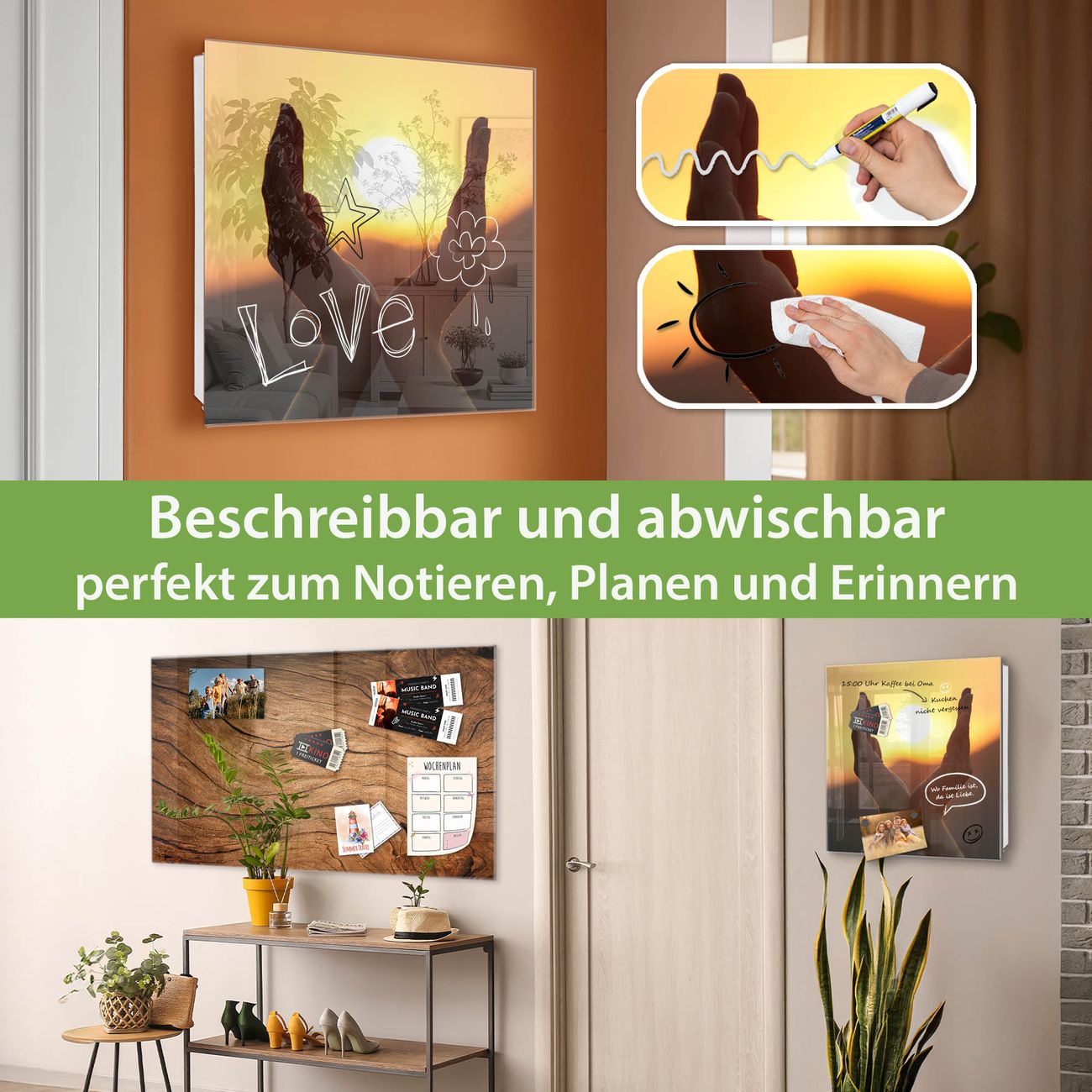 ✅ Magnetisch und mit Kreidestift beschreibbar, gehärtetes Glas, links angeschlagene TürOrdnung und Design in einem