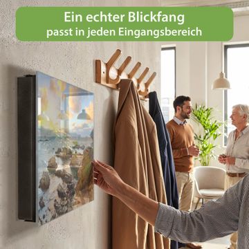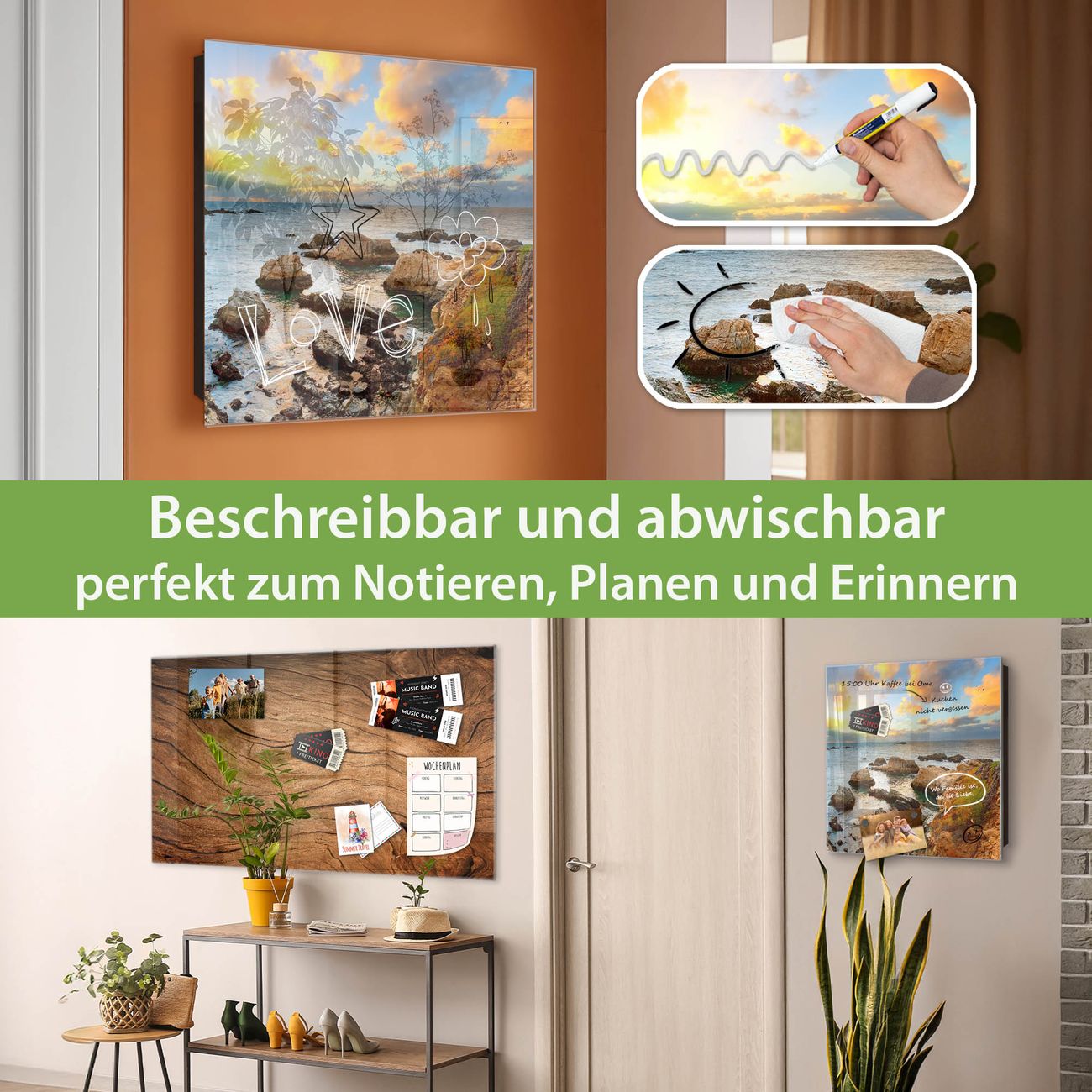 Bringe Ordnung und Eleganz in deinen Eingangsbereich mit dem banjado Schlüsselkasten Motiv Motiv Sonnenaufgang am Meer. Die moderne Schlüsselbox kombiniert funktionales Design mit hochwertiger Verarbeitung und wird so zu einem echten Hingucker in Flur, Büro oder Ferienwohnung. ✅ Stilvolle Schlüsselaufbewahrung mit Glasfront im Motiv Motiv Sonnenaufgang am Meer Der Design-Schlüsselkasten Motiv Motiv Sonnenaufgang am Meer bietet Platz für bis zu 50 Schlüssel, die auf 5 stabilen Reihen mit je 10 Haken übersichtlich verstaut werden. Mit seinen kompakten Maßen von 30 x 30 x 5 cm passt die Schlüsselbox perfekt auch in kleinere Räume. Der schwarz lackierte Stahlkorpus mit rechts angeschlagenem Türscharnier harmoniert mit der Glasfront und fügt sich nahtlos in jedes Wohnambiente ein. Ob als Schlüsselorganizer für Zuhause oder als praktische Lösung für Büros, Praxen und Gewerbe, der banjado Schlüsselkasten sorgt für Ordnung und Übersicht. Dank der magnetischen, mit Kreidestiften beschreibbaren Glasfront kannst du Notizen anheften oder Termine direkt auf der Oberfläche festhalten. Die Schlüsselbox Motiv Motiv Sonnenaufgang am Meer zur Wandmontage wird inklusive Befestigungsmaterial geliefert und ist schnell angebracht. So hast du deine Schlüssel jederzeit griffbereit und zugleich stilvoll verstaut. Mit diesem banjado Schlüsselkasten Motiv Motiv Sonnenaufgang am Meer kombinierst du praktische Aufbewahrung mit stilvollem Wohndesign. Ob privat oder geschäftlich, die Schlüsselbox sorgt für mehr Ordnung, Übersicht und ein wohnliches Ambiente.Vorteile im Überblick