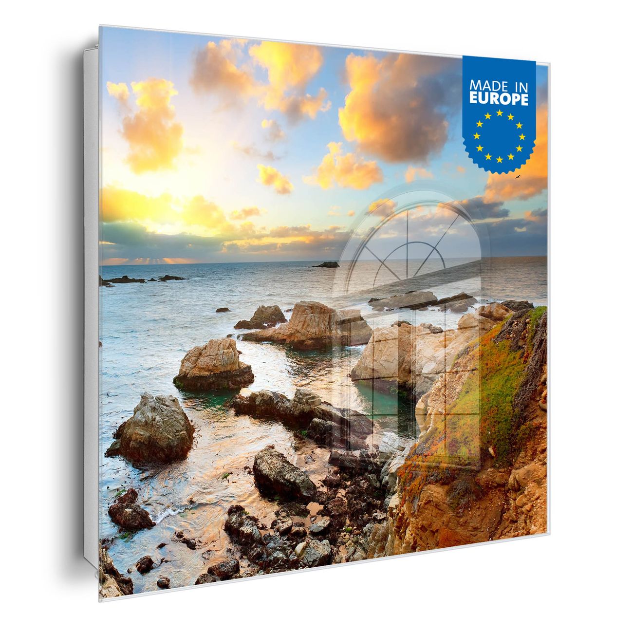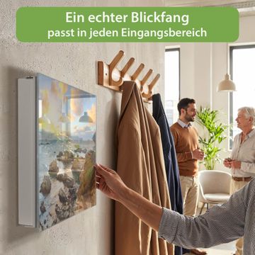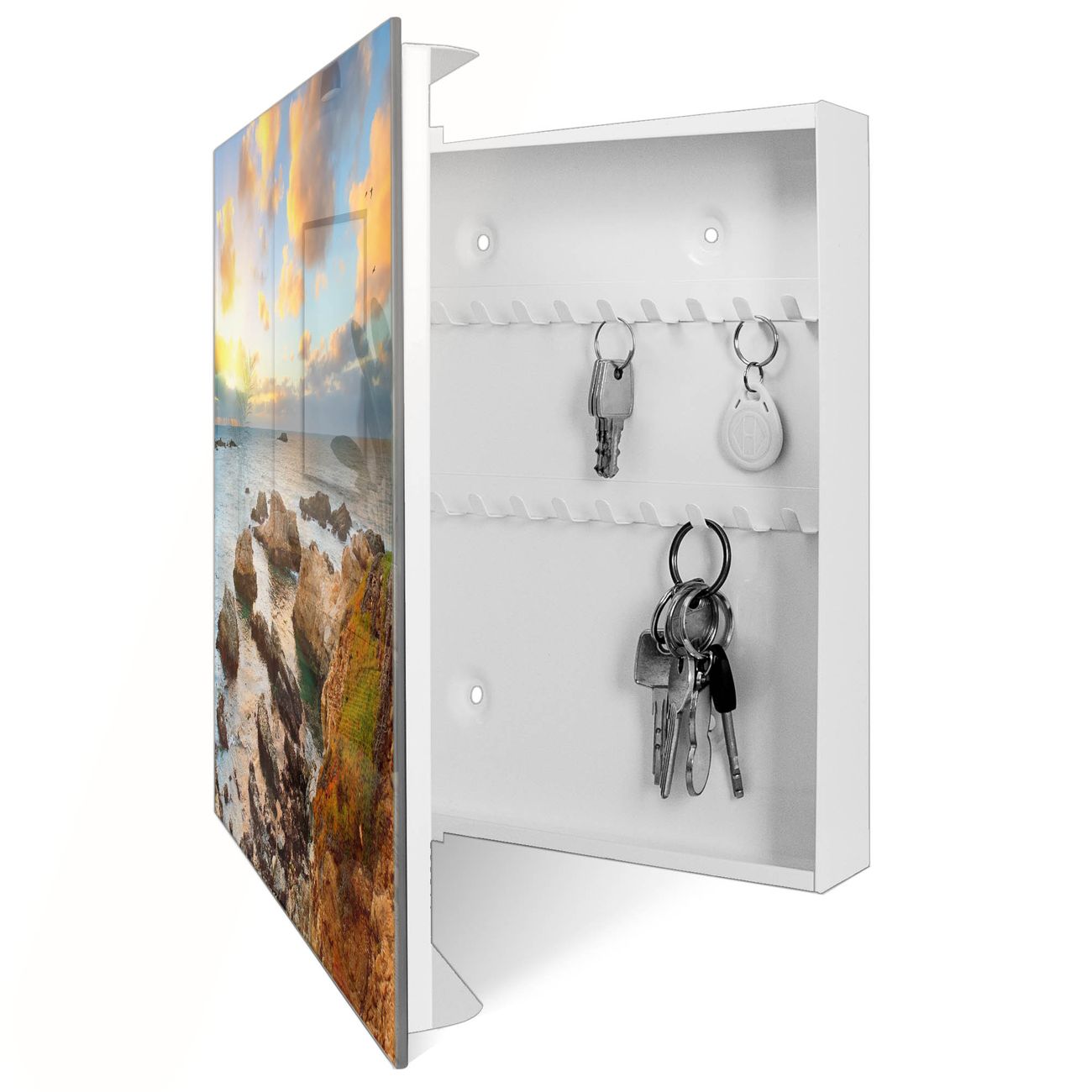 Bringe Ordnung und Eleganz in deinen Eingangsbereich mit dem banjado Schlüsselkasten Motiv Motiv Sonnenaufgang am Meer. Die moderne Schlüsselbox kombiniert funktionales Design mit hochwertiger Verarbeitung und wird so zu einem echten Hingucker in Flur, Büro oder Ferienwohnung. ✅ Stilvolle Schlüsselaufbewahrung mit Glasfront im Motiv Motiv Sonnenaufgang am Meer Der Design-Schlüsselkasten Motiv Motiv Sonnenaufgang am Meer bietet Platz für bis zu 50 Schlüssel, die auf 5 stabilen Reihen mit je 10 Haken übersichtlich verstaut werden. Mit seinen kompakten Maßen von 30 x 30 x 5 cm passt die Schlüsselbox perfekt auch in kleinere Räume. Der weiß lackierte Stahlkorpus mit rechts angeschlagenem Türscharnier harmoniert mit der Glasfront und fügt sich nahtlos in jedes Wohnambiente ein. Ob als Schlüsselorganizer für Zuhause oder als praktische Lösung für Büros, Praxen und Gewerbe, der banjado Schlüsselkasten sorgt für Ordnung und Übersicht. Dank der magnetischen, mit Kreidestiften beschreibbaren Glasfront kannst du Notizen anheften oder Termine direkt auf der Oberfläche festhalten. Die Schlüsselbox Motiv Motiv Sonnenaufgang am Meer zur Wandmontage wird inklusive Befestigungsmaterial geliefert und ist schnell angebracht. So hast du deine Schlüssel jederzeit griffbereit und zugleich stilvoll verstaut. Mit diesem banjado Schlüsselkasten Motiv Motiv Sonnenaufgang am Meer kombinierst du praktische Aufbewahrung mit stilvollem Wohndesign. Ob privat oder geschäftlich, die Schlüsselbox sorgt für mehr Ordnung, Übersicht und ein wohnliches Ambiente.Vorteile im Überblick