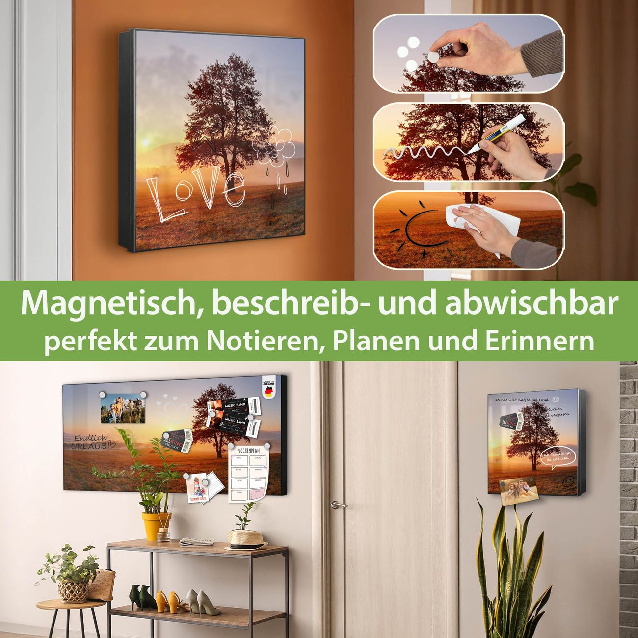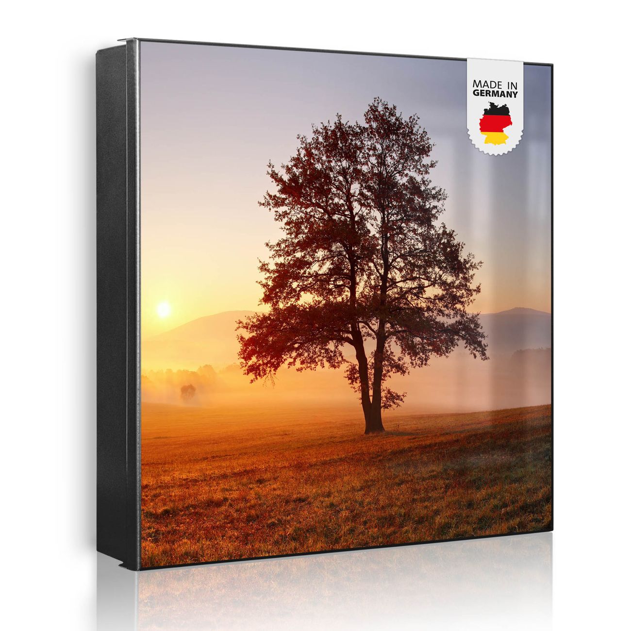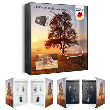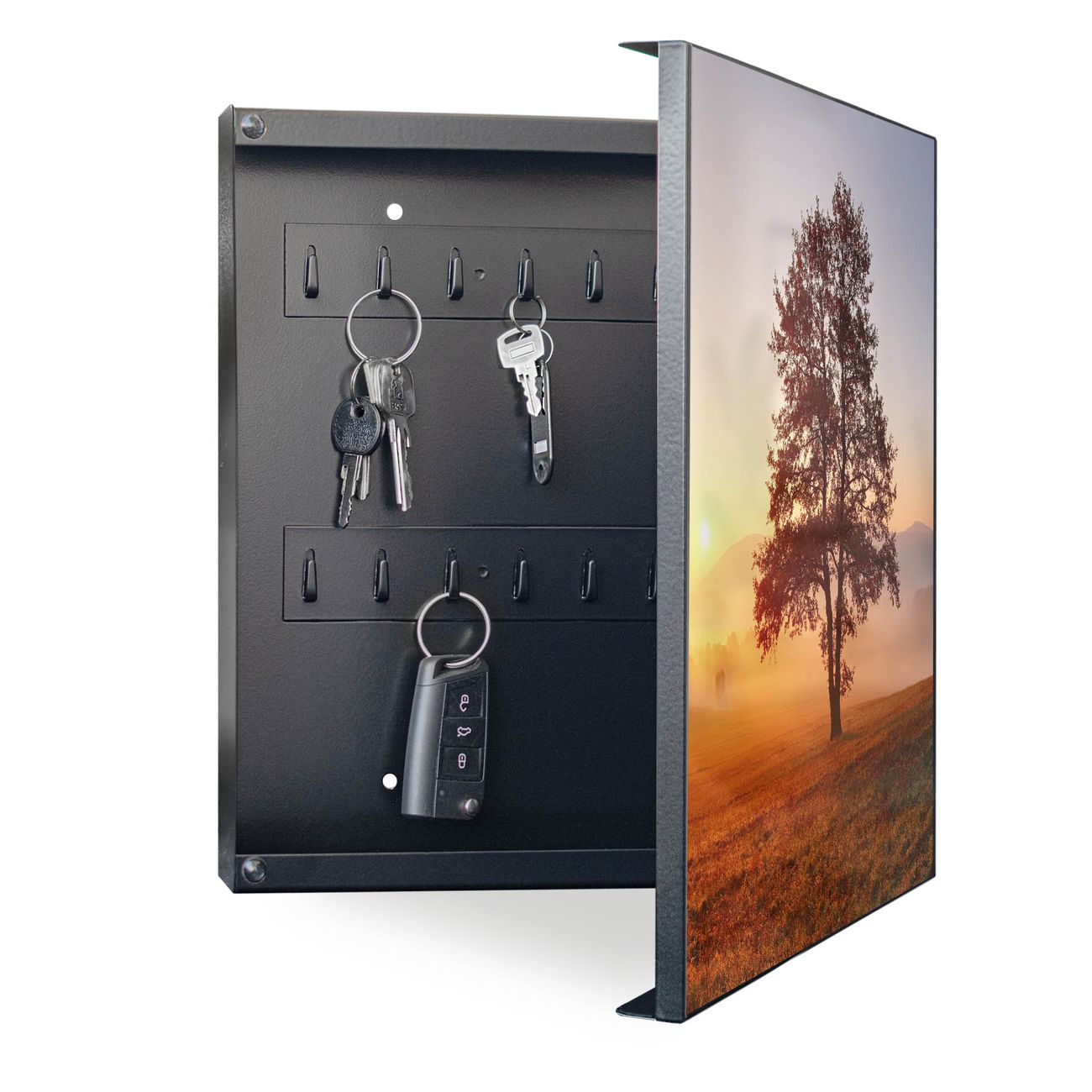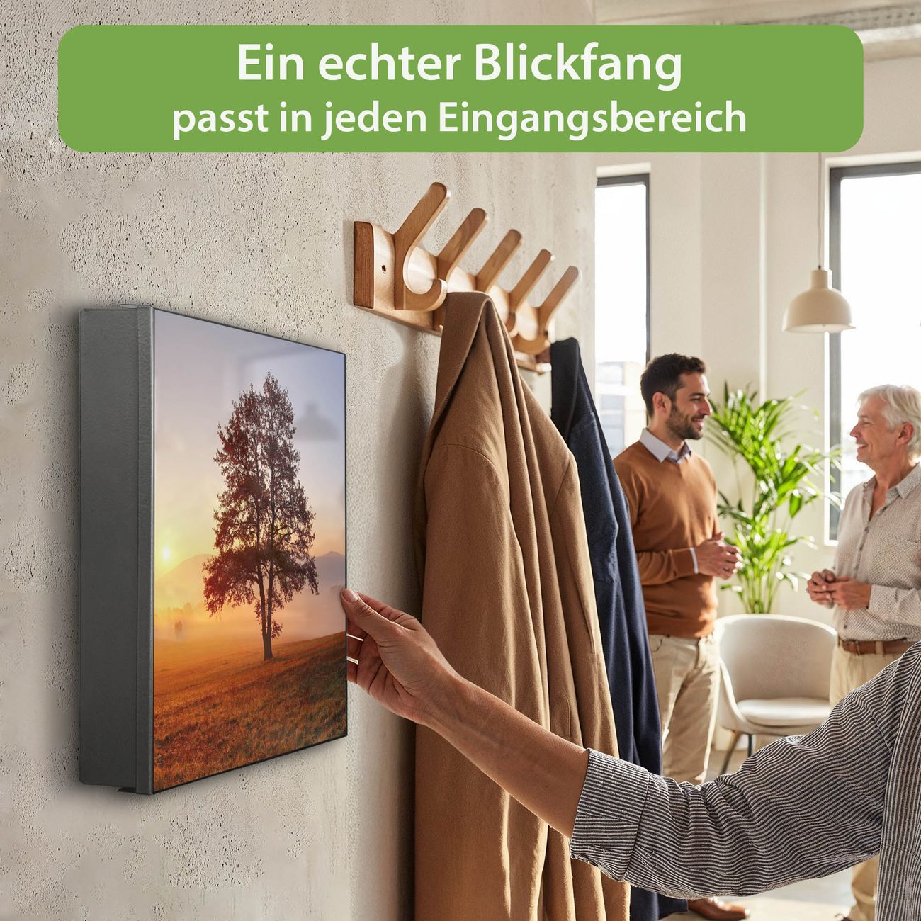 Bringe Ordnung und Eleganz in deinen Eingangsbereich mit dem banjado Schlüsselkasten Motiv Motiv Sonnenaufgang. Die moderne Schlüsselbox kombiniert funktionales Design mit hochwertiger Verarbeitung und wird so zu einem echten Hingucker in Flur, Büro oder Ferienwohnung. ✅ Stilvolle Schlüsselaufbewahrung mit Motiv Motiv Sonnenaufgang Der Design-Schlüsselkasten Motiv Motiv Sonnenaufgang bietet Platz für bis zu 32 Schlüssel, die auf 4 stabilen Reihen mit je 8 Haken übersichtlich verstaut werden. Mit seinen kompakten Maßen von 30 x 30 x 5 cm passt die Schlüsselbox perfekt auch in kleinere Räume. Der schwarz lackierte Stahlkorpus mit rechts angeschlagenem Türscharnier harmoniert mit gedruckten Folie auf der Front und fügt sich nahtlos in jedes Wohnambiente ein. Ob als Schlüsselorganizer für Zuhause oder als praktische Lösung für Büros, Praxen und Gewerbe, der banjado Schlüsselkasten sorgt für Ordnung und Übersicht. Dank der magnetischen, mit Kreidestiften beschreibbaren Folie auf der Front kannst du Notizen anheften oder Termine direkt auf der Oberfläche festhalten. Die Schlüsselbox Motiv Motiv Sonnenaufgang zur Wandmontage wird inklusive Befestigungsmaterial geliefert und ist schnell angebracht. So hast du deine Schlüssel jederzeit griffbereit und zugleich stilvoll verstaut. Mit diesem banjado Schlüsselkasten Motiv Motiv Sonnenaufgang kombinierst du praktische Aufbewahrung mit stilvollem Wohndesign. Ob privat oder geschäftlich, die Schlüsselbox sorgt für mehr Ordnung, Übersicht und ein wohnliches Ambiente.Vorteile im Überblick