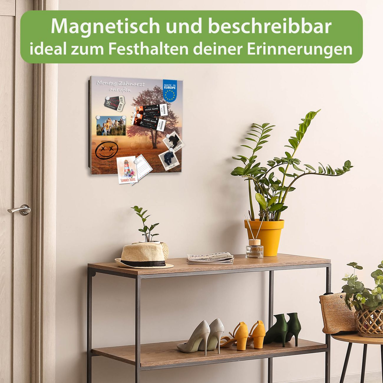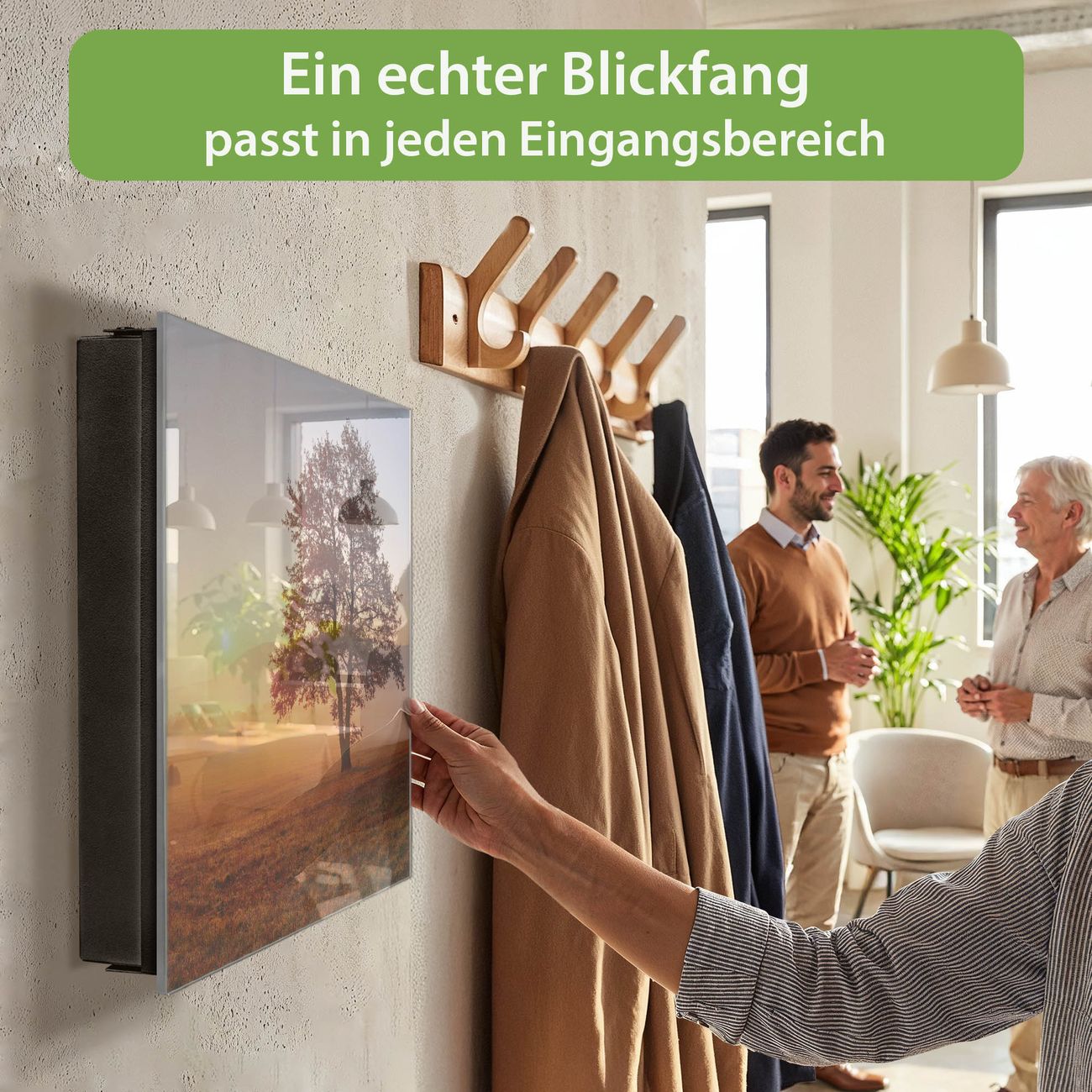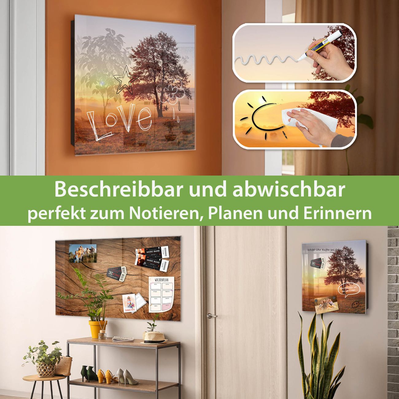 Bringe Ordnung und Eleganz in deinen Eingangsbereich mit dem banjado Schlüsselkasten Motiv Motiv Sonnenaufgang. Die moderne Schlüsselbox kombiniert funktionales Design mit hochwertiger Verarbeitung und wird so zu einem echten Hingucker in Flur, Büro oder Ferienwohnung. ✅ Stilvolle Schlüsselaufbewahrung mit Glasfront im Motiv Motiv Sonnenaufgang Der Design-Schlüsselkasten Motiv Motiv Sonnenaufgang bietet Platz für bis zu 50 Schlüssel, die auf 5 stabilen Reihen mit je 10 Haken übersichtlich verstaut werden. Mit seinen kompakten Maßen von 30 x 30 x 5 cm passt die Schlüsselbox perfekt auch in kleinere Räume. Der schwarz lackierte Stahlkorpus mit rechts angeschlagenem Türscharnier harmoniert mit der Glasfront und fügt sich nahtlos in jedes Wohnambiente ein. Ob als Schlüsselorganizer für Zuhause oder als praktische Lösung für Büros, Praxen und Gewerbe, der banjado Schlüsselkasten sorgt für Ordnung und Übersicht. Dank der magnetischen, mit Kreidestiften beschreibbaren Glasfront kannst du Notizen anheften oder Termine direkt auf der Oberfläche festhalten. Die Schlüsselbox Motiv Motiv Sonnenaufgang zur Wandmontage wird inklusive Befestigungsmaterial geliefert und ist schnell angebracht. So hast du deine Schlüssel jederzeit griffbereit und zugleich stilvoll verstaut. Mit diesem banjado Schlüsselkasten Motiv Motiv Sonnenaufgang kombinierst du praktische Aufbewahrung mit stilvollem Wohndesign. Ob privat oder geschäftlich, die Schlüsselbox sorgt für mehr Ordnung, Übersicht und ein wohnliches Ambiente.Vorteile im Überblick