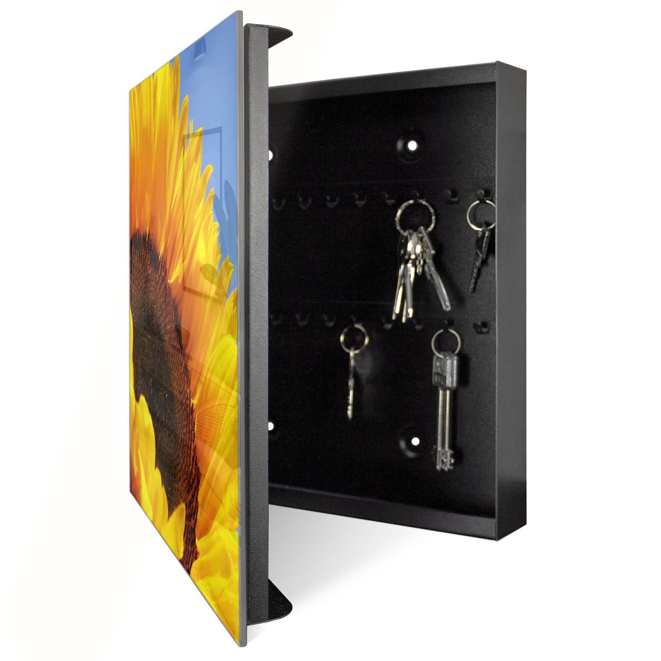 Bringe Ordnung und Eleganz in deinen Eingangsbereich mit dem banjado Schlüsselkasten Motiv Motiv Sonnenblume. Die moderne Schlüsselbox kombiniert funktionales Design mit hochwertiger Verarbeitung und wird so zu einem echten Hingucker in Flur, Büro oder Ferienwohnung. ✅ Stilvolle Schlüsselaufbewahrung mit Glasfront im Motiv Motiv Sonnenblume Der Design-Schlüsselkasten Motiv Motiv Sonnenblume bietet Platz für bis zu 50 Schlüssel, die auf 5 stabilen Reihen mit je 10 Haken übersichtlich verstaut werden. Mit seinen kompakten Maßen von 30 x 30 x 5 cm passt die Schlüsselbox perfekt auch in kleinere Räume. Der schwarz lackierte Stahlkorpus mit rechts angeschlagenem Türscharnier harmoniert mit der Glasfront und fügt sich nahtlos in jedes Wohnambiente ein. Ob als Schlüsselorganizer für Zuhause oder als praktische Lösung für Büros, Praxen und Gewerbe, der banjado Schlüsselkasten sorgt für Ordnung und Übersicht. Dank der magnetischen, mit Kreidestiften beschreibbaren Glasfront kannst du Notizen anheften oder Termine direkt auf der Oberfläche festhalten. Die Schlüsselbox Motiv Motiv Sonnenblume zur Wandmontage wird inklusive Befestigungsmaterial geliefert und ist schnell angebracht. So hast du deine Schlüssel jederzeit griffbereit und zugleich stilvoll verstaut. Mit diesem banjado Schlüsselkasten Motiv Motiv Sonnenblume kombinierst du praktische Aufbewahrung mit stilvollem Wohndesign. Ob privat oder geschäftlich, die Schlüsselbox sorgt für mehr Ordnung, Übersicht und ein wohnliches Ambiente.Vorteile im Überblick