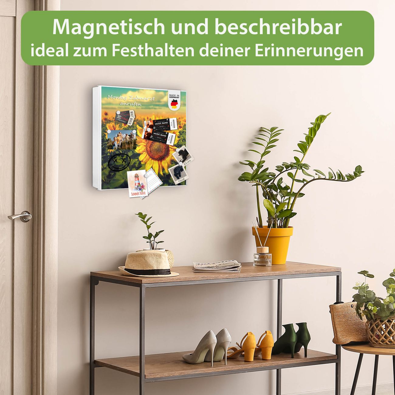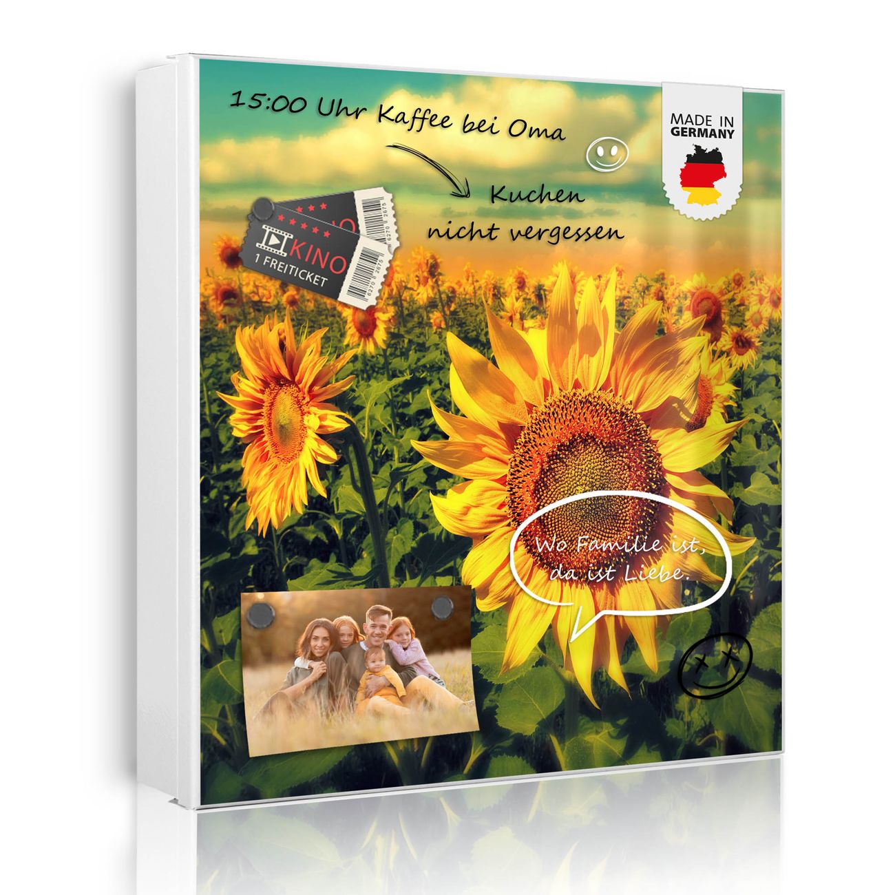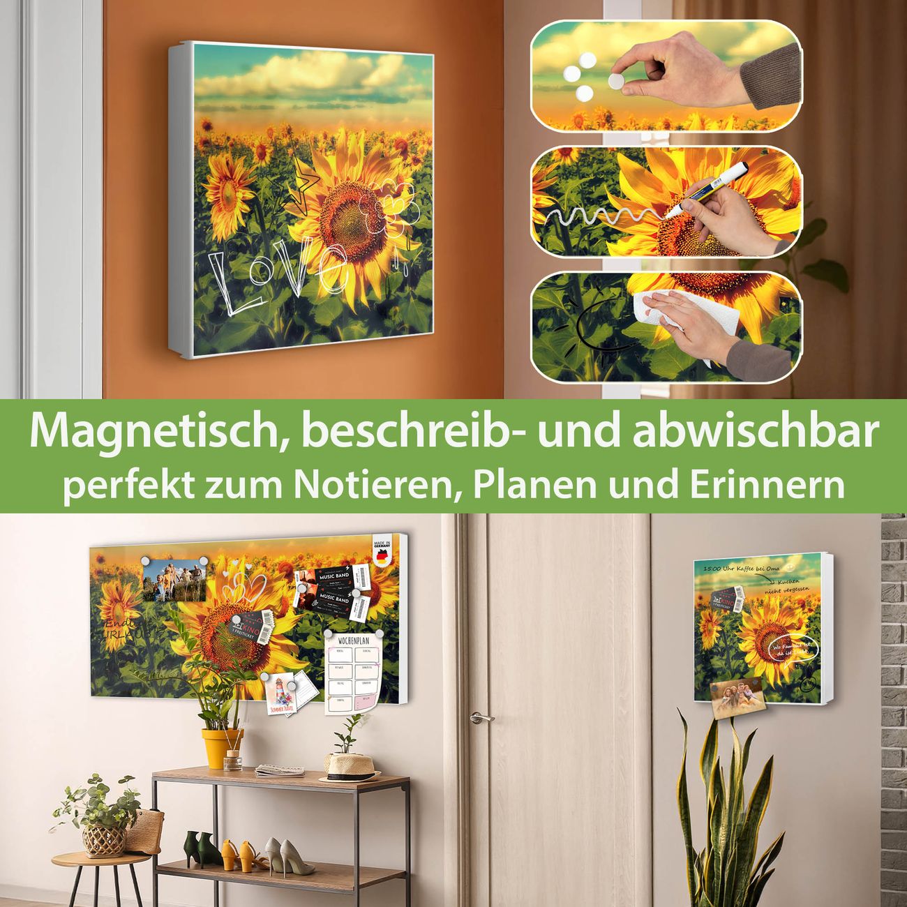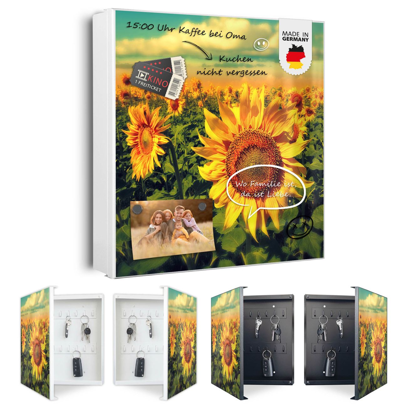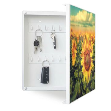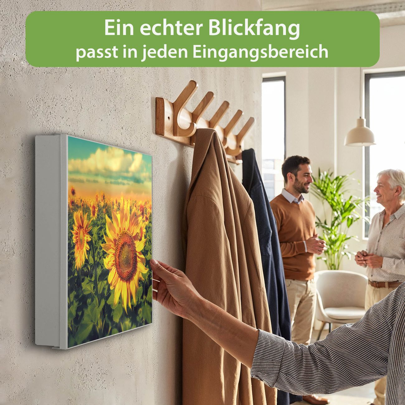 Bringe Ordnung und Eleganz in deinen Eingangsbereich mit dem banjado Schlüsselkasten Motiv Motiv Sonnenblumen. Die moderne Schlüsselbox kombiniert funktionales Design mit hochwertiger Verarbeitung und wird so zu einem echten Hingucker in Flur, Büro oder Ferienwohnung. ✅ Stilvolle Schlüsselaufbewahrung mit Motiv Motiv Sonnenblumen Der Design-Schlüsselkasten Motiv Motiv Sonnenblumen bietet Platz für bis zu 32 Schlüssel, die auf 4 stabilen Reihen mit je 8 Haken übersichtlich verstaut werden. Mit seinen kompakten Maßen von 30 x 30 x 5 cm passt die Schlüsselbox perfekt auch in kleinere Räume. Der weiß lackierte Stahlkorpus mit rechts angeschlagenem Türscharnier harmoniert mit gedruckten Folie auf der Front und fügt sich nahtlos in jedes Wohnambiente ein. Ob als Schlüsselorganizer für Zuhause oder als praktische Lösung für Büros, Praxen und Gewerbe, der banjado Schlüsselkasten sorgt für Ordnung und Übersicht. Dank der magnetischen, mit Kreidestiften beschreibbaren Folie auf der Front kannst du Notizen anheften oder Termine direkt auf der Oberfläche festhalten. Die Schlüsselbox Motiv Motiv Sonnenblumen zur Wandmontage wird inklusive Befestigungsmaterial geliefert und ist schnell angebracht. So hast du deine Schlüssel jederzeit griffbereit und zugleich stilvoll verstaut. Mit diesem banjado Schlüsselkasten Motiv Motiv Sonnenblumen kombinierst du praktische Aufbewahrung mit stilvollem Wohndesign. Ob privat oder geschäftlich, die Schlüsselbox sorgt für mehr Ordnung, Übersicht und ein wohnliches Ambiente.Vorteile im Überblick