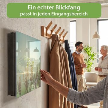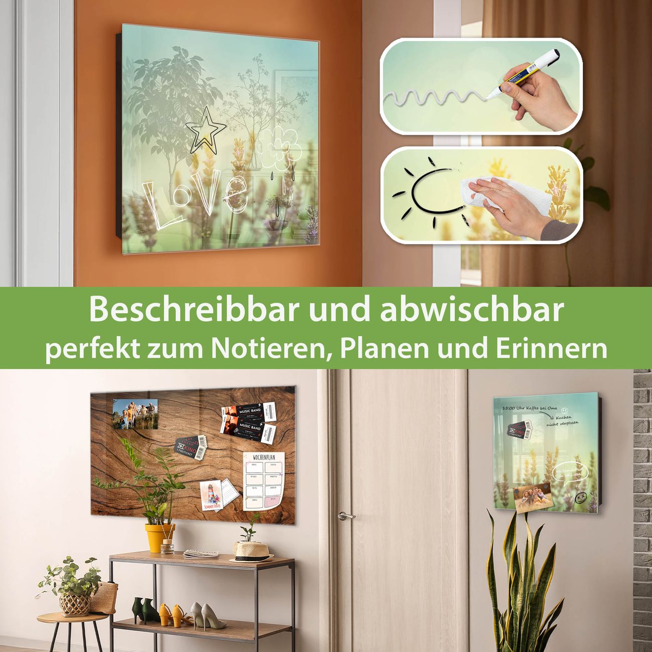 Bringe Ordnung und Eleganz in deinen Eingangsbereich mit dem banjado Schlüsselkasten Motiv Motiv Sonnenlavendel. Die moderne Schlüsselbox kombiniert funktionales Design mit hochwertiger Verarbeitung und wird so zu einem echten Hingucker in Flur, Büro oder Ferienwohnung. ✅ Stilvolle Schlüsselaufbewahrung mit Glasfront im Motiv Motiv Sonnenlavendel Der Design-Schlüsselkasten Motiv Motiv Sonnenlavendel bietet Platz für bis zu 50 Schlüssel, die auf 5 stabilen Reihen mit je 10 Haken übersichtlich verstaut werden. Mit seinen kompakten Maßen von 30 x 30 x 5 cm passt die Schlüsselbox perfekt auch in kleinere Räume. Der schwarz lackierte Stahlkorpus mit rechts angeschlagenem Türscharnier harmoniert mit der Glasfront und fügt sich nahtlos in jedes Wohnambiente ein. Ob als Schlüsselorganizer für Zuhause oder als praktische Lösung für Büros, Praxen und Gewerbe, der banjado Schlüsselkasten sorgt für Ordnung und Übersicht. Dank der magnetischen, mit Kreidestiften beschreibbaren Glasfront kannst du Notizen anheften oder Termine direkt auf der Oberfläche festhalten. Die Schlüsselbox Motiv Motiv Sonnenlavendel zur Wandmontage wird inklusive Befestigungsmaterial geliefert und ist schnell angebracht. So hast du deine Schlüssel jederzeit griffbereit und zugleich stilvoll verstaut. Mit diesem banjado Schlüsselkasten Motiv Motiv Sonnenlavendel kombinierst du praktische Aufbewahrung mit stilvollem Wohndesign. Ob privat oder geschäftlich, die Schlüsselbox sorgt für mehr Ordnung, Übersicht und ein wohnliches Ambiente.Vorteile im Überblick