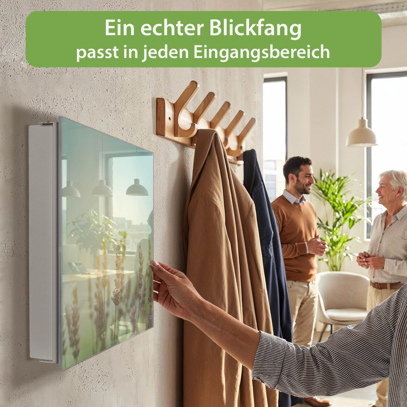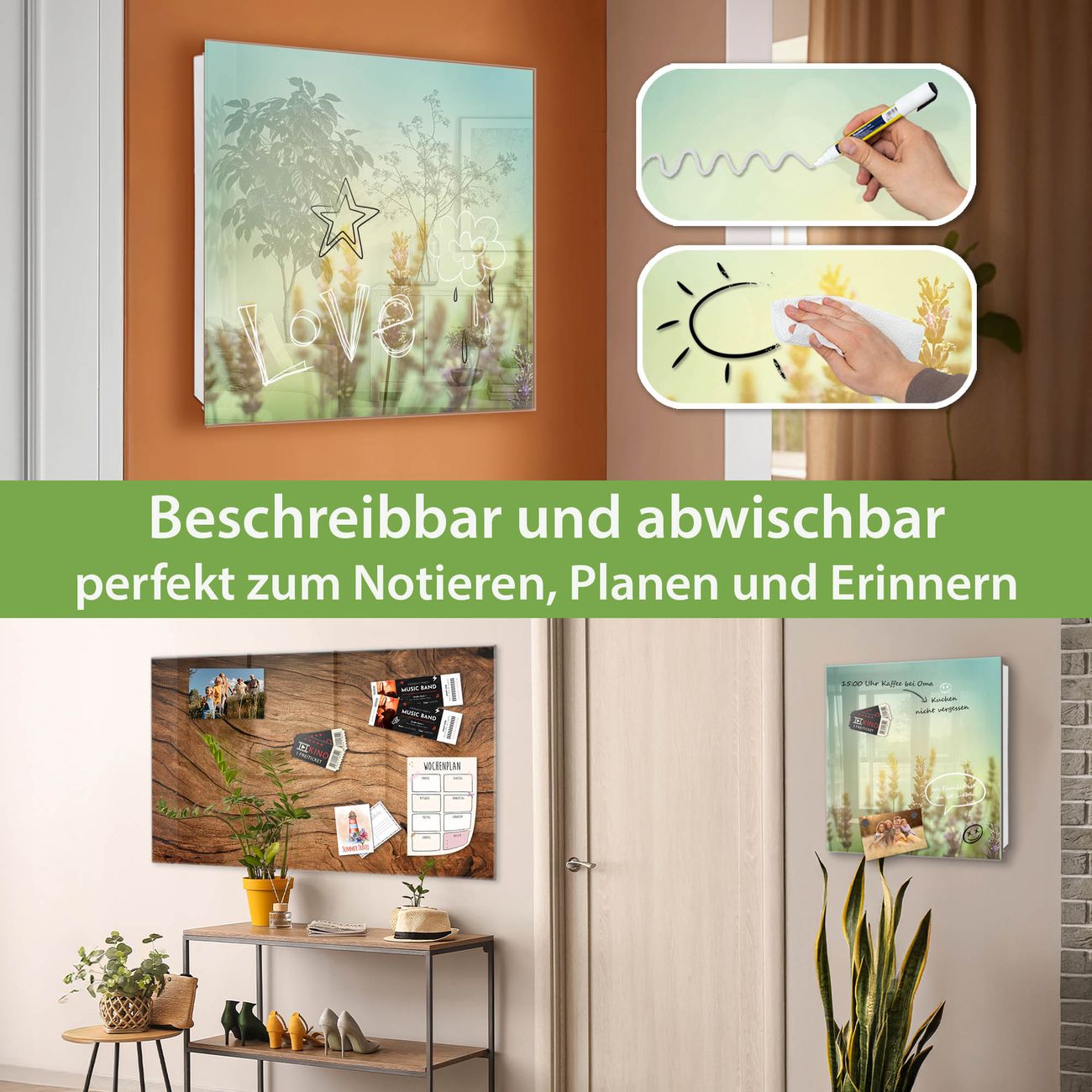 Bringe Ordnung und Eleganz in deinen Eingangsbereich mit dem banjado Schlüsselkasten Motiv Motiv Sonnenlavendel. Die moderne Schlüsselbox kombiniert funktionales Design mit hochwertiger Verarbeitung und wird so zu einem echten Hingucker in Flur, Büro oder Ferienwohnung. ✅ Stilvolle Schlüsselaufbewahrung mit Glasfront im Motiv Motiv Sonnenlavendel Der Design-Schlüsselkasten Motiv Motiv Sonnenlavendel bietet Platz für bis zu 50 Schlüssel, die auf 5 stabilen Reihen mit je 10 Haken übersichtlich verstaut werden. Mit seinen kompakten Maßen von 30 x 30 x 5 cm passt die Schlüsselbox perfekt auch in kleinere Räume. Der weiß lackierte Stahlkorpus mit rechts angeschlagenem Türscharnier harmoniert mit der Glasfront und fügt sich nahtlos in jedes Wohnambiente ein. Ob als Schlüsselorganizer für Zuhause oder als praktische Lösung für Büros, Praxen und Gewerbe, der banjado Schlüsselkasten sorgt für Ordnung und Übersicht. Dank der magnetischen, mit Kreidestiften beschreibbaren Glasfront kannst du Notizen anheften oder Termine direkt auf der Oberfläche festhalten. Die Schlüsselbox Motiv Motiv Sonnenlavendel zur Wandmontage wird inklusive Befestigungsmaterial geliefert und ist schnell angebracht. So hast du deine Schlüssel jederzeit griffbereit und zugleich stilvoll verstaut. Mit diesem banjado Schlüsselkasten Motiv Motiv Sonnenlavendel kombinierst du praktische Aufbewahrung mit stilvollem Wohndesign. Ob privat oder geschäftlich, die Schlüsselbox sorgt für mehr Ordnung, Übersicht und ein wohnliches Ambiente.Vorteile im Überblick