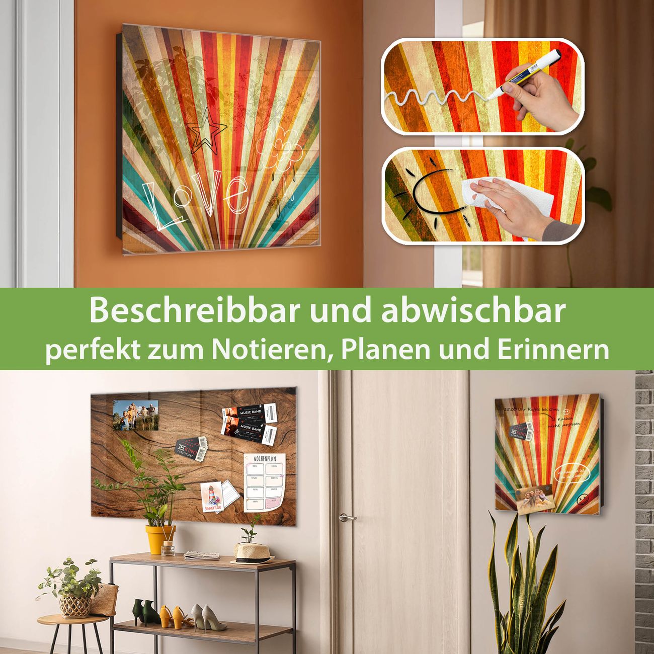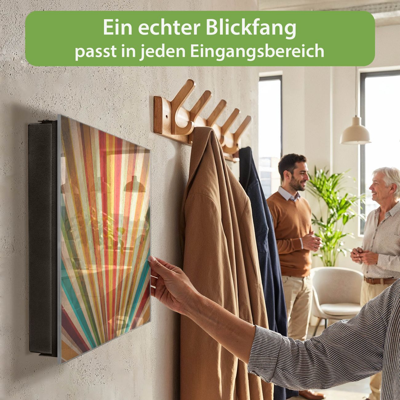 Bringe Ordnung und Eleganz in deinen Eingangsbereich mit dem banjado Schlüsselkasten Motiv Motiv Sonnenuntergang Abstrakt. Die moderne Schlüsselbox kombiniert funktionales Design mit hochwertiger Verarbeitung und wird so zu einem echten Hingucker in Flur, Büro oder Ferienwohnung. ✅ Stilvolle Schlüsselaufbewahrung mit Glasfront im Motiv Motiv Sonnenuntergang Abstrakt Der Design-Schlüsselkasten Motiv Motiv Sonnenuntergang Abstrakt bietet Platz für bis zu 50 Schlüssel, die auf 5 stabilen Reihen mit je 10 Haken übersichtlich verstaut werden. Mit seinen kompakten Maßen von 30 x 30 x 5 cm passt die Schlüsselbox perfekt auch in kleinere Räume. Der schwarz lackierte Stahlkorpus mit rechts angeschlagenem Türscharnier harmoniert mit der Glasfront und fügt sich nahtlos in jedes Wohnambiente ein. Ob als Schlüsselorganizer für Zuhause oder als praktische Lösung für Büros, Praxen und Gewerbe, der banjado Schlüsselkasten sorgt für Ordnung und Übersicht. Dank der magnetischen, mit Kreidestiften beschreibbaren Glasfront kannst du Notizen anheften oder Termine direkt auf der Oberfläche festhalten. Die Schlüsselbox Motiv Motiv Sonnenuntergang Abstrakt zur Wandmontage wird inklusive Befestigungsmaterial geliefert und ist schnell angebracht. So hast du deine Schlüssel jederzeit griffbereit und zugleich stilvoll verstaut. Mit diesem banjado Schlüsselkasten Motiv Motiv Sonnenuntergang Abstrakt kombinierst du praktische Aufbewahrung mit stilvollem Wohndesign. Ob privat oder geschäftlich, die Schlüsselbox sorgt für mehr Ordnung, Übersicht und ein wohnliches Ambiente.Vorteile im Überblick