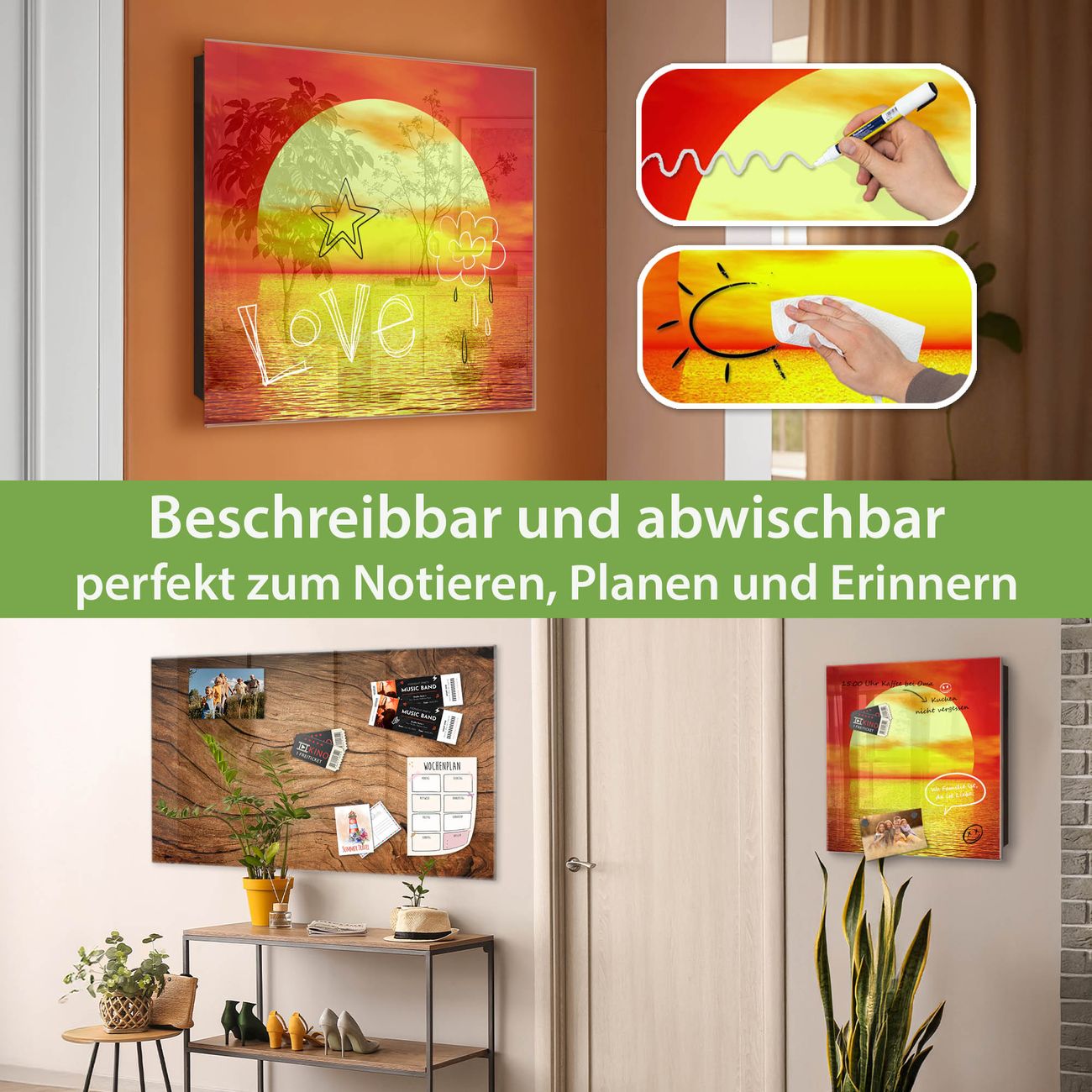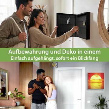 Bringe Ordnung und Eleganz in deinen Eingangsbereich mit dem banjado Schlüsselkasten Motiv Motiv Sonnenuntergang. Die moderne Schlüsselbox kombiniert funktionales Design mit hochwertiger Verarbeitung und wird so zu einem echten Hingucker in Flur, Büro oder Ferienwohnung. ✅ Stilvolle Schlüsselaufbewahrung mit Glasfront im Motiv Motiv Sonnenuntergang Der Design-Schlüsselkasten Motiv Motiv Sonnenuntergang bietet Platz für bis zu 50 Schlüssel, die auf 5 stabilen Reihen mit je 10 Haken übersichtlich verstaut werden. Mit seinen kompakten Maßen von 30 x 30 x 5 cm passt die Schlüsselbox perfekt auch in kleinere Räume. Der schwarz lackierte Stahlkorpus mit rechts angeschlagenem Türscharnier harmoniert mit der Glasfront und fügt sich nahtlos in jedes Wohnambiente ein. Ob als Schlüsselorganizer für Zuhause oder als praktische Lösung für Büros, Praxen und Gewerbe, der banjado Schlüsselkasten sorgt für Ordnung und Übersicht. Dank der magnetischen, mit Kreidestiften beschreibbaren Glasfront kannst du Notizen anheften oder Termine direkt auf der Oberfläche festhalten. Die Schlüsselbox Motiv Motiv Sonnenuntergang zur Wandmontage wird inklusive Befestigungsmaterial geliefert und ist schnell angebracht. So hast du deine Schlüssel jederzeit griffbereit und zugleich stilvoll verstaut. Mit diesem banjado Schlüsselkasten Motiv Motiv Sonnenuntergang kombinierst du praktische Aufbewahrung mit stilvollem Wohndesign. Ob privat oder geschäftlich, die Schlüsselbox sorgt für mehr Ordnung, Übersicht und ein wohnliches Ambiente.Vorteile im Überblick