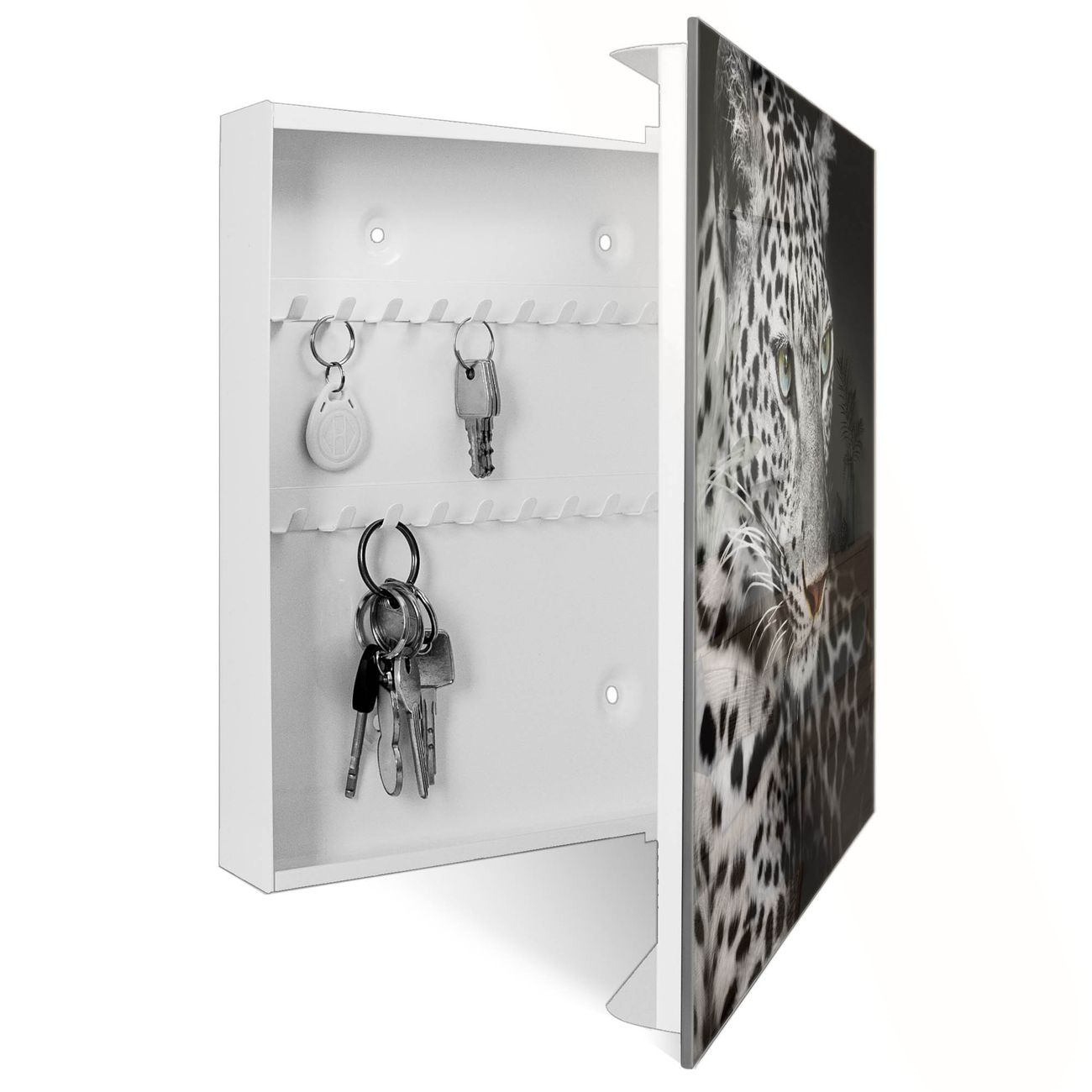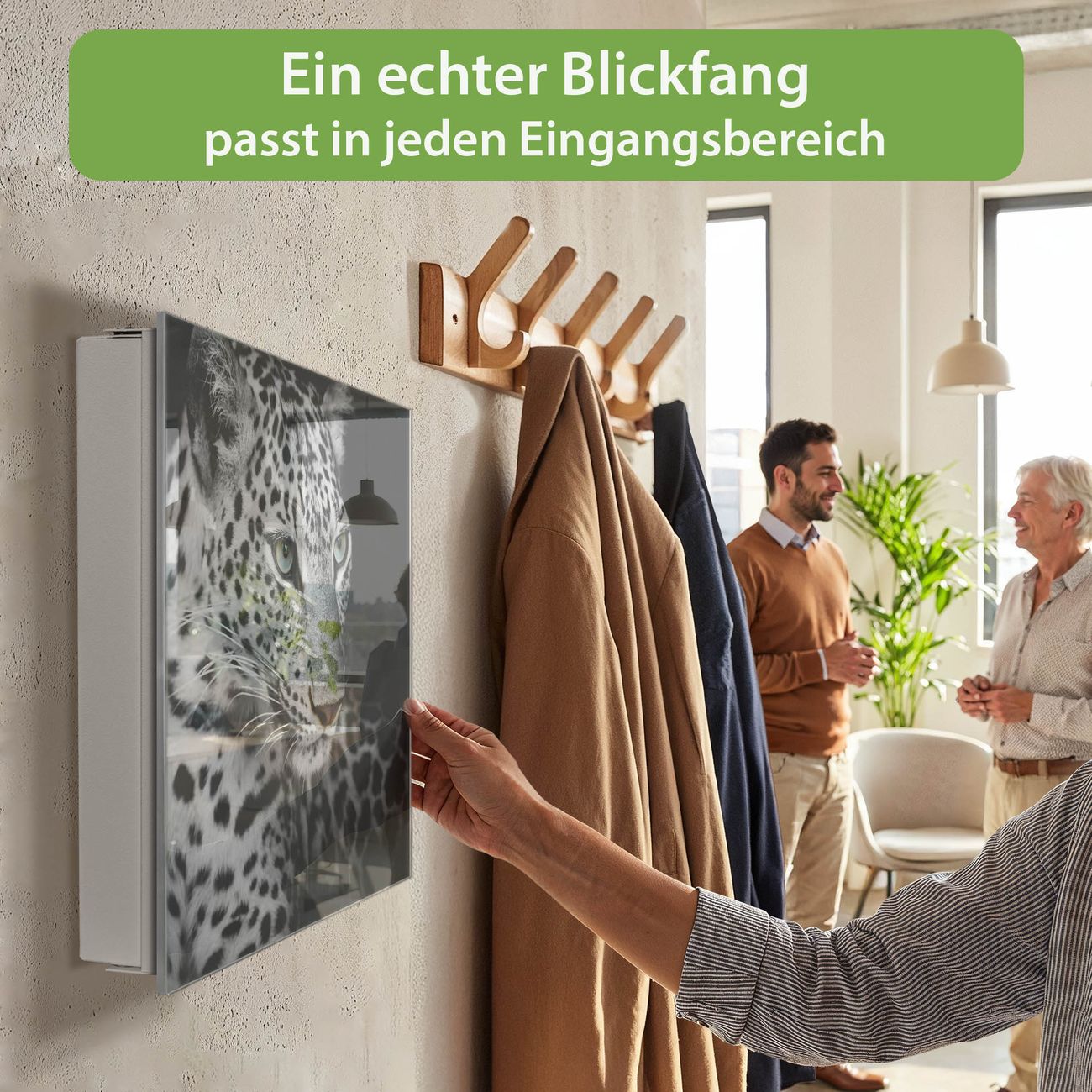 Bringe Ordnung und Eleganz in deinen Eingangsbereich mit dem banjado Schlüsselkasten Motiv Motiv Sophie. Die moderne Schlüsselbox kombiniert funktionales Design mit hochwertiger Verarbeitung und wird so zu einem echten Hingucker in Flur, Büro oder Ferienwohnung. ✅ Stilvolle Schlüsselaufbewahrung mit Glasfront im Motiv Motiv Sophie Der Design-Schlüsselkasten Motiv Motiv Sophie bietet Platz für bis zu 50 Schlüssel, die auf 5 stabilen Reihen mit je 10 Haken übersichtlich verstaut werden. Mit seinen kompakten Maßen von 30 x 30 x 5 cm passt die Schlüsselbox perfekt auch in kleinere Räume. Der weiß lackierte Stahlkorpus mit rechts angeschlagenem Türscharnier harmoniert mit der Glasfront und fügt sich nahtlos in jedes Wohnambiente ein. Ob als Schlüsselorganizer für Zuhause oder als praktische Lösung für Büros, Praxen und Gewerbe, der banjado Schlüsselkasten sorgt für Ordnung und Übersicht. Dank der magnetischen, mit Kreidestiften beschreibbaren Glasfront kannst du Notizen anheften oder Termine direkt auf der Oberfläche festhalten. Die Schlüsselbox Motiv Motiv Sophie zur Wandmontage wird inklusive Befestigungsmaterial geliefert und ist schnell angebracht. So hast du deine Schlüssel jederzeit griffbereit und zugleich stilvoll verstaut. Mit diesem banjado Schlüsselkasten Motiv Motiv Sophie kombinierst du praktische Aufbewahrung mit stilvollem Wohndesign. Ob privat oder geschäftlich, die Schlüsselbox sorgt für mehr Ordnung, Übersicht und ein wohnliches Ambiente.Vorteile im Überblick