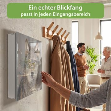Bringe Ordnung und Eleganz in deinen Eingangsbereich mit dem banjado Schlüsselkasten Motiv Motiv Soraya. Die moderne Schlüsselbox kombiniert funktionales Design mit hochwertiger Verarbeitung und wird so zu einem echten Hingucker in Flur, Büro oder Ferienwohnung. ✅ Stilvolle Schlüsselaufbewahrung mit Glasfront im Motiv Motiv Soraya Der Design-Schlüsselkasten Motiv Motiv Soraya bietet Platz für bis zu 50 Schlüssel, die auf 5 stabilen Reihen mit je 10 Haken übersichtlich verstaut werden. Mit seinen kompakten Maßen von 30 x 30 x 5 cm passt die Schlüsselbox perfekt auch in kleinere Räume. Der weiß lackierte Stahlkorpus mit rechts angeschlagenem Türscharnier harmoniert mit der Glasfront und fügt sich nahtlos in jedes Wohnambiente ein. Ob als Schlüsselorganizer für Zuhause oder als praktische Lösung für Büros, Praxen und Gewerbe, der banjado Schlüsselkasten sorgt für Ordnung und Übersicht. Dank der magnetischen, mit Kreidestiften beschreibbaren Glasfront kannst du Notizen anheften oder Termine direkt auf der Oberfläche festhalten. Die Schlüsselbox Motiv Motiv Soraya zur Wandmontage wird inklusive Befestigungsmaterial geliefert und ist schnell angebracht. So hast du deine Schlüssel jederzeit griffbereit und zugleich stilvoll verstaut. Mit diesem banjado Schlüsselkasten Motiv Motiv Soraya kombinierst du praktische Aufbewahrung mit stilvollem Wohndesign. Ob privat oder geschäftlich, die Schlüsselbox sorgt für mehr Ordnung, Übersicht und ein wohnliches Ambiente.Vorteile im Überblick