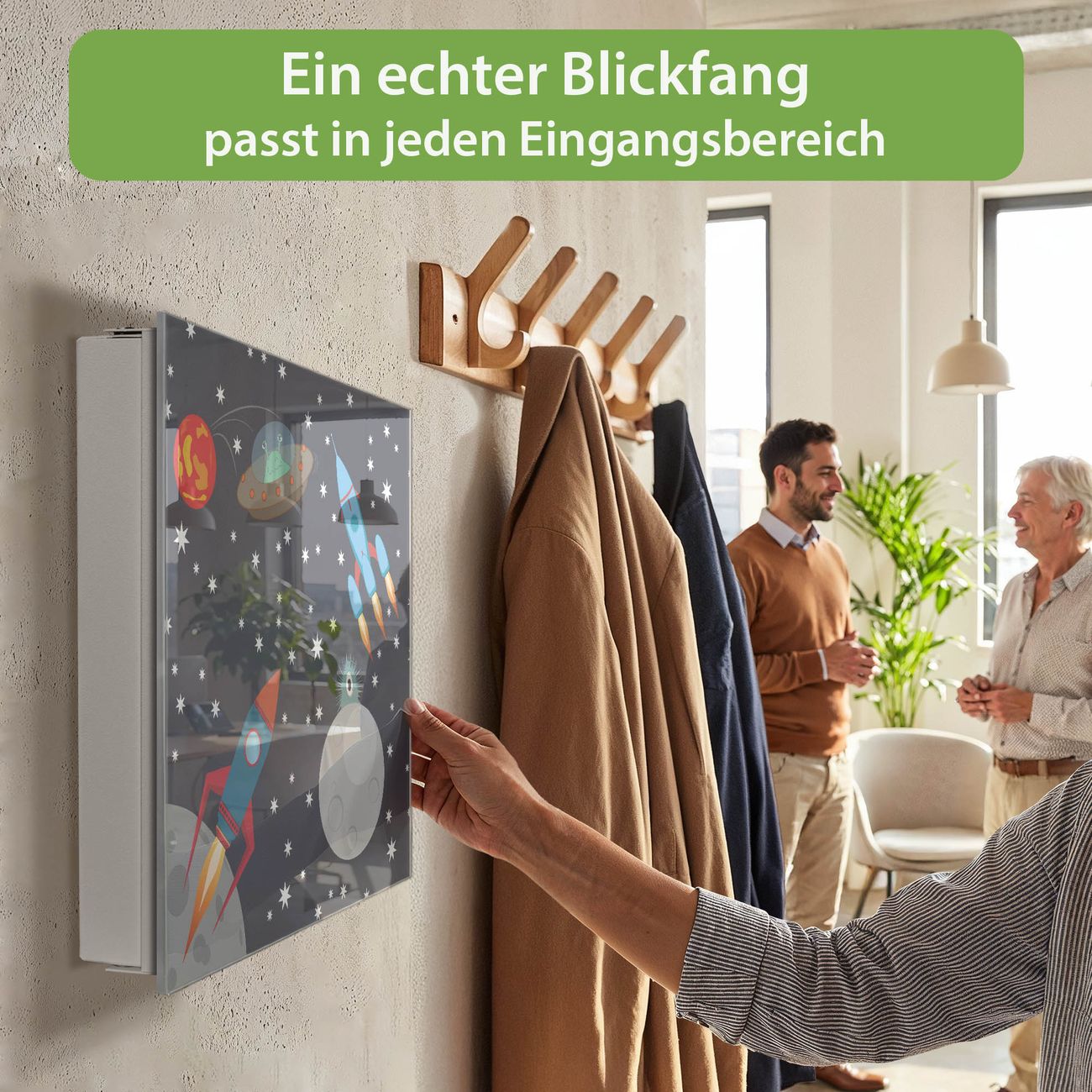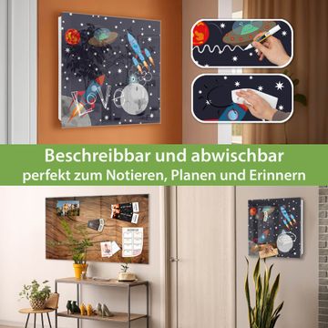 Bringe Ordnung und Eleganz in deinen Eingangsbereich mit dem banjado Schlüsselkasten Motiv Motiv Space Traffic. Die moderne Schlüsselbox kombiniert funktionales Design mit hochwertiger Verarbeitung und wird so zu einem echten Hingucker in Flur, Büro oder Ferienwohnung. ✅ Stilvolle Schlüsselaufbewahrung mit Glasfront im Motiv Motiv Space Traffic Der Design-Schlüsselkasten Motiv Motiv Space Traffic bietet Platz für bis zu 50 Schlüssel, die auf 5 stabilen Reihen mit je 10 Haken übersichtlich verstaut werden. Mit seinen kompakten Maßen von 30 x 30 x 5 cm passt die Schlüsselbox perfekt auch in kleinere Räume. Der weiß lackierte Stahlkorpus mit rechts angeschlagenem Türscharnier harmoniert mit der Glasfront und fügt sich nahtlos in jedes Wohnambiente ein. Ob als Schlüsselorganizer für Zuhause oder als praktische Lösung für Büros, Praxen und Gewerbe, der banjado Schlüsselkasten sorgt für Ordnung und Übersicht. Dank der magnetischen, mit Kreidestiften beschreibbaren Glasfront kannst du Notizen anheften oder Termine direkt auf der Oberfläche festhalten. Die Schlüsselbox Motiv Motiv Space Traffic zur Wandmontage wird inklusive Befestigungsmaterial geliefert und ist schnell angebracht. So hast du deine Schlüssel jederzeit griffbereit und zugleich stilvoll verstaut. Mit diesem banjado Schlüsselkasten Motiv Motiv Space Traffic kombinierst du praktische Aufbewahrung mit stilvollem Wohndesign. Ob privat oder geschäftlich, die Schlüsselbox sorgt für mehr Ordnung, Übersicht und ein wohnliches Ambiente.Vorteile im Überblick
